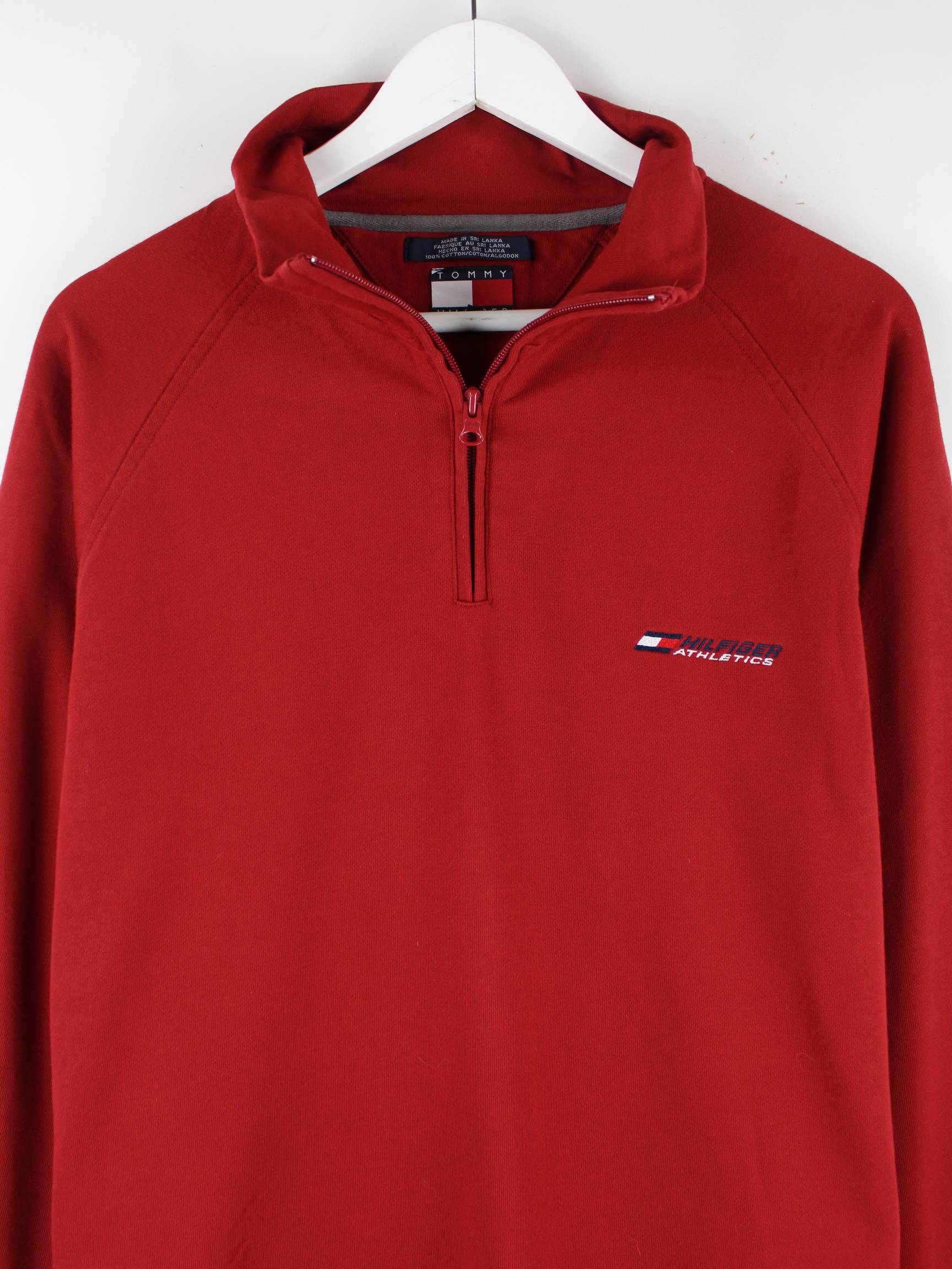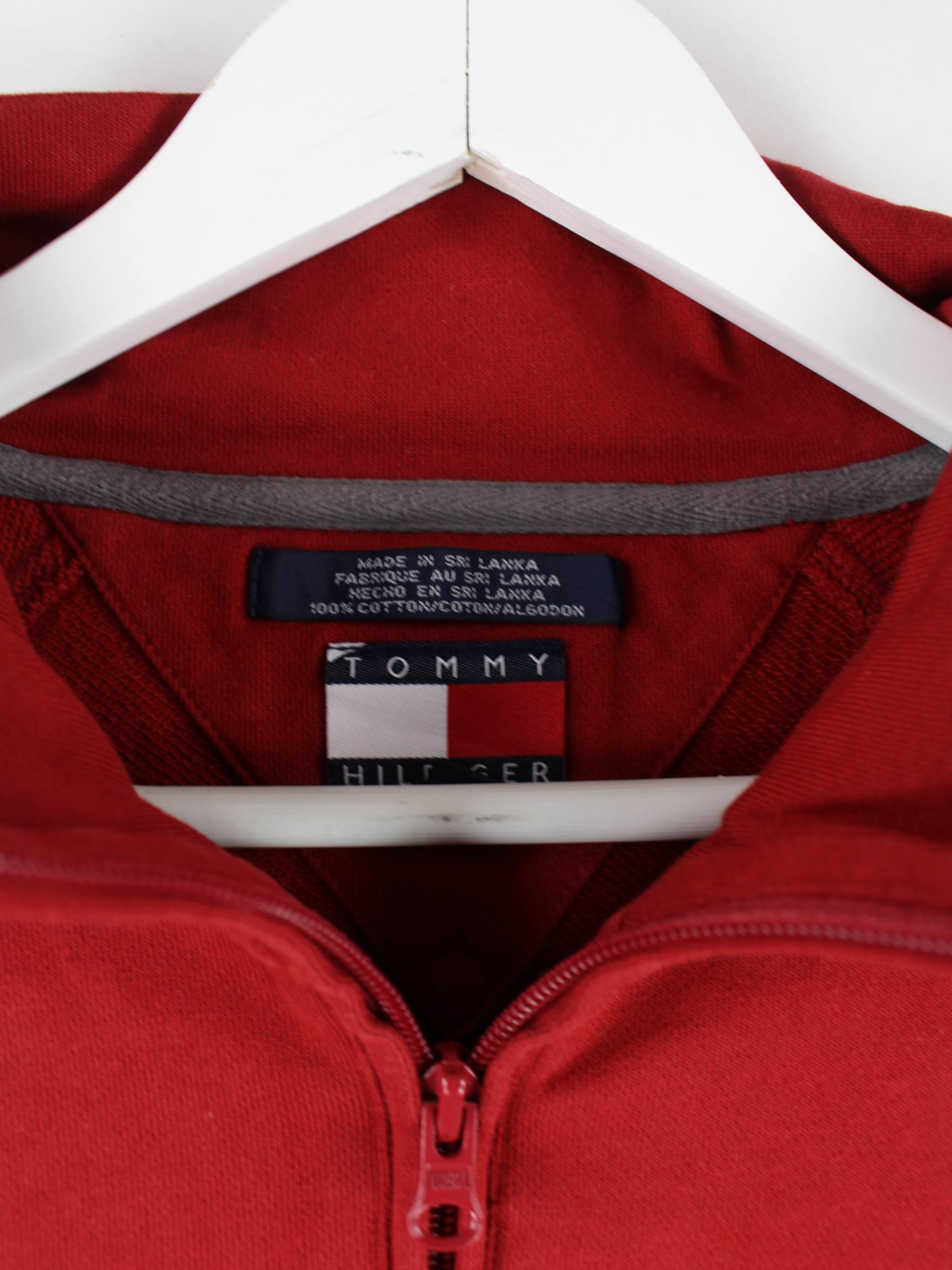 Sweater aus dem Hause Tommy Hilfiger mit kurzem Reißverschluß in Größe XL aus den 90'ern. Er ist aus einer Baumwollmischung und in Rot im Angebot.