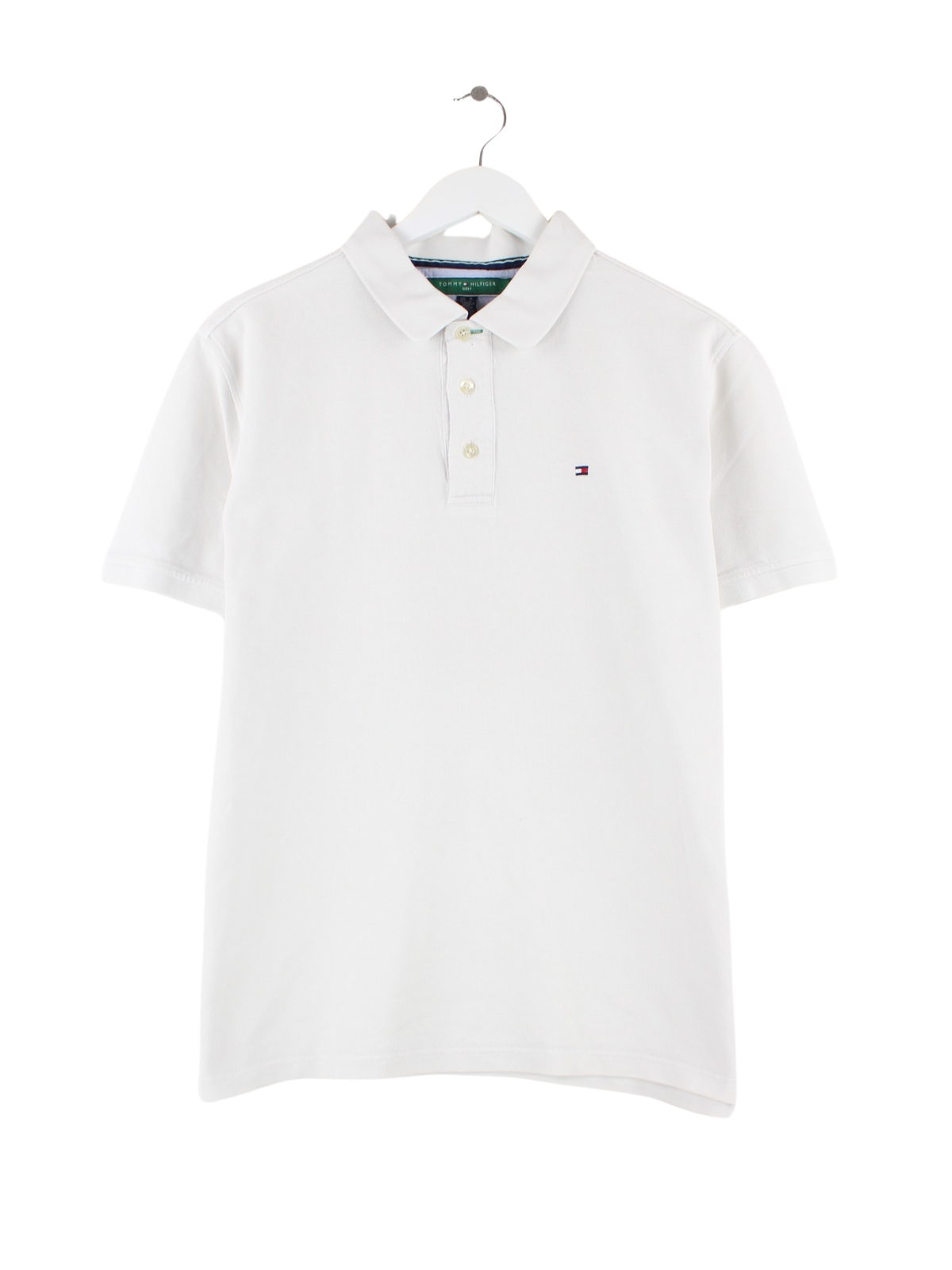 Weißes Poloshirt vom Label Tommy Hilfiger in Größe M. Es ist aus Baumwolle gemacht und in gutem Zustand vorrätig.