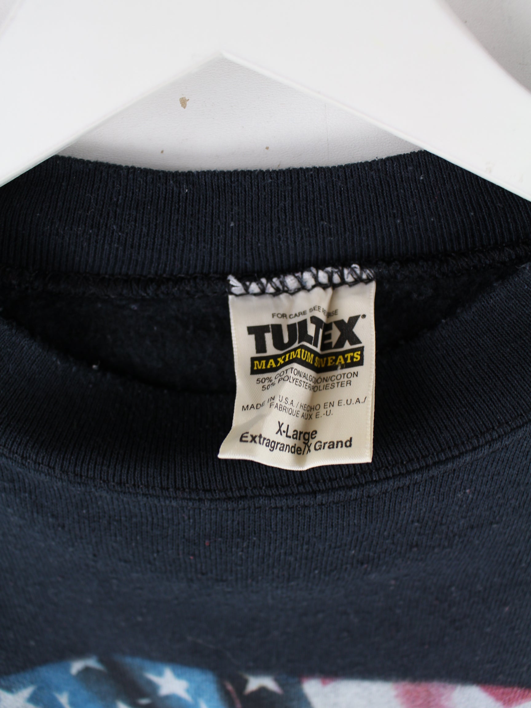 Schwarzer Sweater aus dem Hause Tultex aus den 90'ern in Größe XL. Er ist aus einer Baumwollmischung produziert und in sehr gutem Zustand bei uns zu bekommen. Mit seltenem America Print.