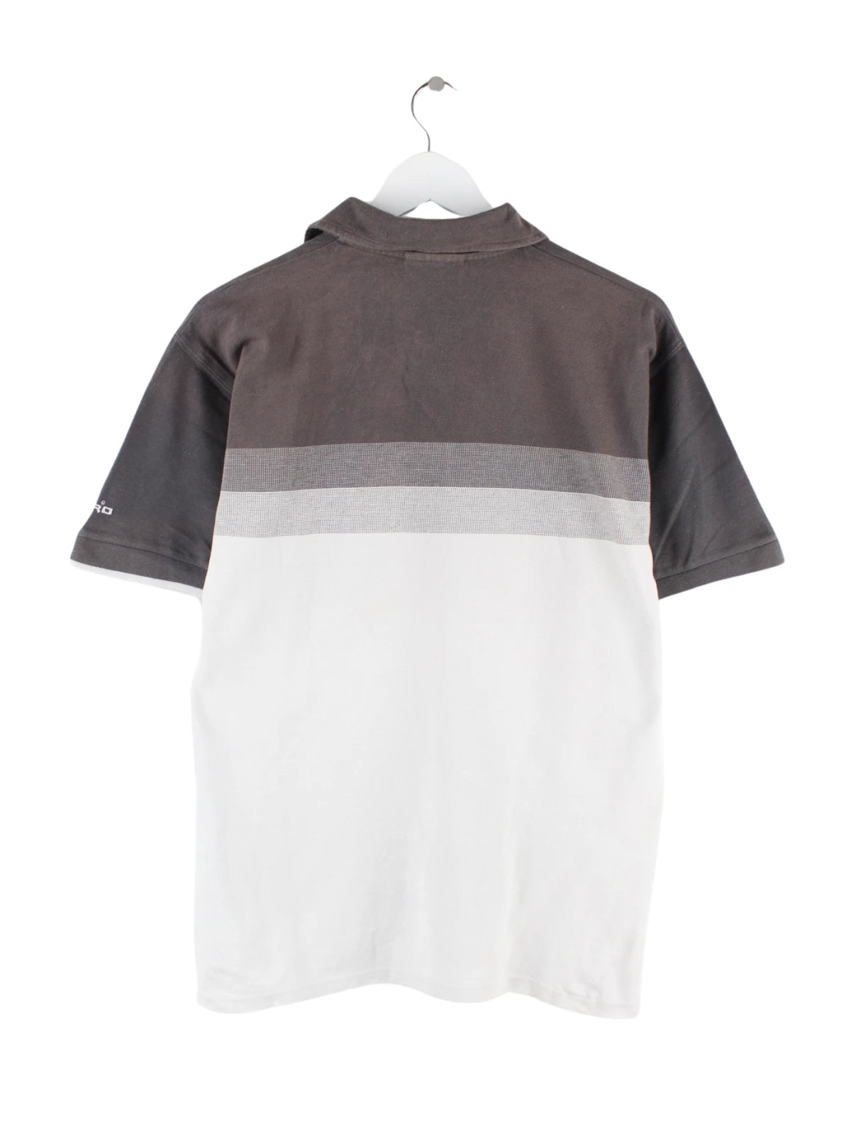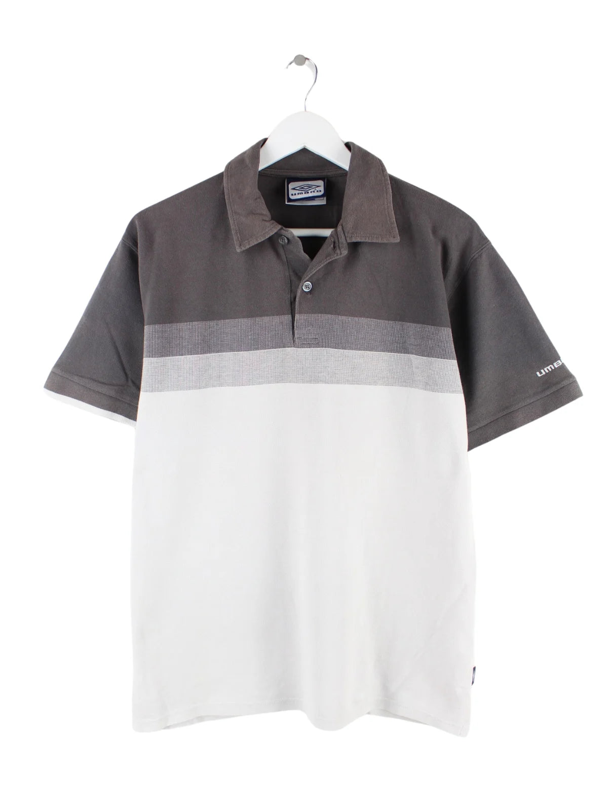 Graues Poloshirt vom Label Umbro aus den 90'ern in Größe M. Es ist aus Baumwolle gefertigt und in gutem Zustand im Bestand.