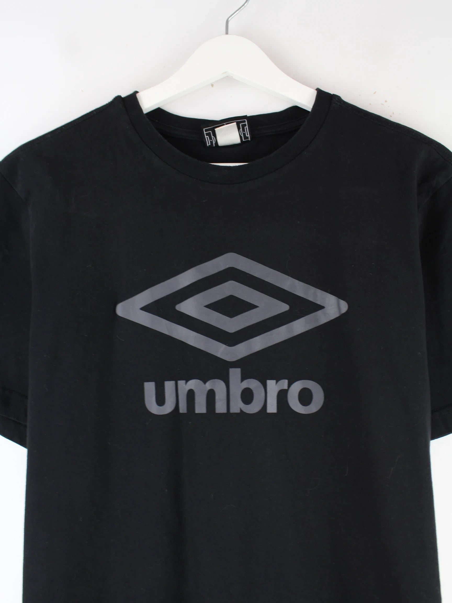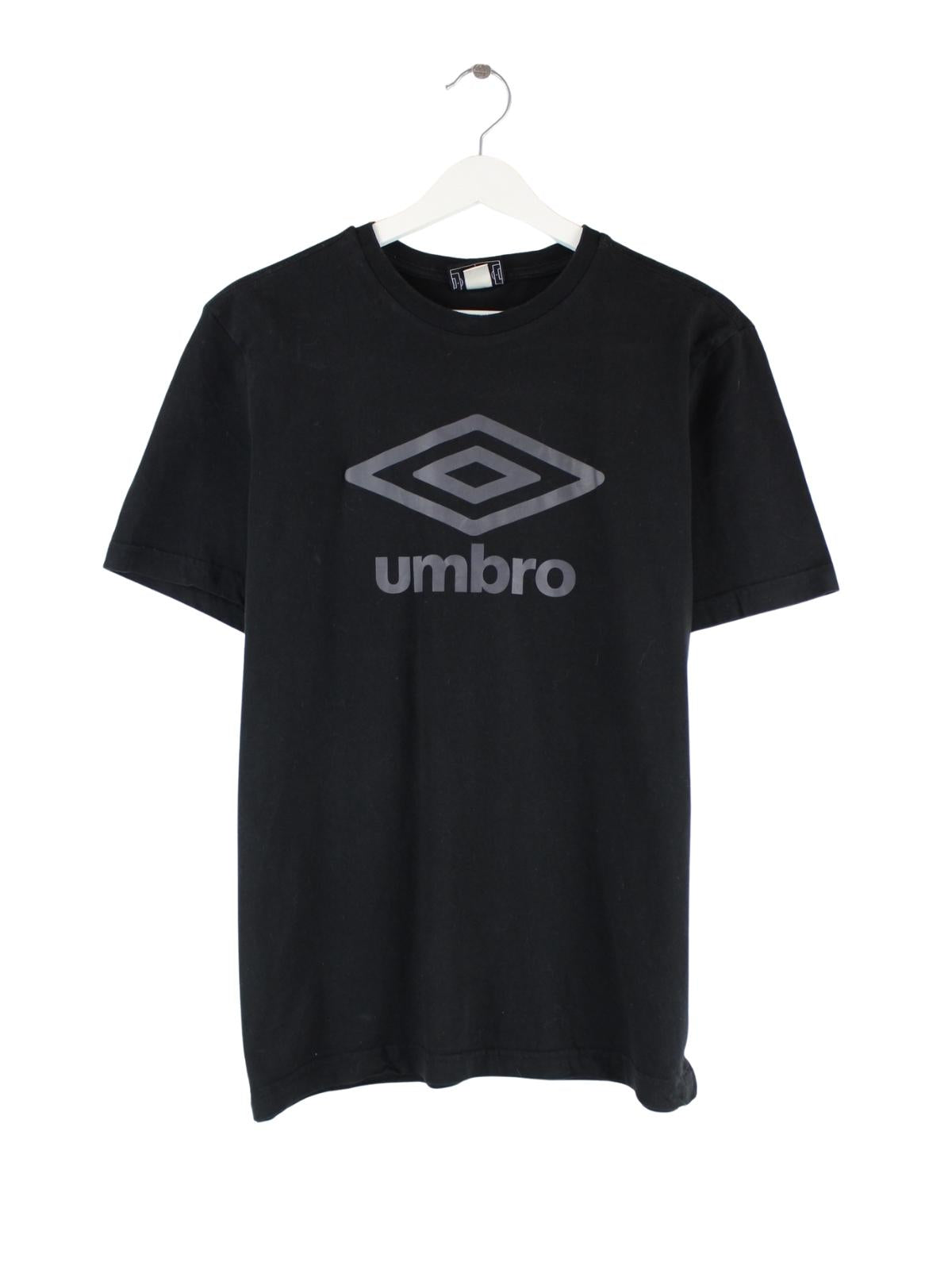 Schwarzes T-Shirt der Brand Umbro in Größe M. Es ist aus Baumwolle und in sehr gutem Zustand bei uns vorrätig. Mit tollem Logo Print.