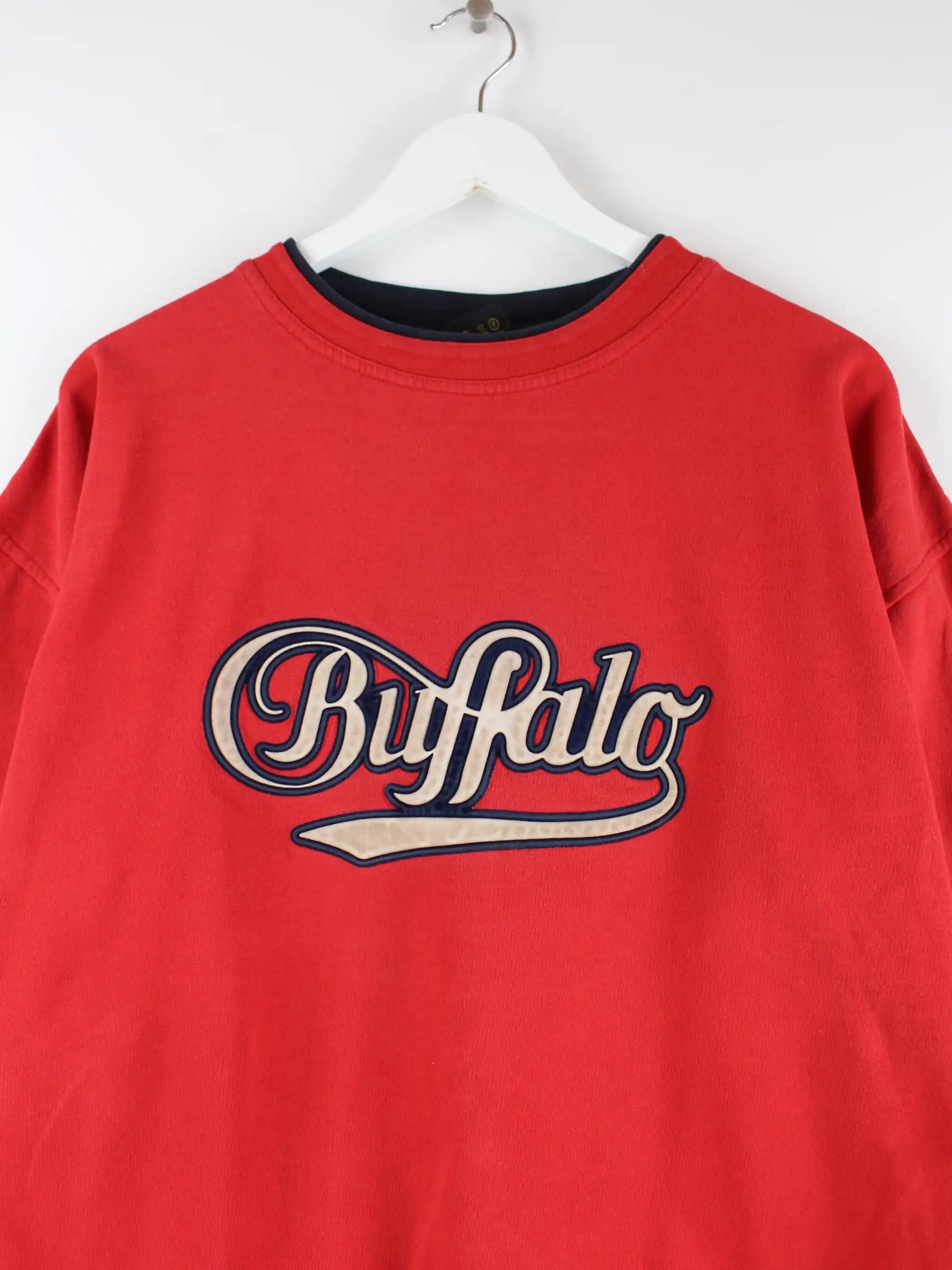 Vintage Sweater in Größe XXL. Er ist aus einer Baumwollmischung und in Rot lieferbar. Mit tollem Bufallo Print.