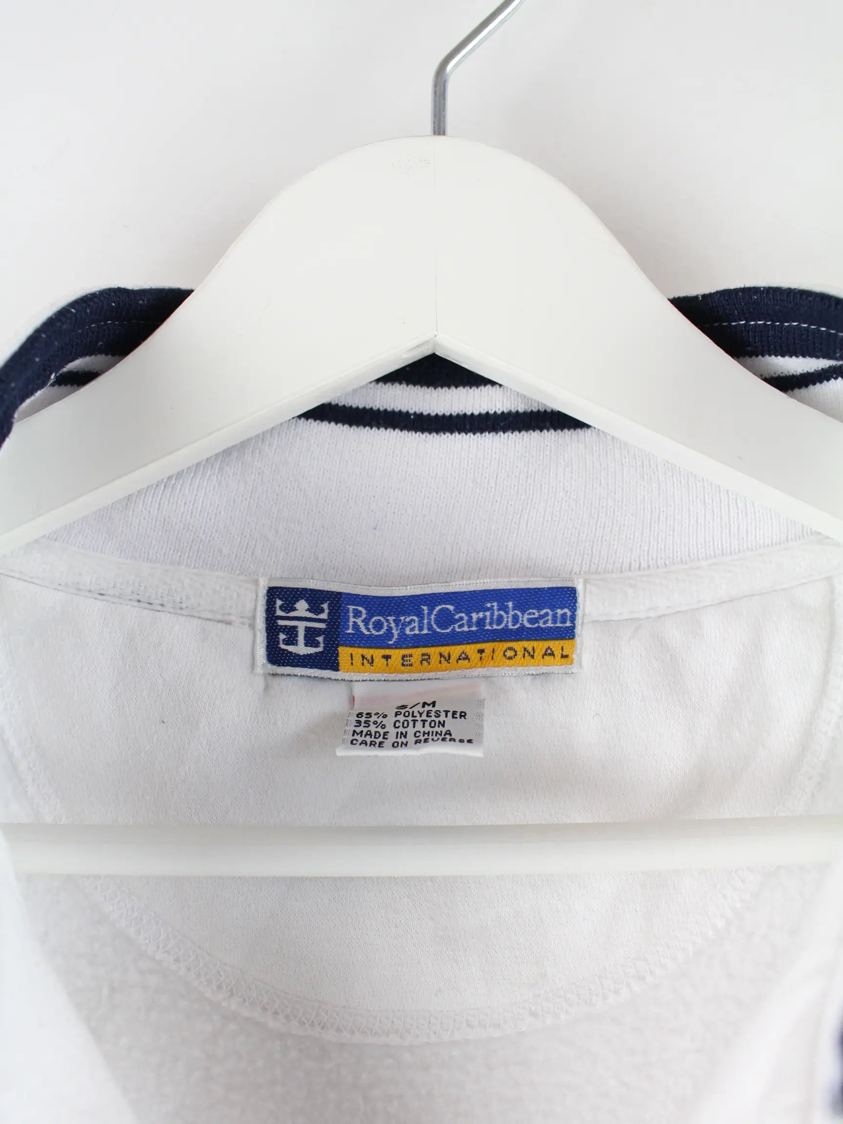 Vintage Sweater mit Stickereien und kurzem Reißverschluß in Größe M. Er ist aus einer Baumwollmischung und in Weiß in Stock.