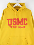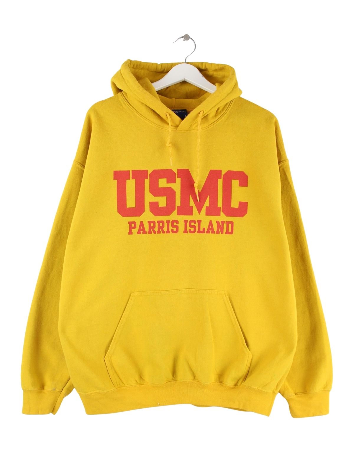 Vintage Hoodie in Größe L. Er ist aus einer Baumwollmischung angefertigt und in Gelb lieferbar. Mit schickem USMC Print.