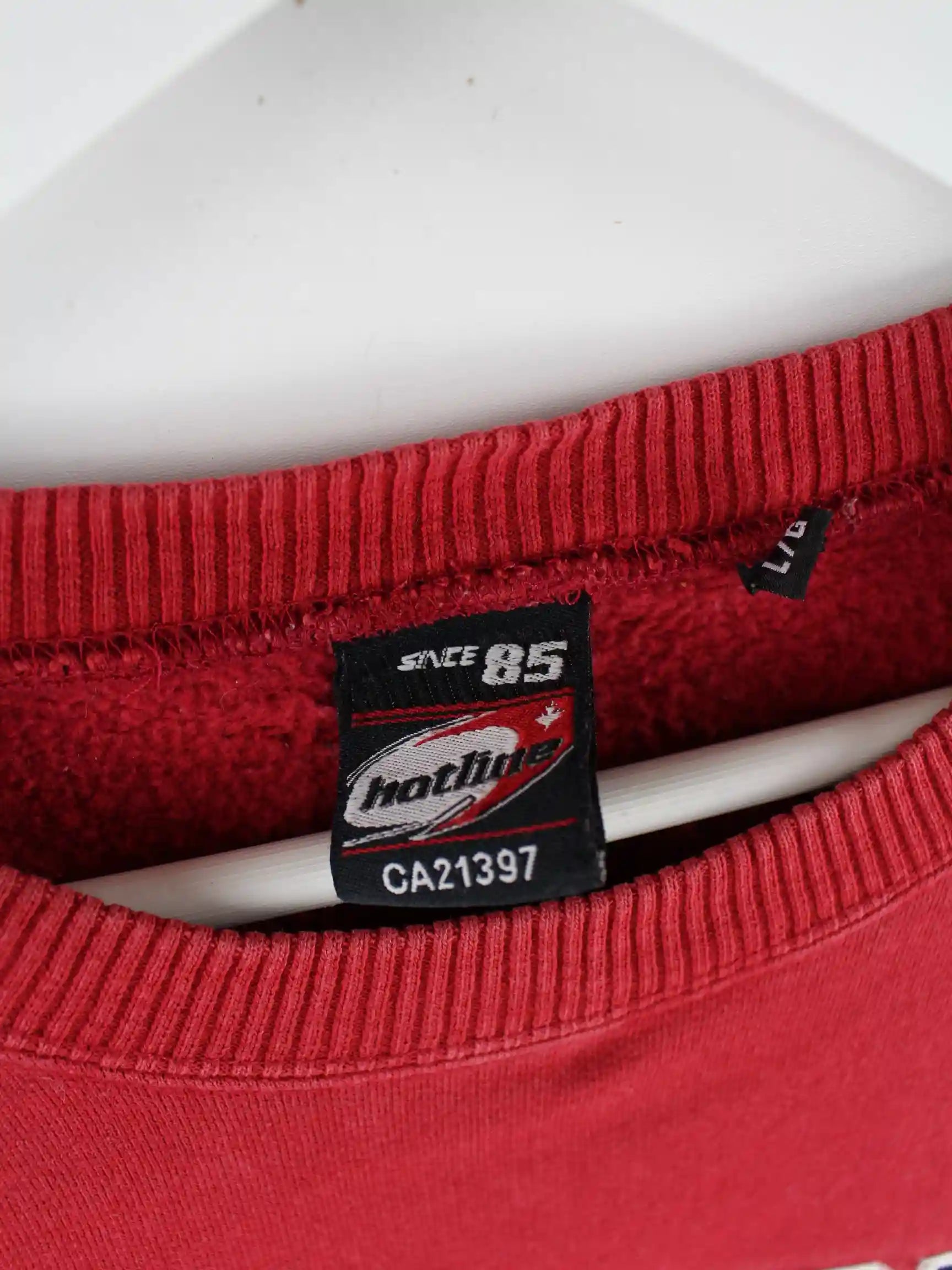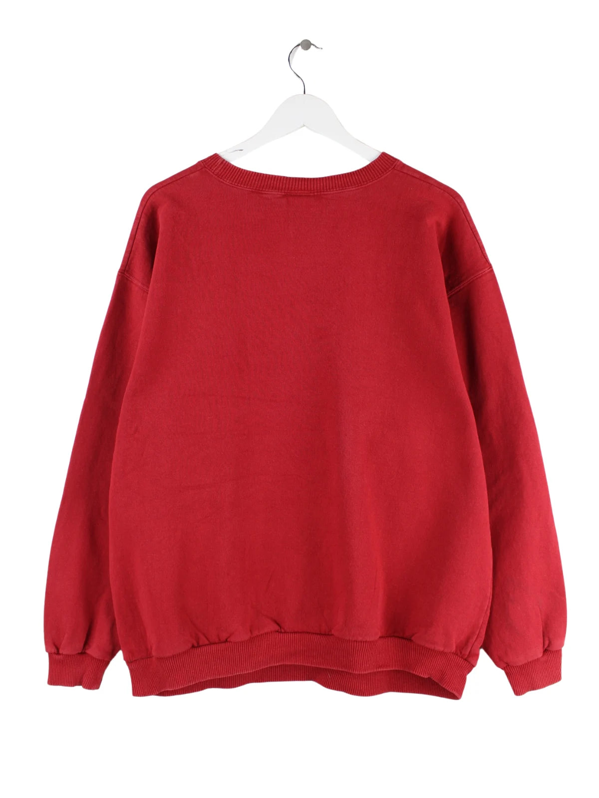 Roter Vintage Sweater mit Stickereien aus den 90'ern in Größe L. Er ist aus einer Baumwollmischung gefertigt und in gutem Zustand auf Lager.