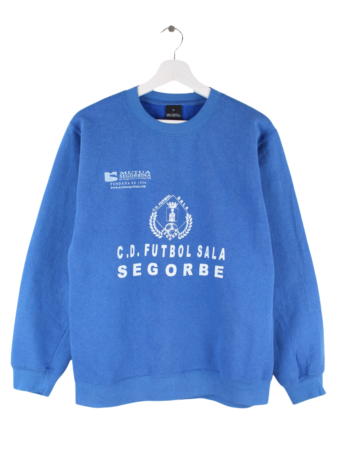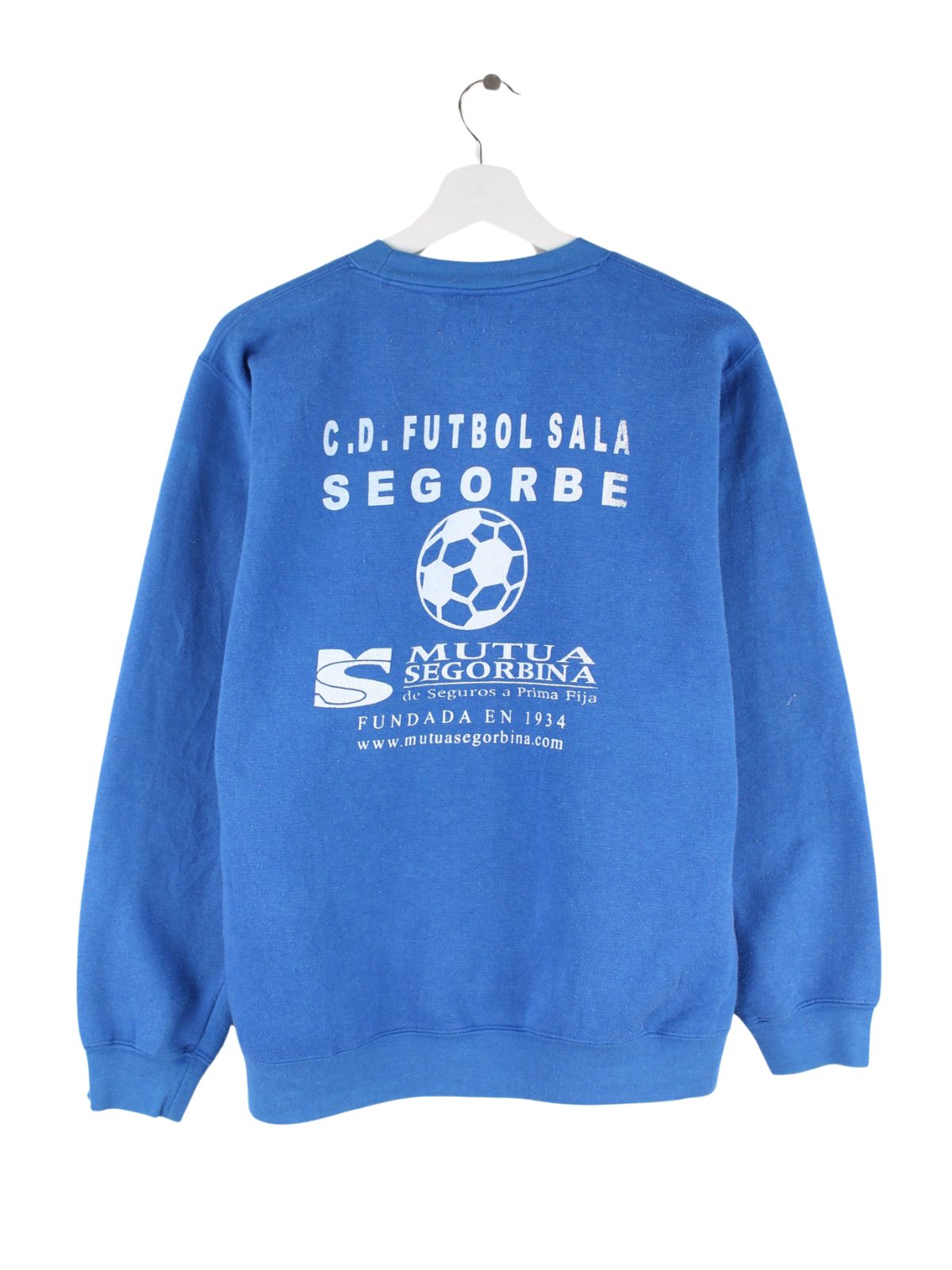 Blauer Vintage Sweater aus den 90'ern in Größe M. Er ist aus einer Baumwollmischung angefertigt und in gutem Zustand lieferbar. Mit tollem Football Print.