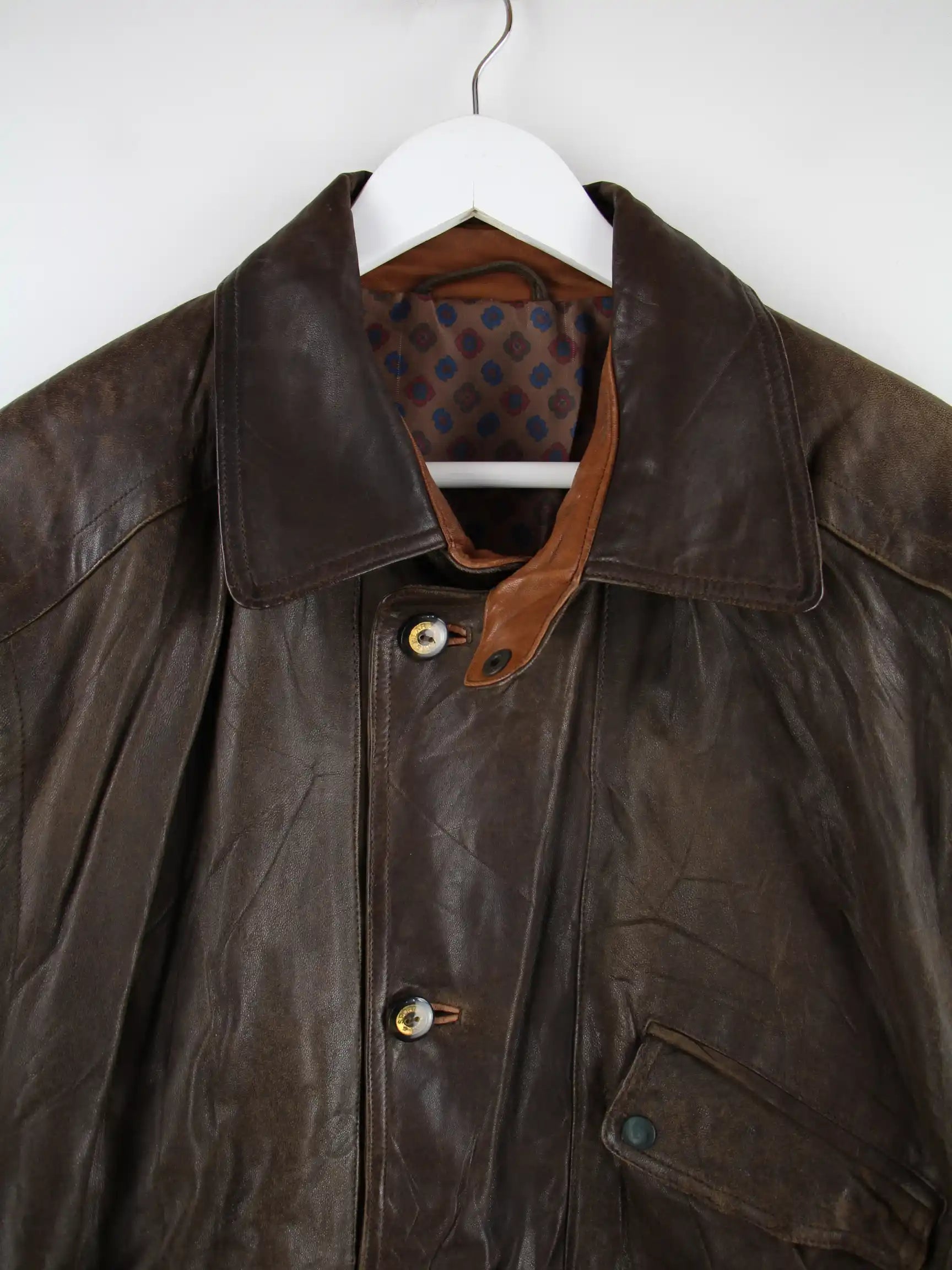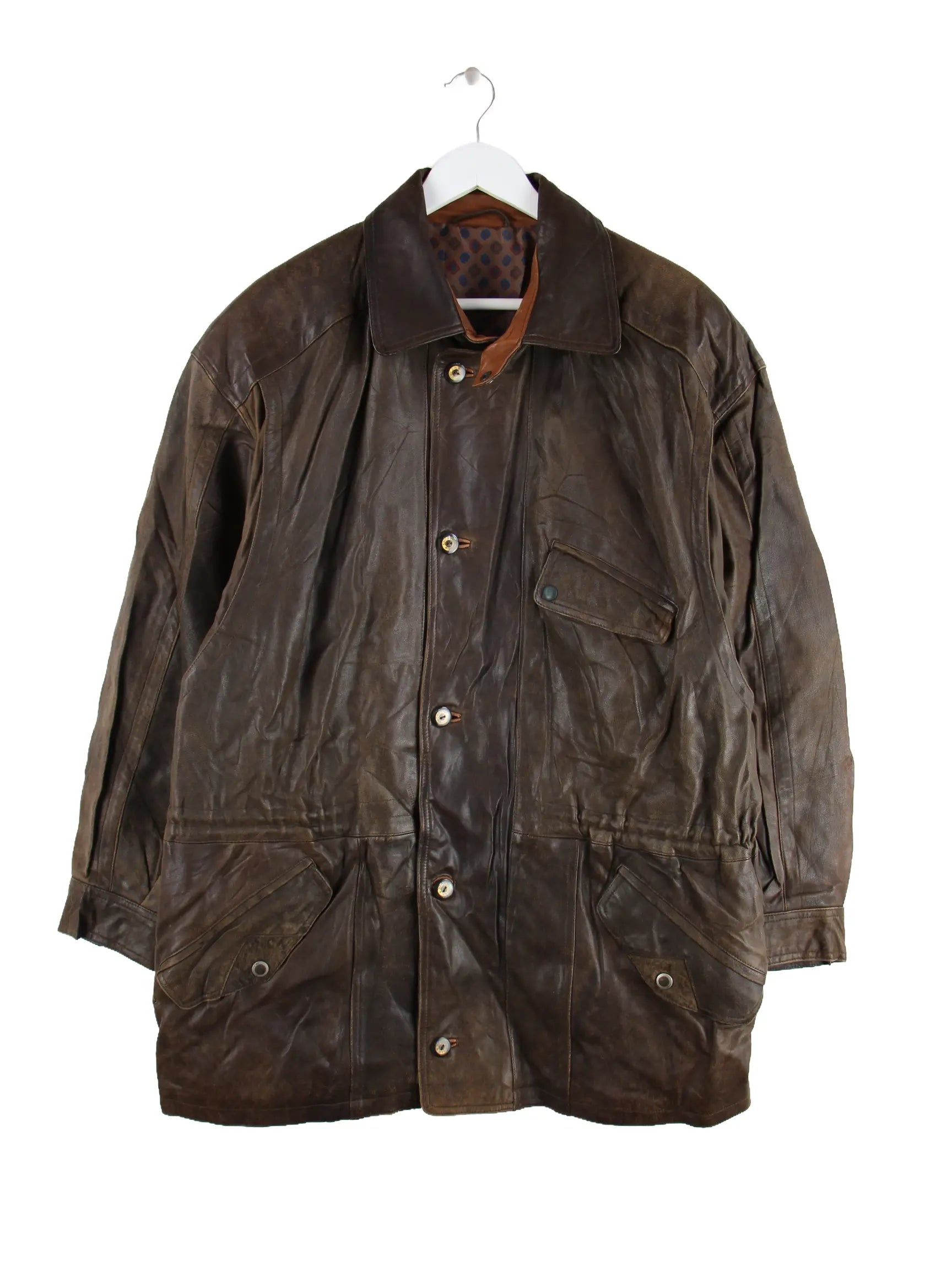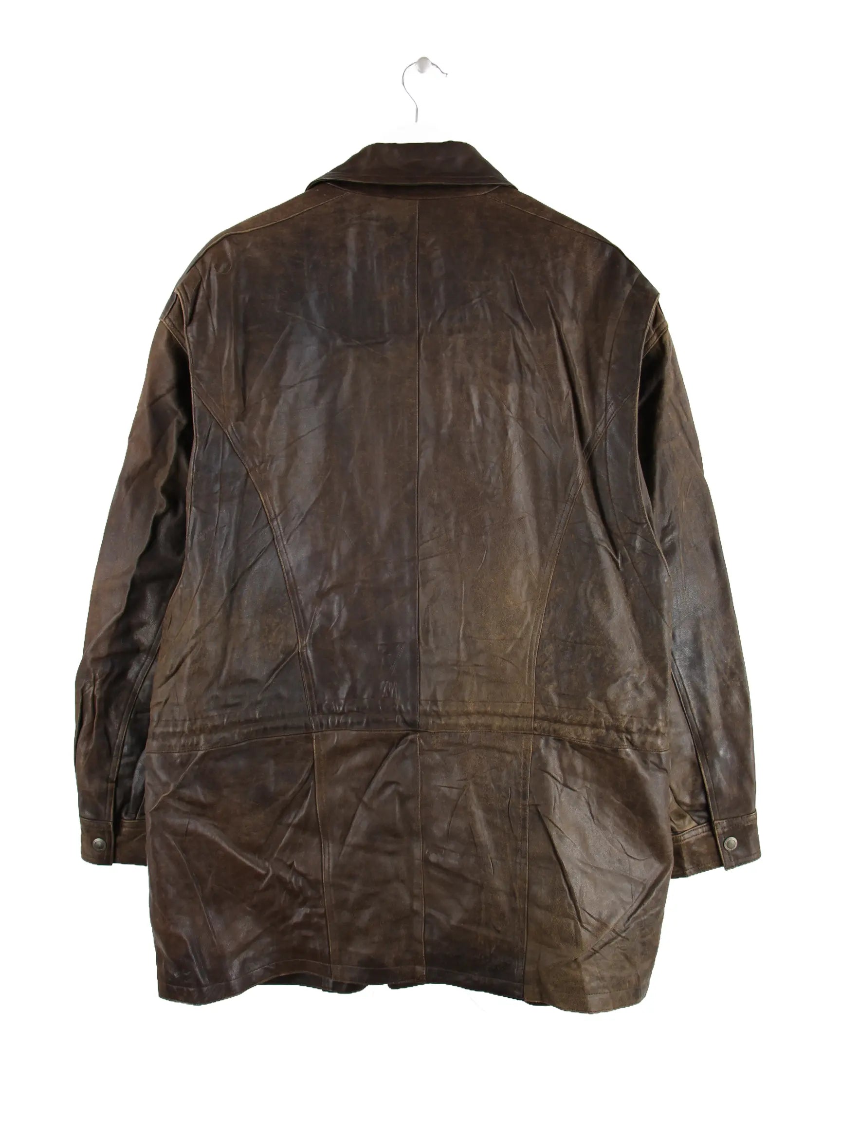Braune Vintage Jacke aus den 90'ern in Größe L. Sie ist aus Leder gefertigt und in gutem Zustand zu haben.
