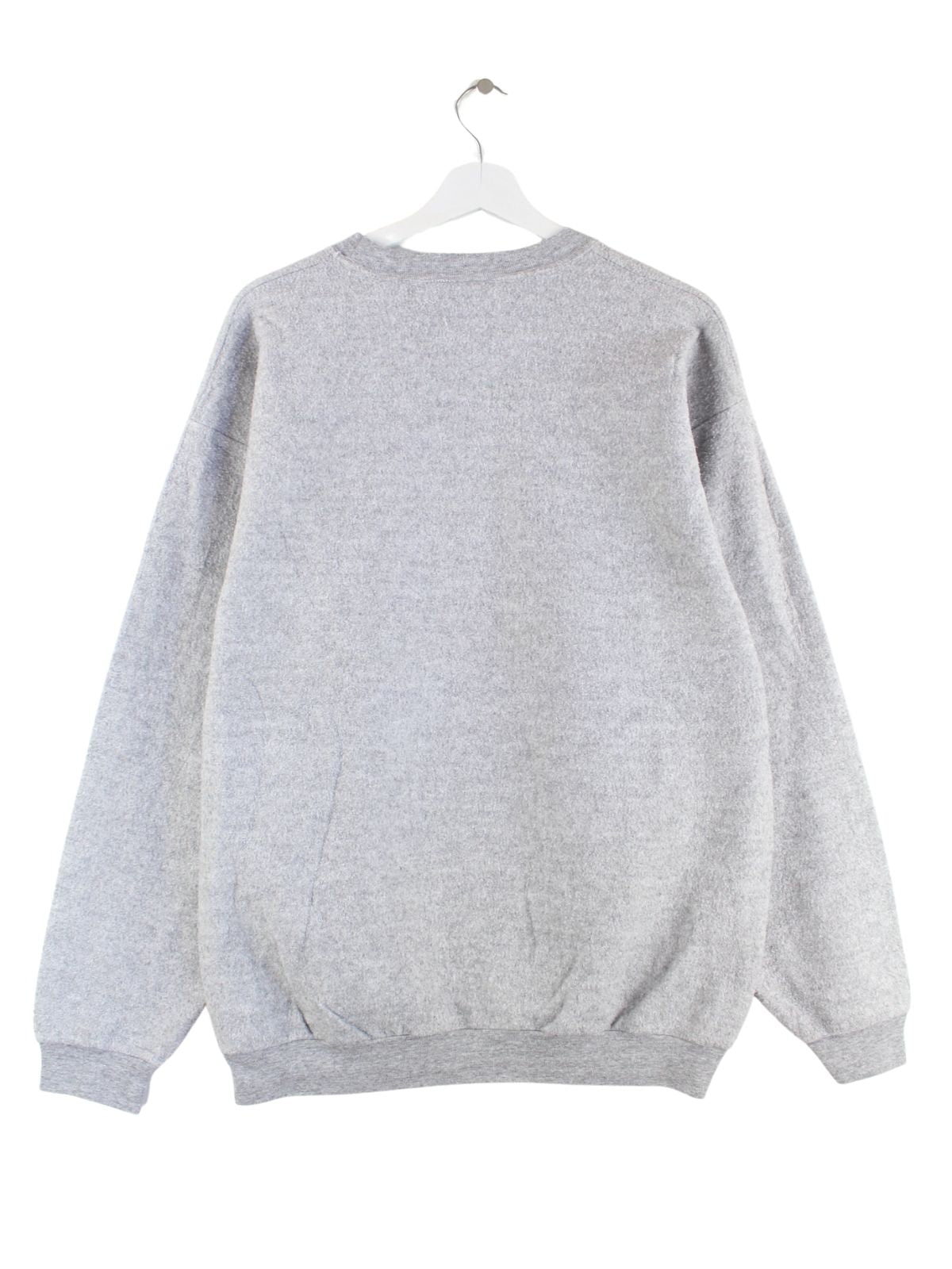 Vintage Sweater mit gesticktem Logo in Größe XL aus den 90'ern. Er ist aus einer Baumwollmischung produziert und in Grau bei uns zu bekommen.