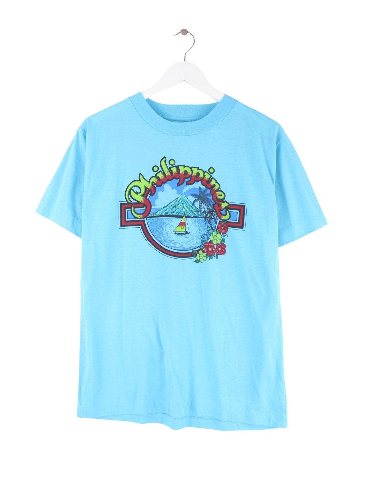 Vintage T-Shirt in Größe L aus den 90'ern. Es ist aus Baumwolle produziert und in Blau bei uns zu bekommen. Mit seltenem Philipines Print.