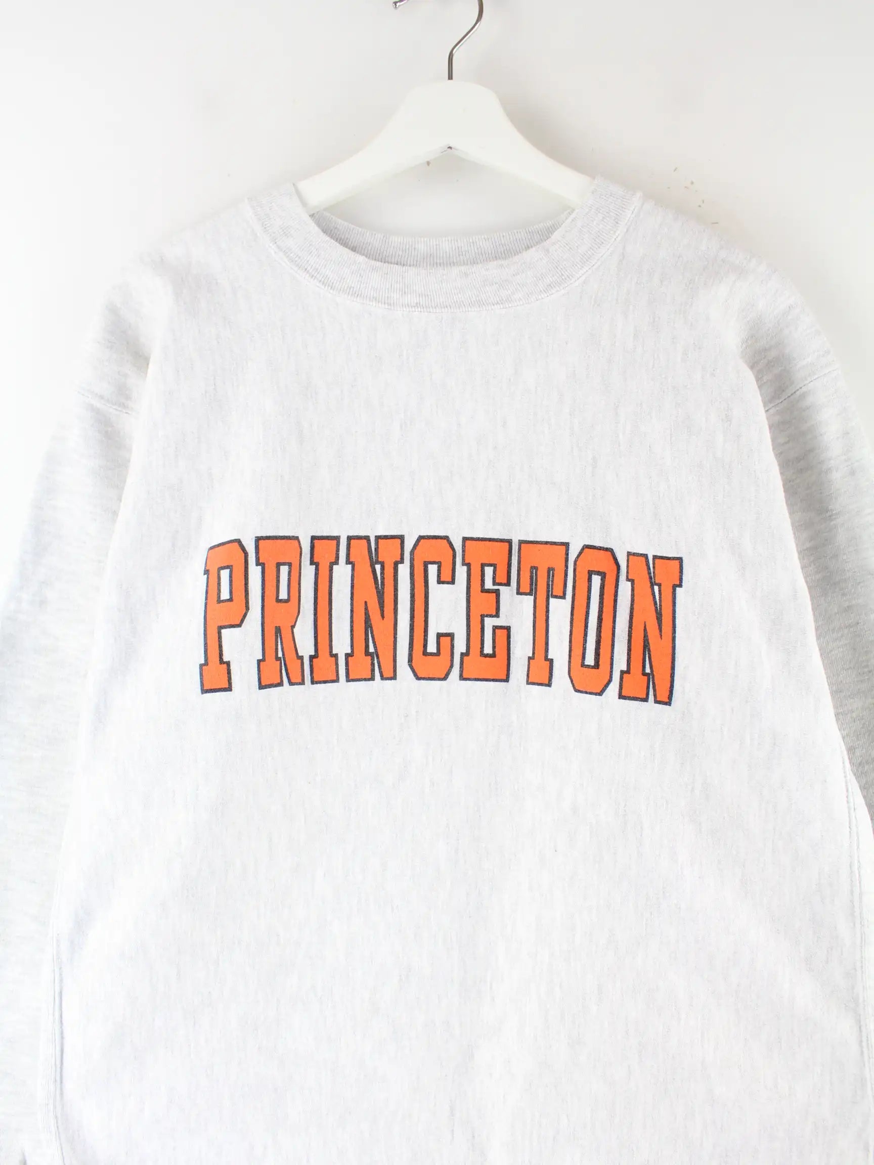 Grauer Vintage Sweater aus den 90'ern in Größe XL. Er ist aus einer Baumwollmischung gemacht und in gutem Zustand bei uns vorrätig. Mit schönem Princeton Print.