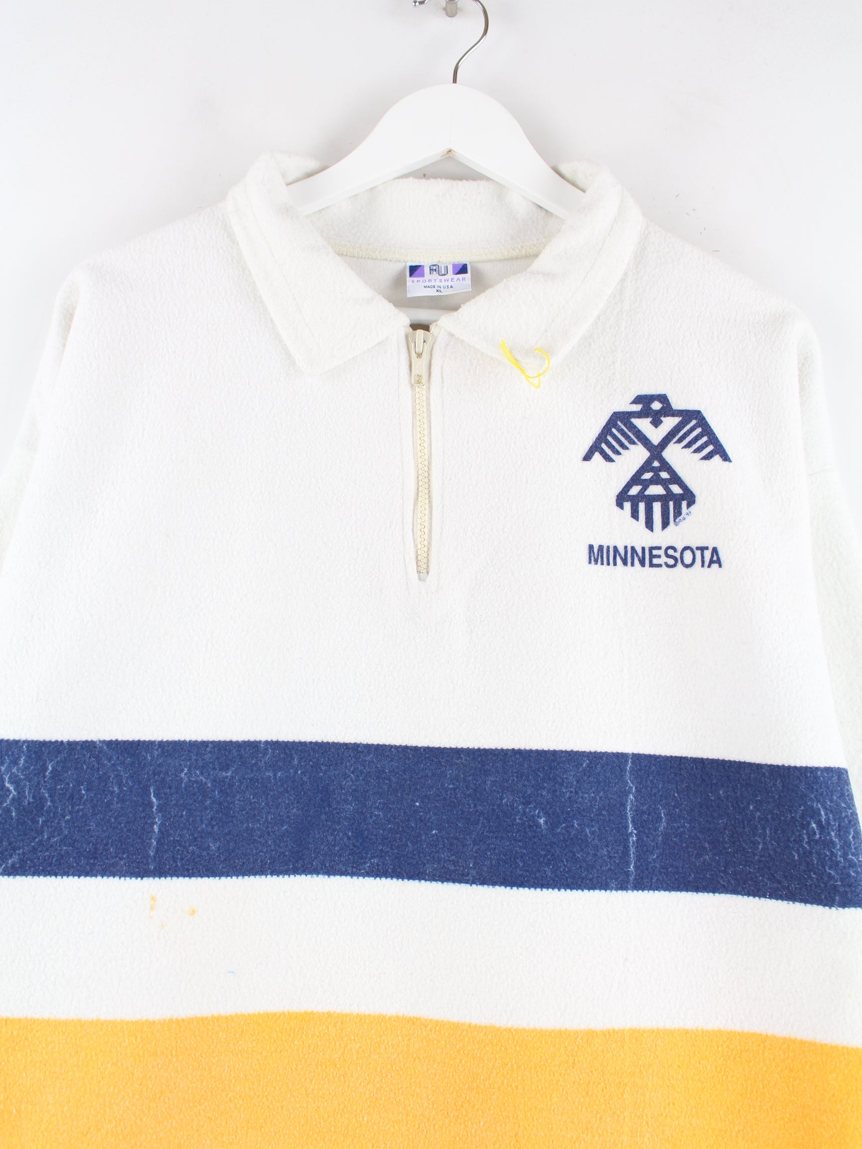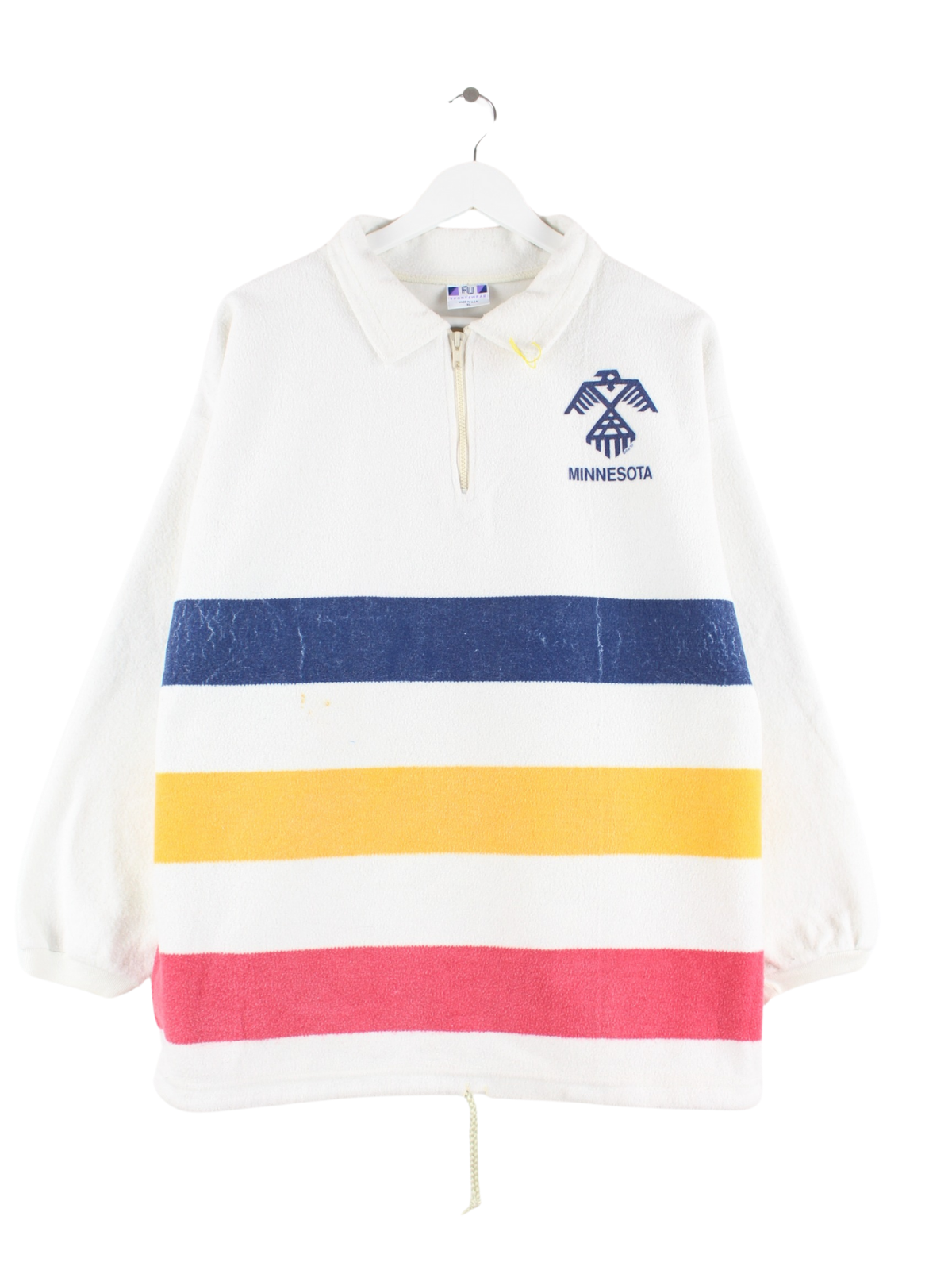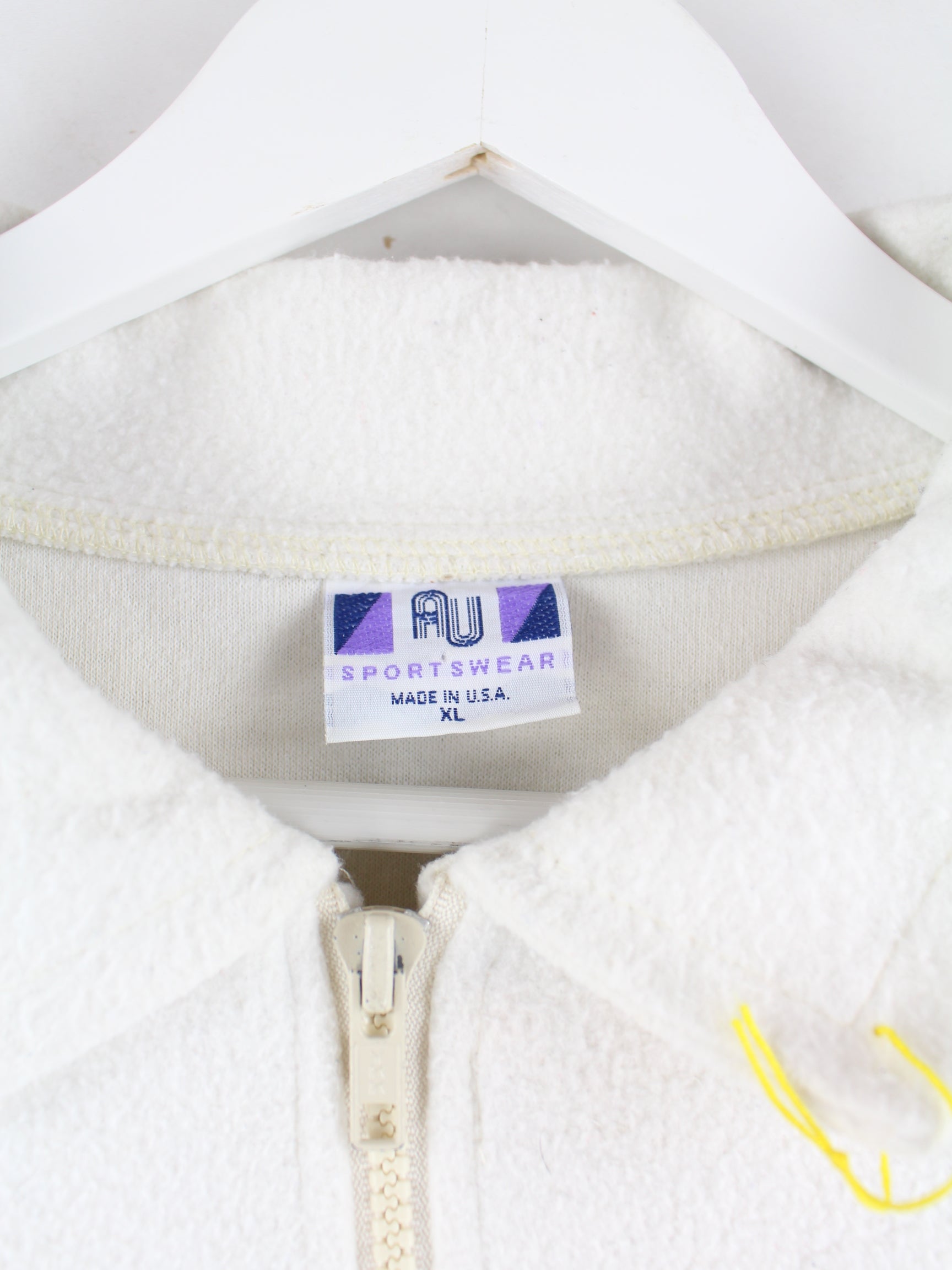Vintage Sweater mit half Zip in Größe XL aus den 90'ern. Er ist aus angenehmem Fleece gemacht und in Weiß vorrätig.