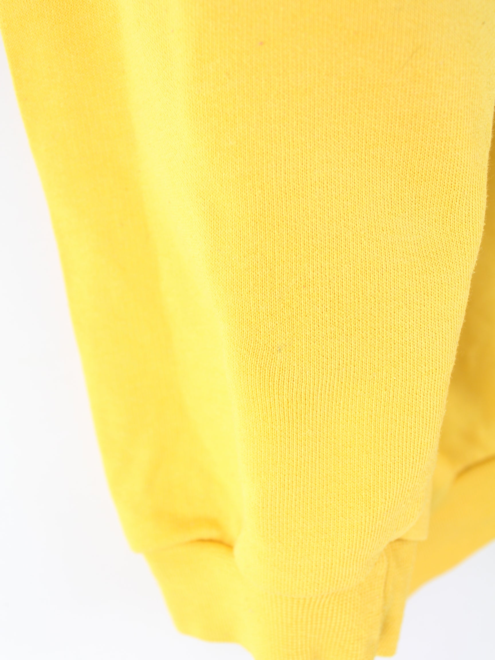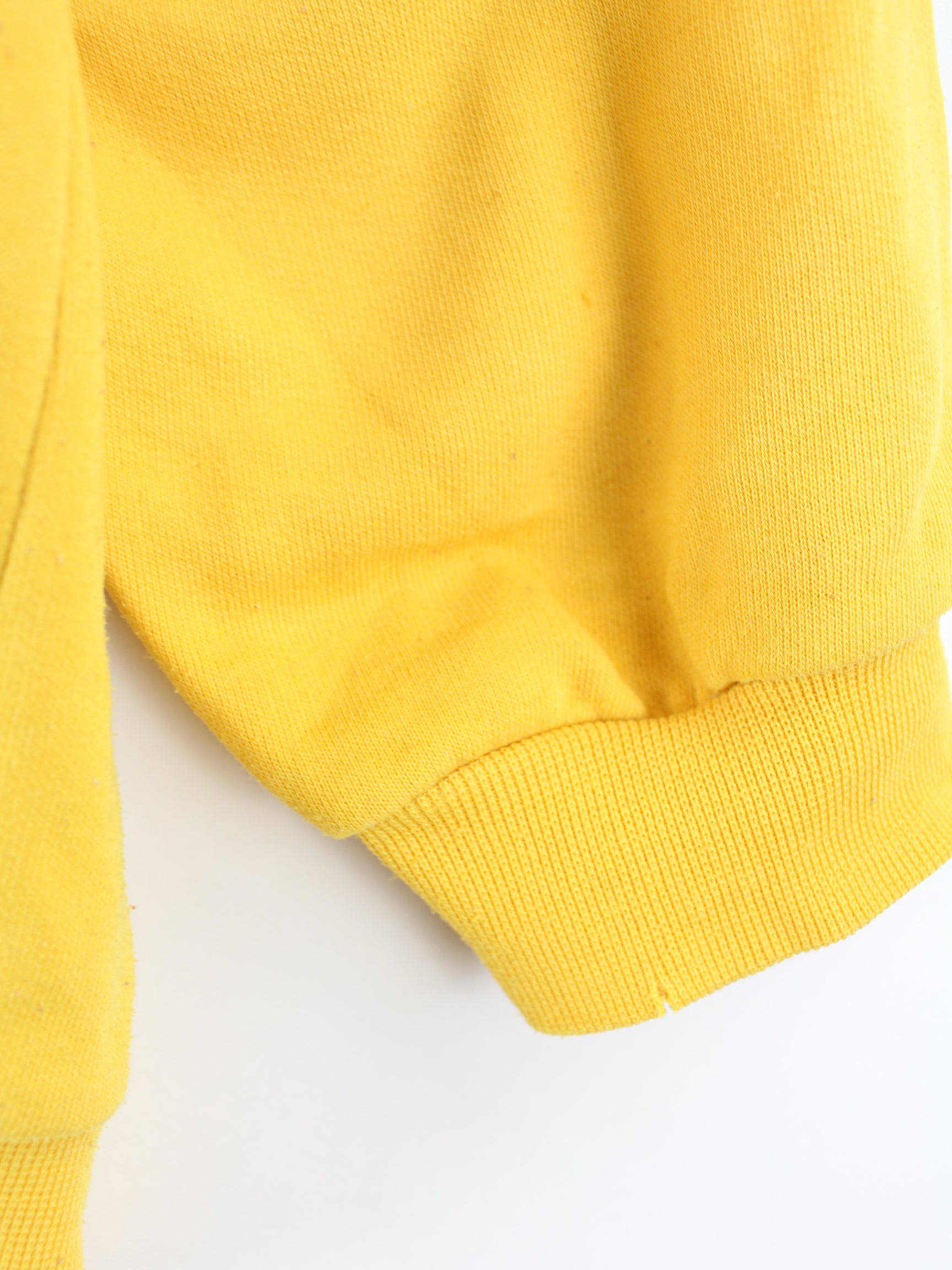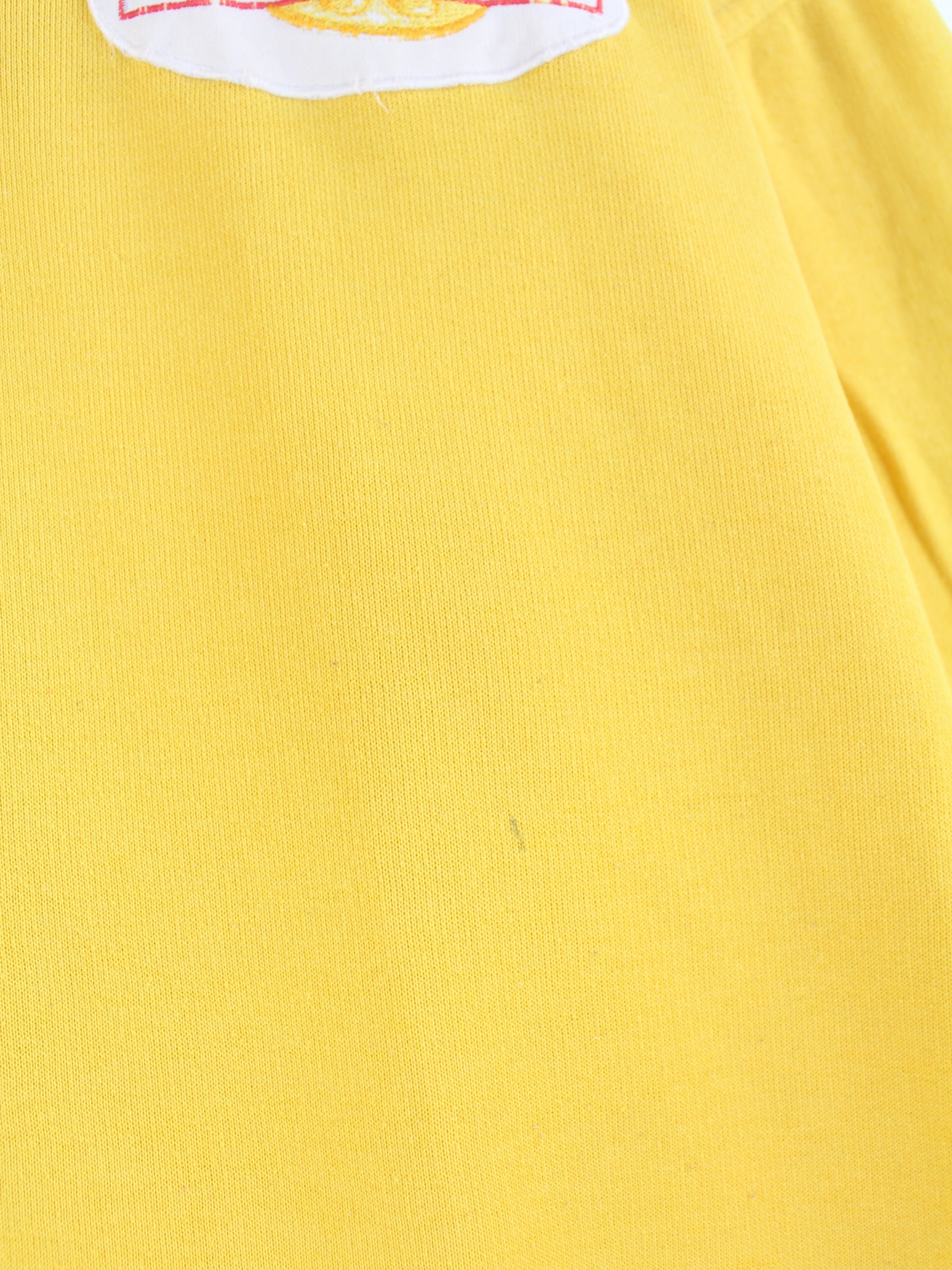 Vintage Sweater mit gestickten Motiven in Größe XL aus den 90'ern. Er ist aus einer Baumwollmischung hergestellt und in Gelb in Stock.