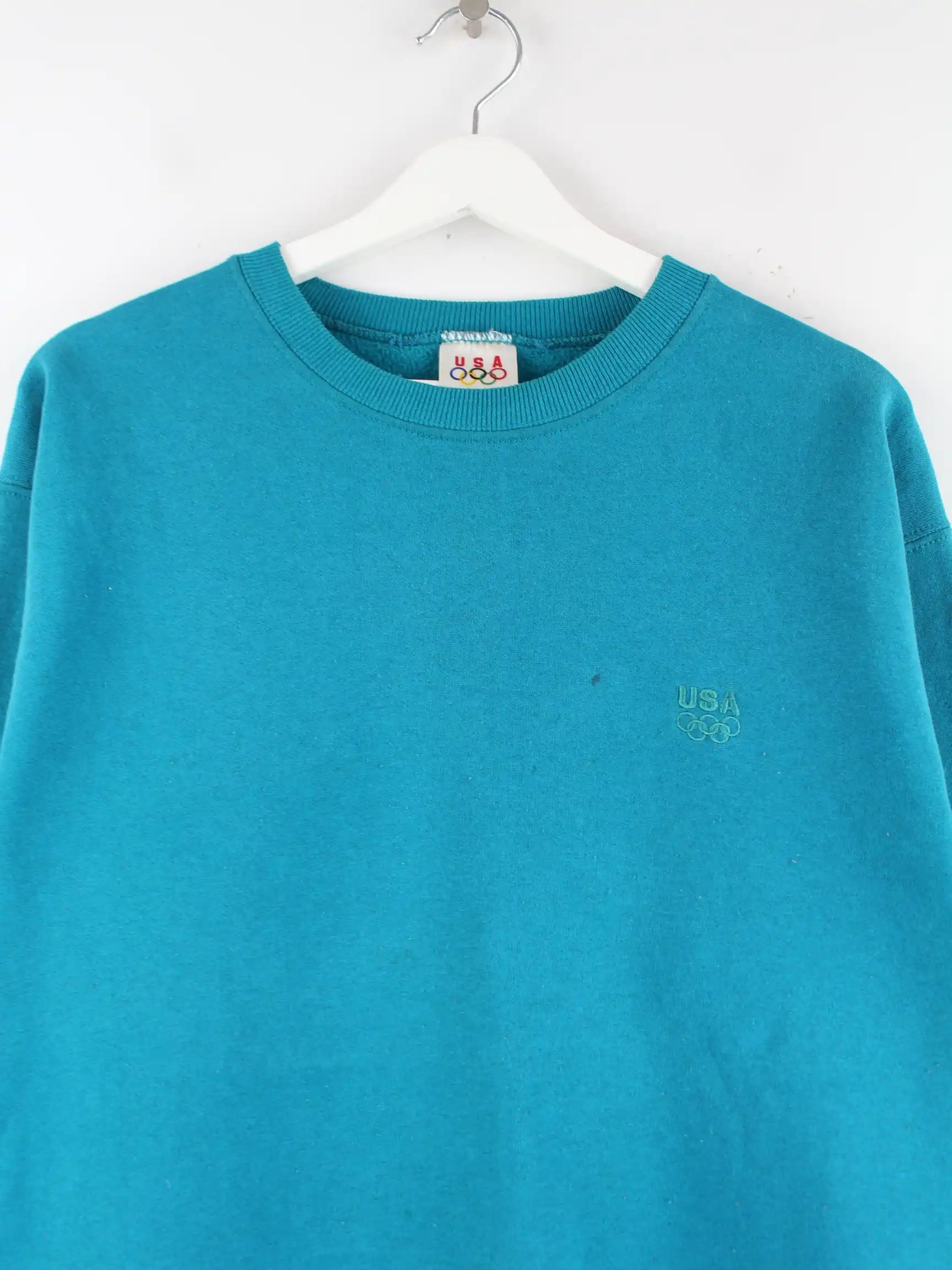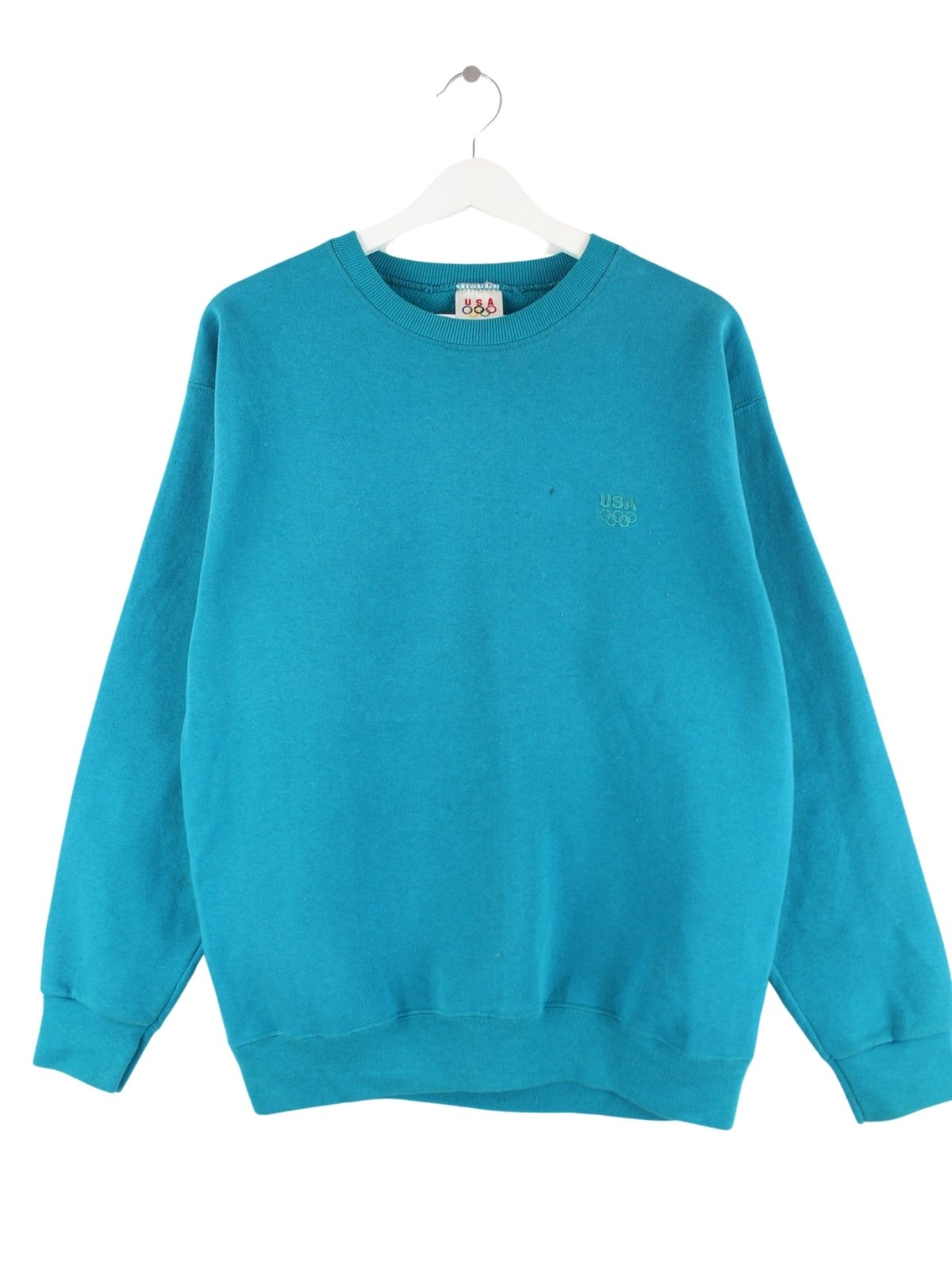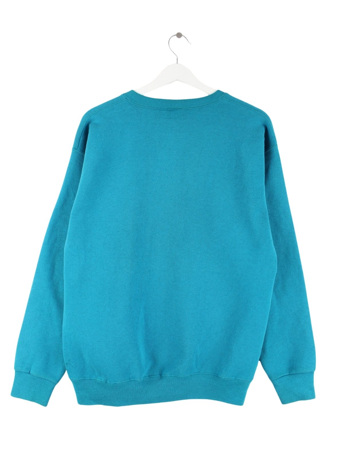 Türkisfarbener Vintage Sweater aus den 90'ern in Größe L. Er ist aus einer Baumwollmischung gefertigt. Den Zustand würden wir als 'In Ordnung' bezeichnen (vergl. Bilder).