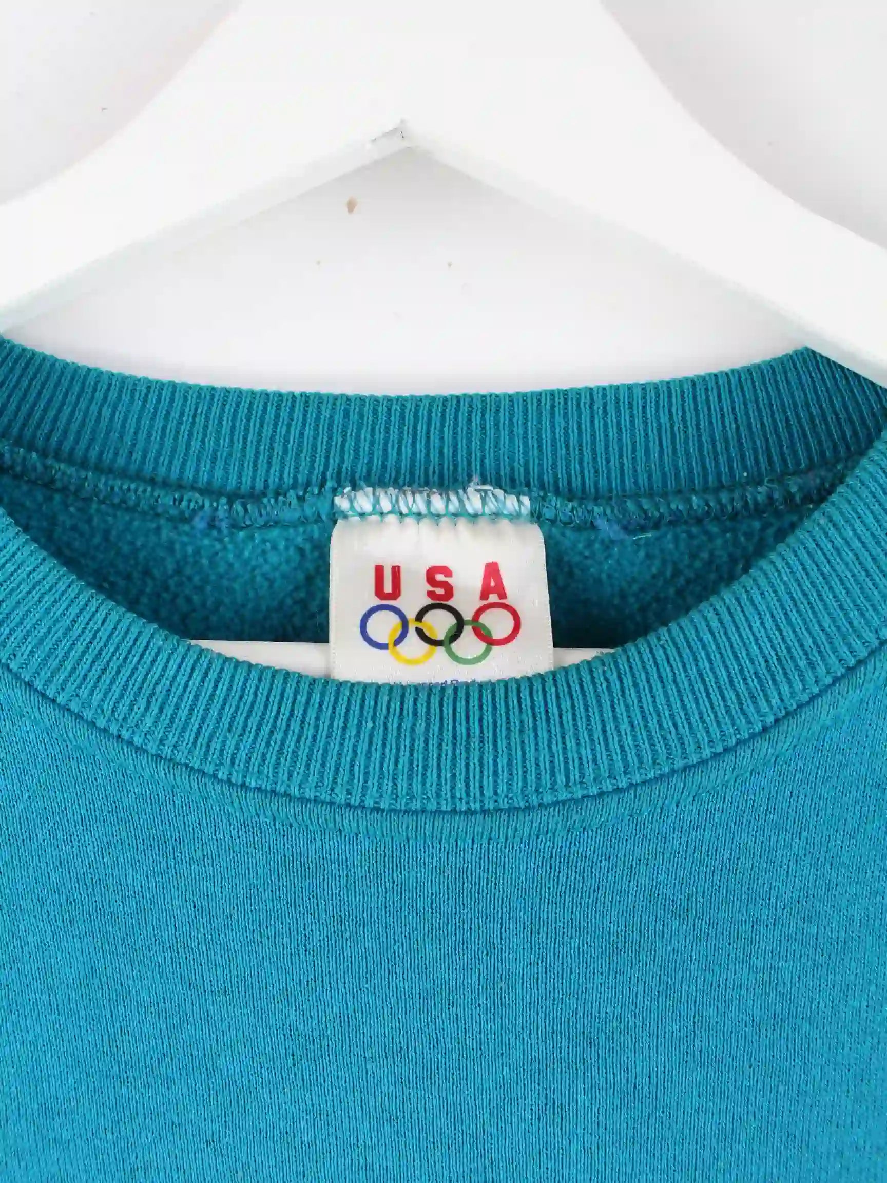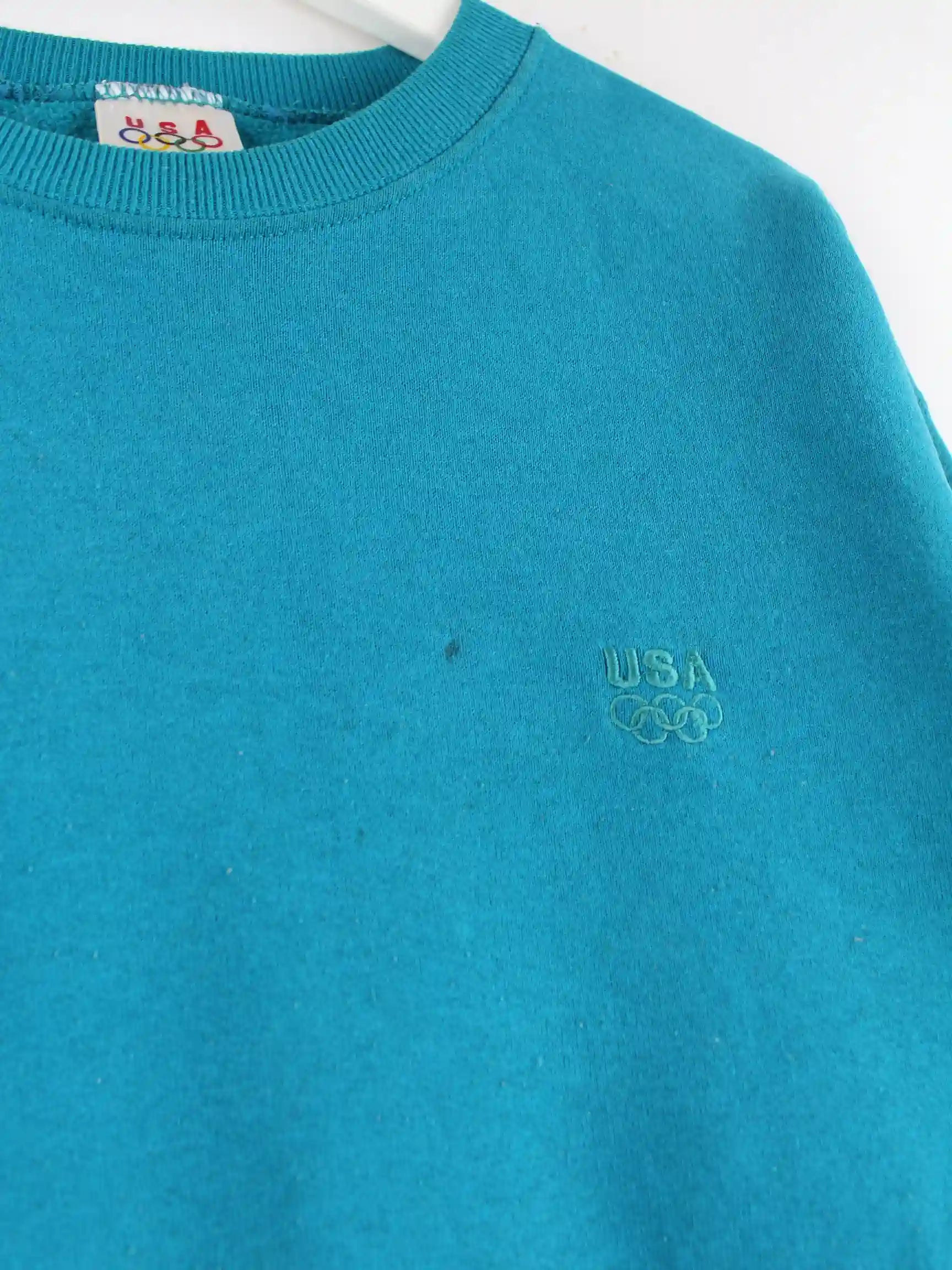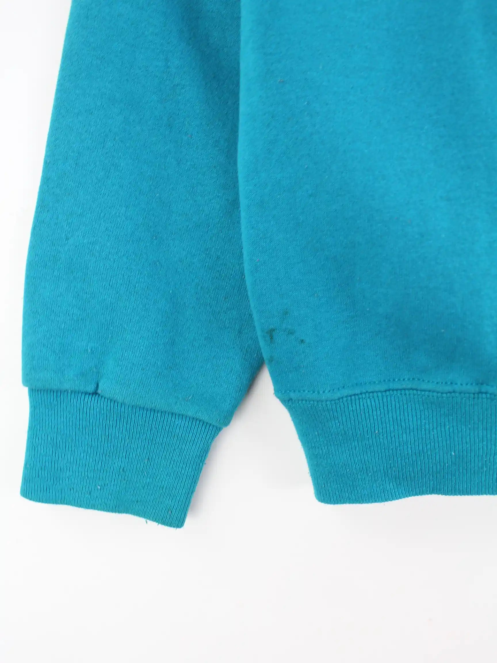 Türkisfarbener Vintage Sweater aus den 90'ern in Größe L. Er ist aus einer Baumwollmischung gefertigt. Den Zustand würden wir als 'In Ordnung' bezeichnen (vergl. Bilder).