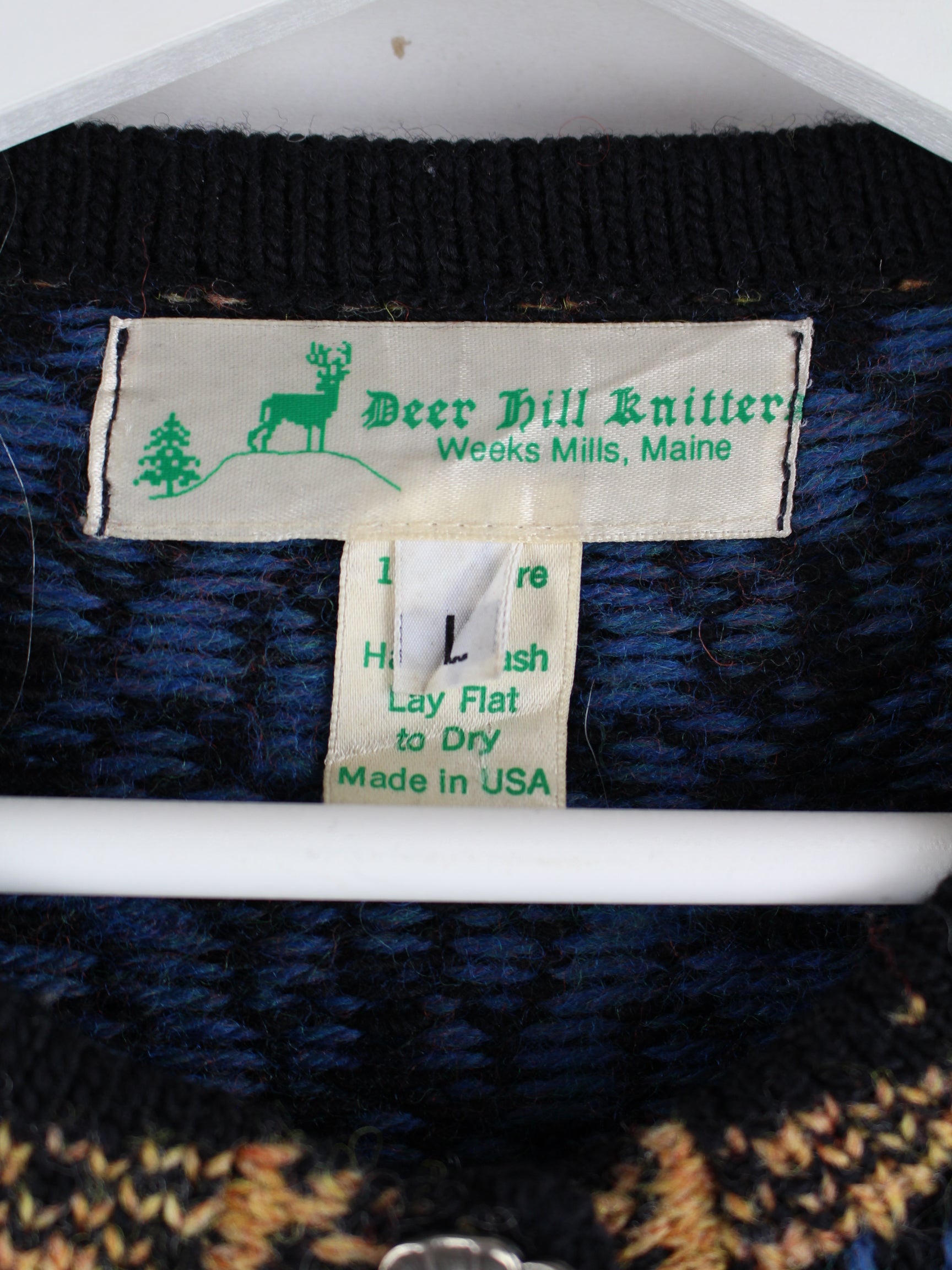Vintage Strickjacke in Größe L aus den 80'ern. Sie ist aus Wolle angefertigt und in bunten Farben vorrätig.