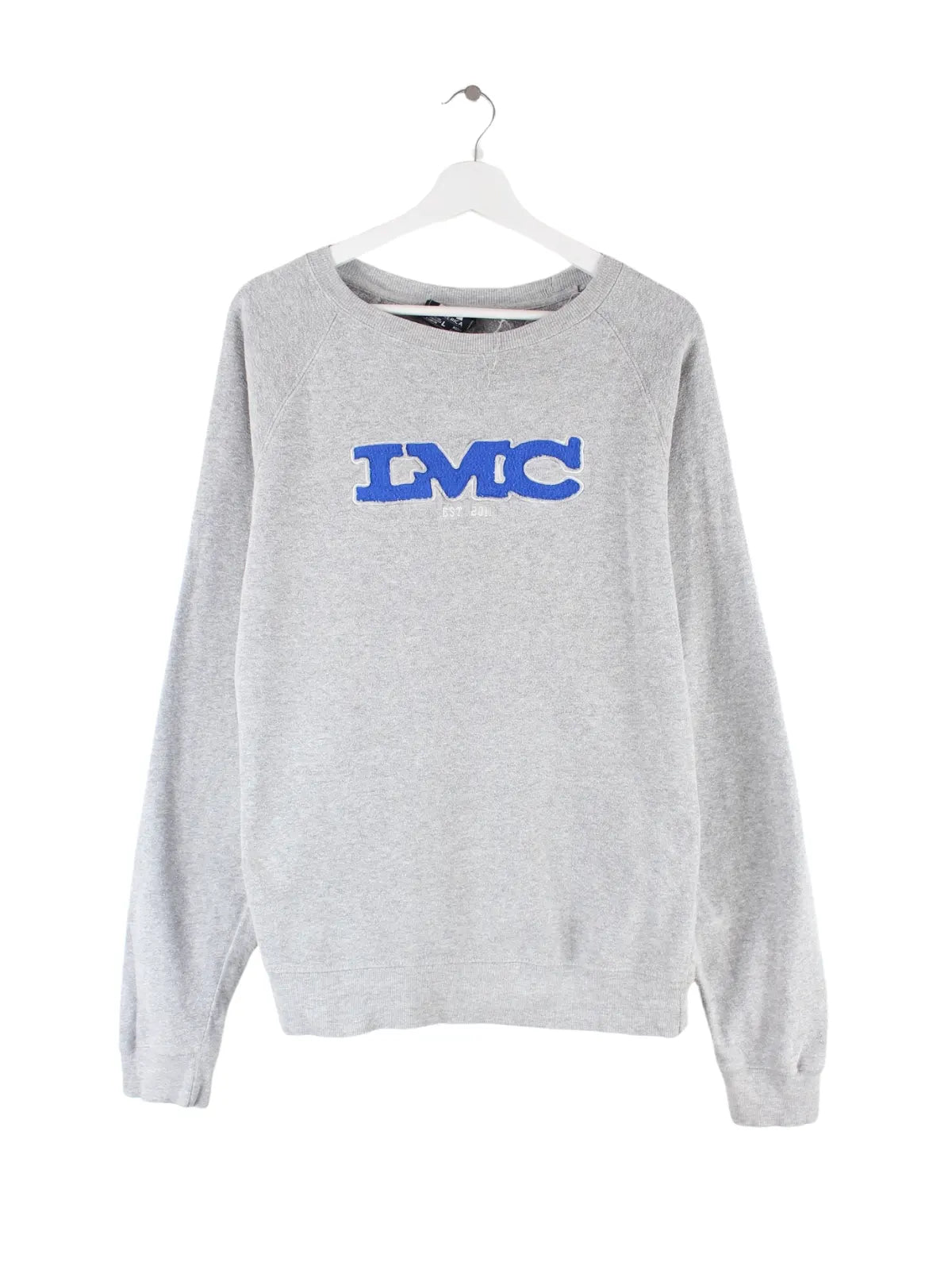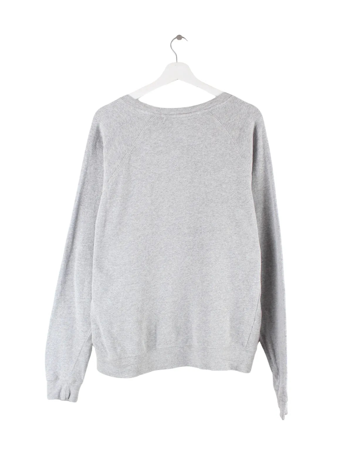 Grauer Vintage Sweater mit gesticktem Logo in Größe L. Er ist aus einer Baumwollmischung gefertigt und in sehr gutem Zustand bei uns zu bekommen.
