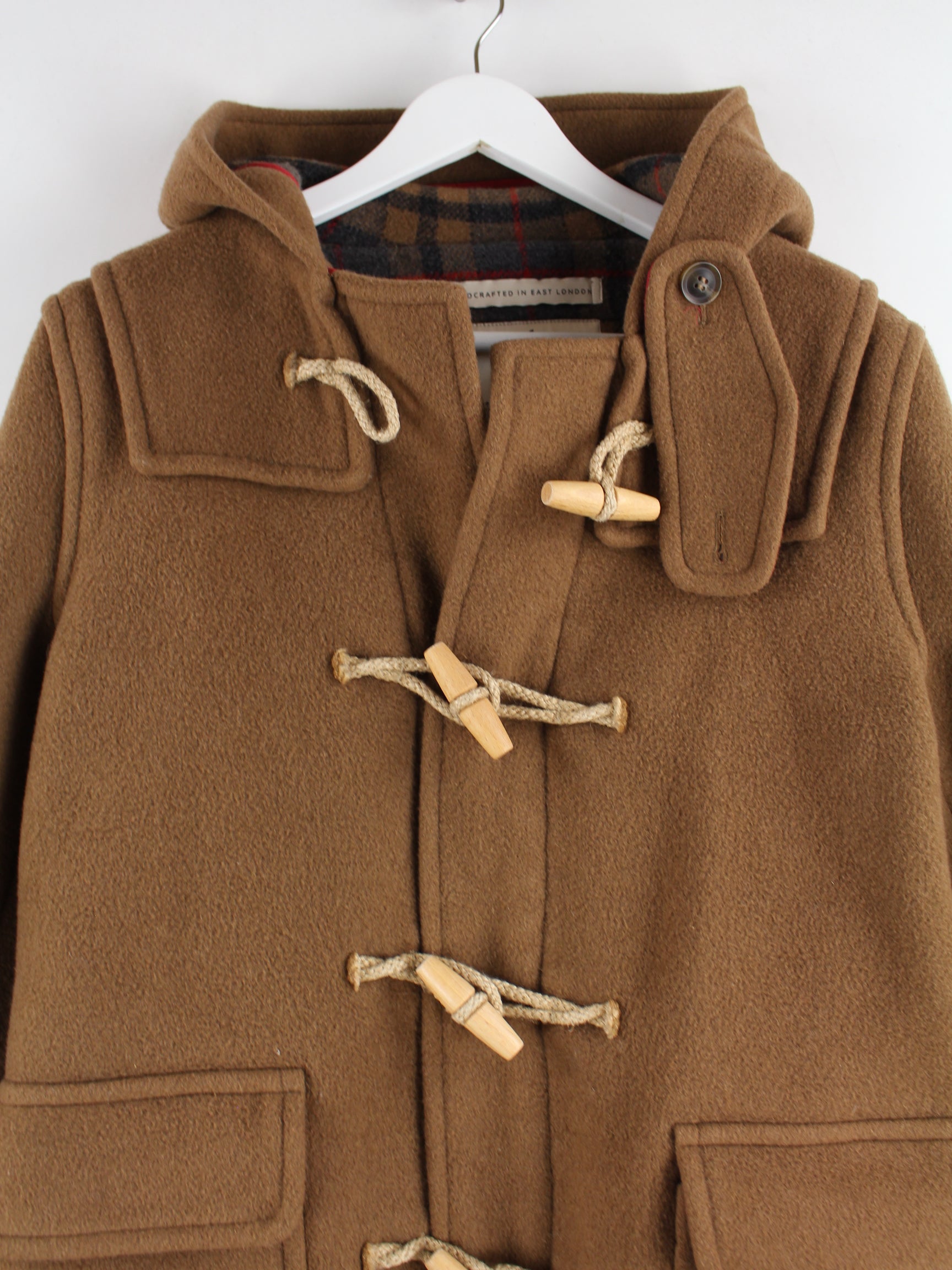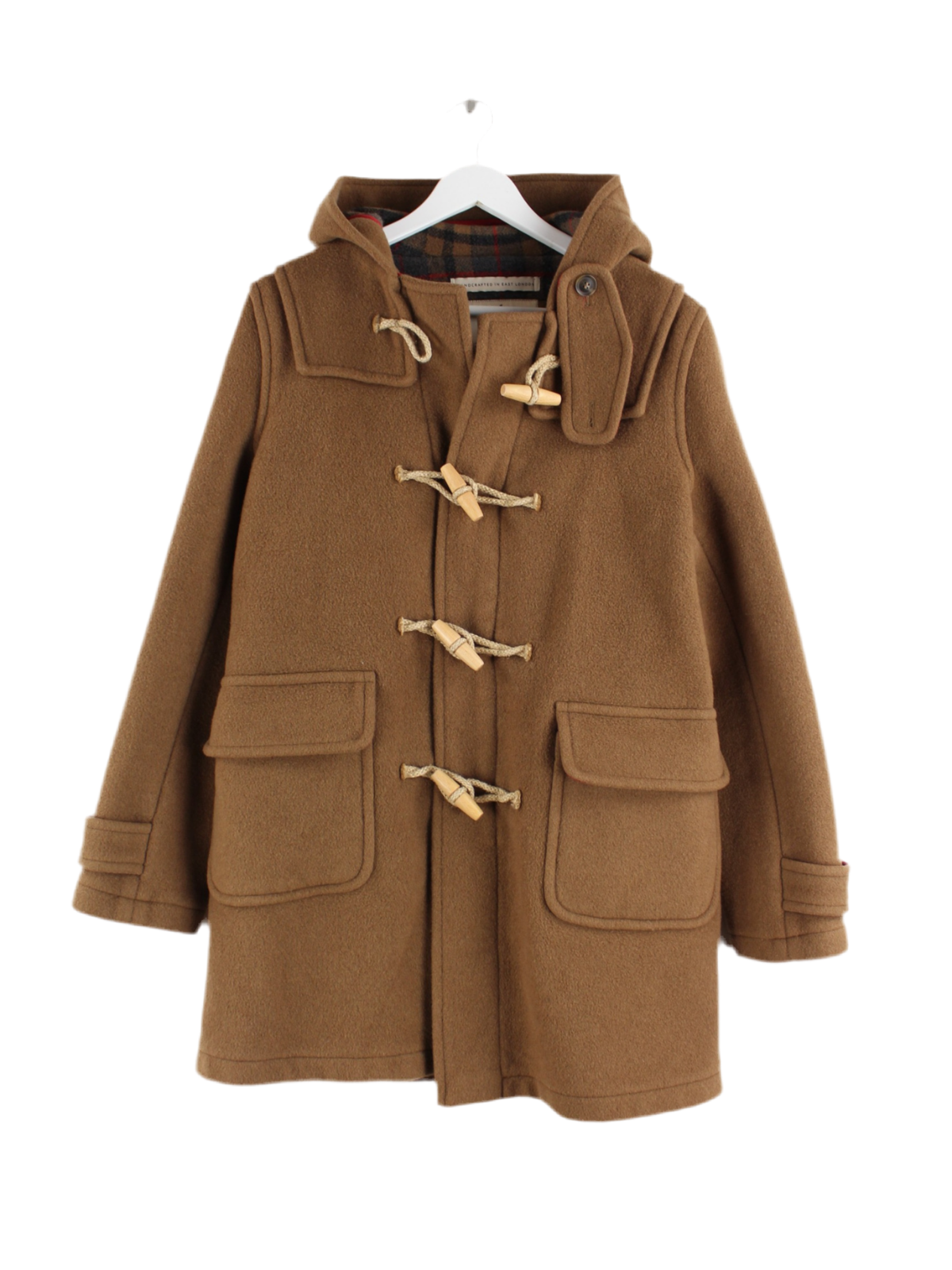 Vintage Mantel in Größe L. Er ist aus einer Wollmischung gefertigt und in Braun bei uns vorrätig.