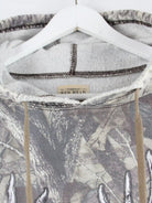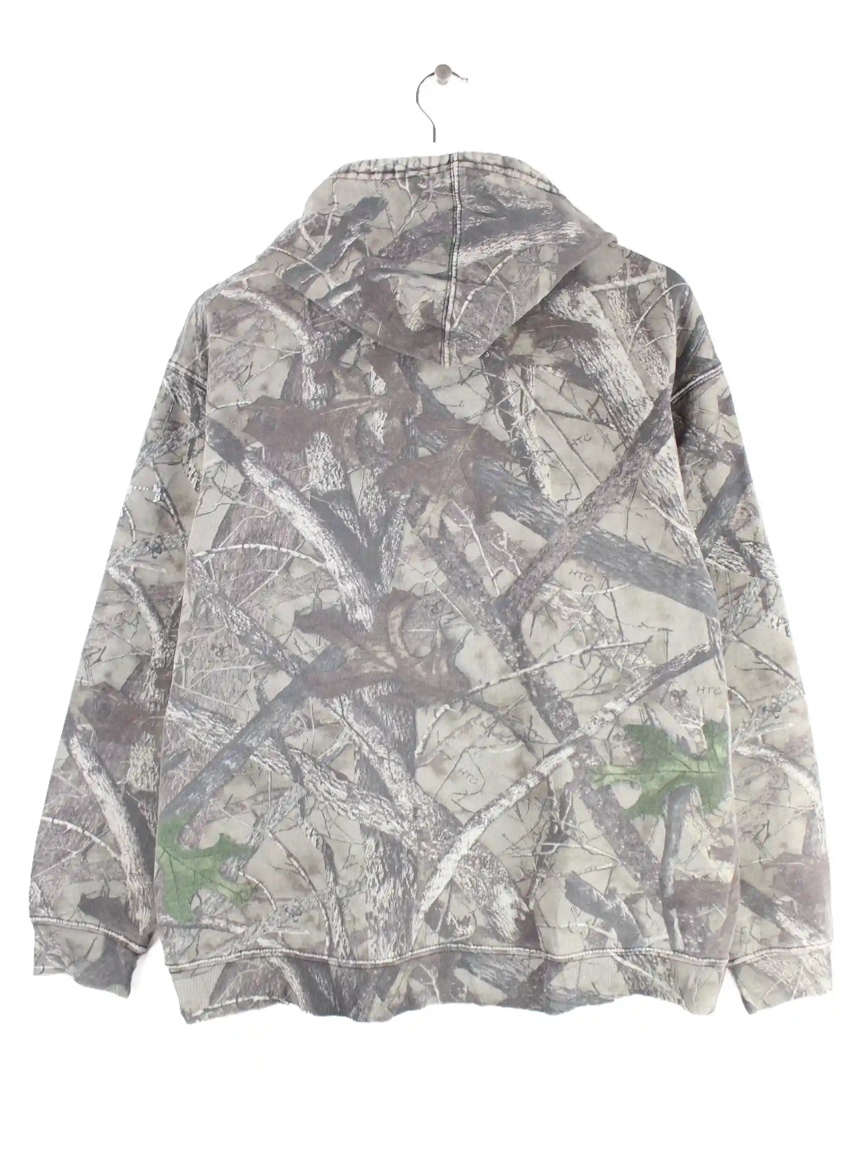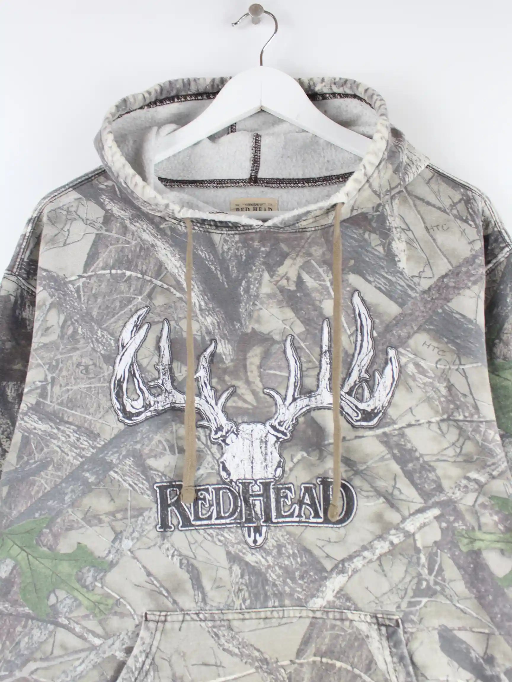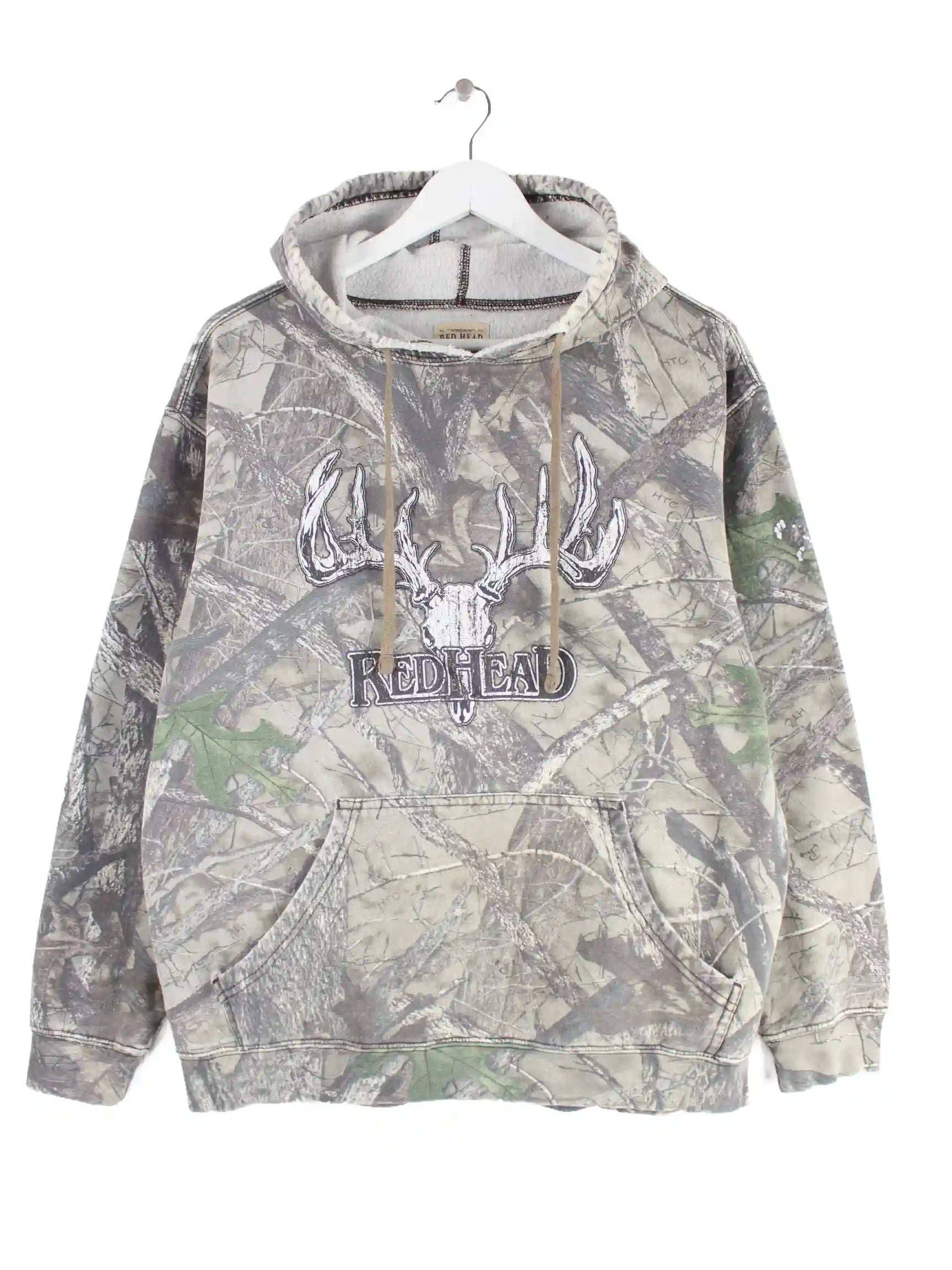 Vintage Hoodie in Größe M. Er ist aus einer Baumwollmischung und in Grau zu haben. Mit schönem Redhead Print.