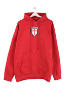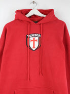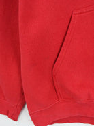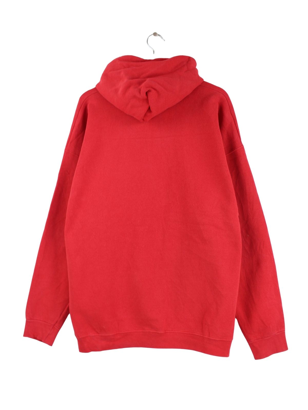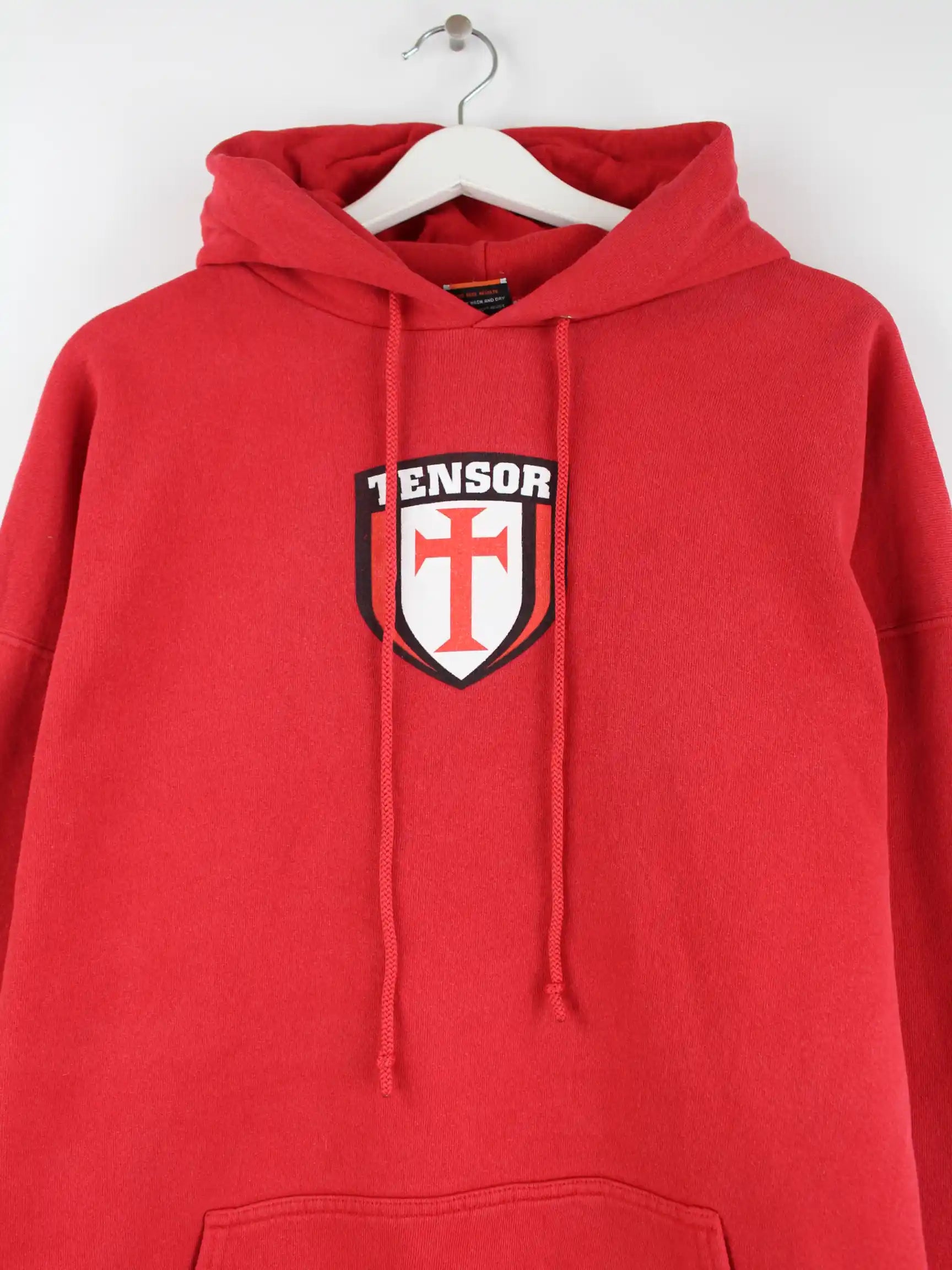 Roter Vintage Hoodie in Größe XL. Er ist aus einer Baumwollmischung angefertigt und in gutem Zustand bei uns zu bekommen. Mit chiquem Tensor Print.