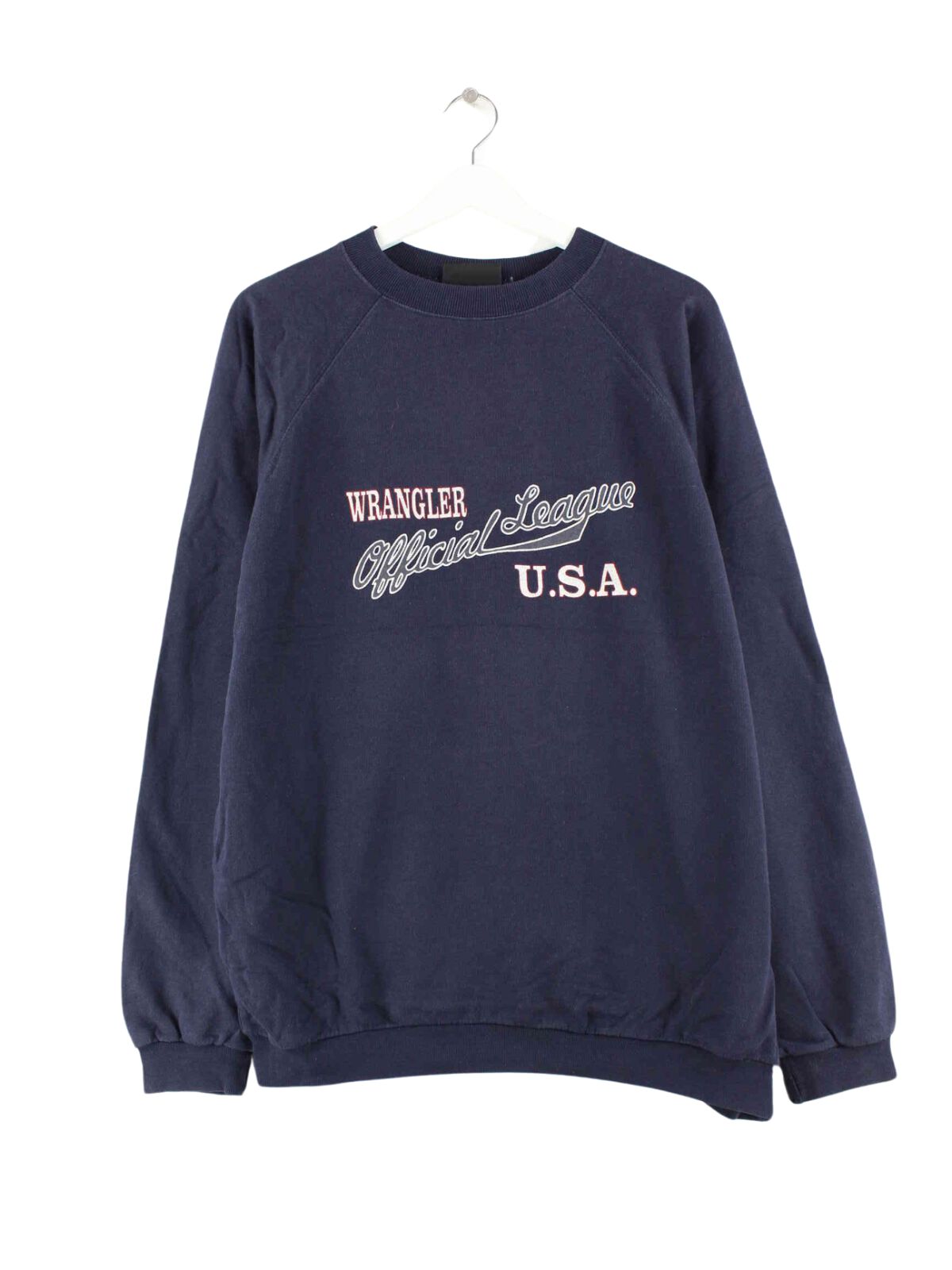 Sweater vom Brand Wrangler in Größe L aus den 90'ern. Er ist aus einer Baumwollmischung und in Blau zu bekommen. Mit seltenem USA Print.