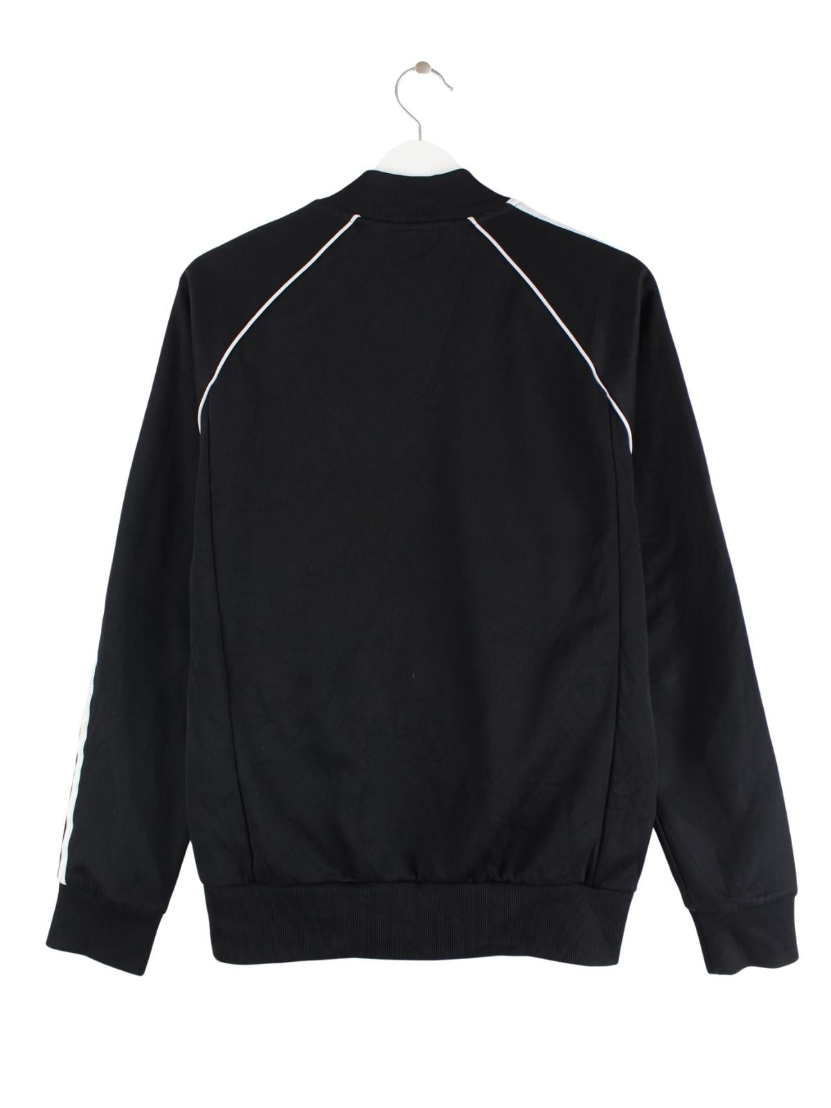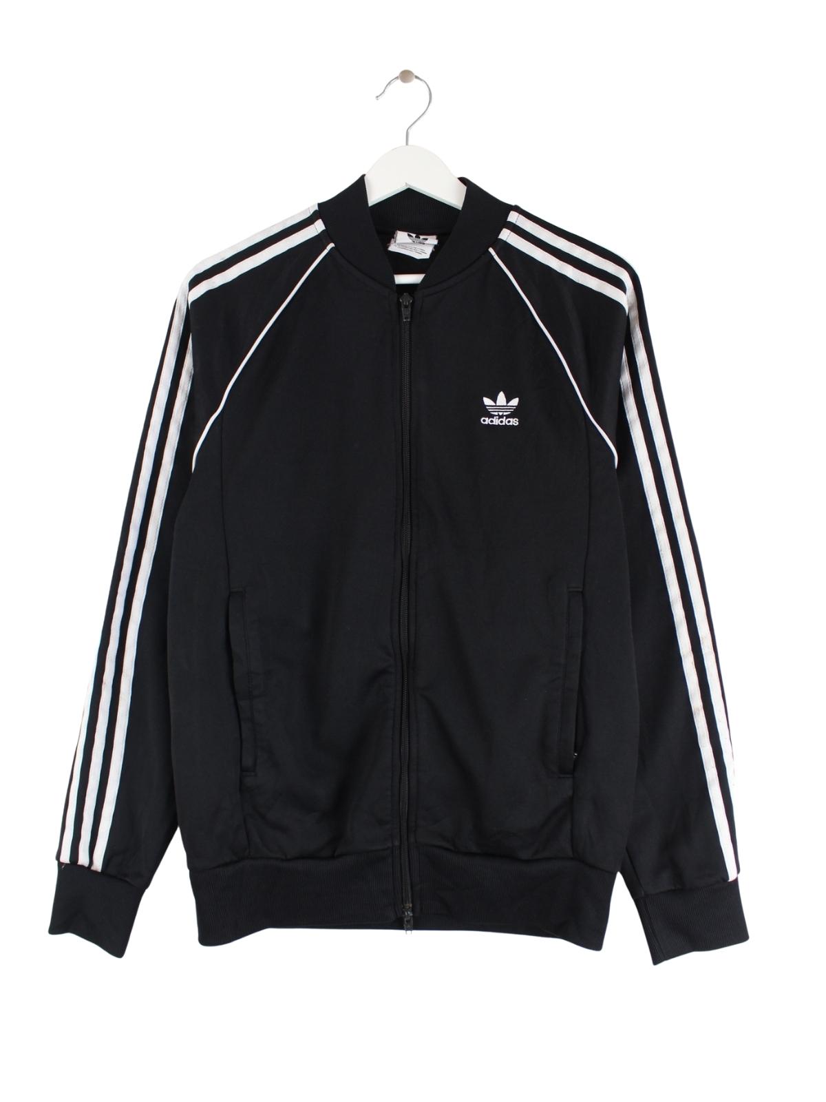 Schwarze 3-Stripes Trainingsjacke von Adidas in Größe M. Sie ist aus Synthetik produziert und in sehr gutem Zustand zu bekommen.