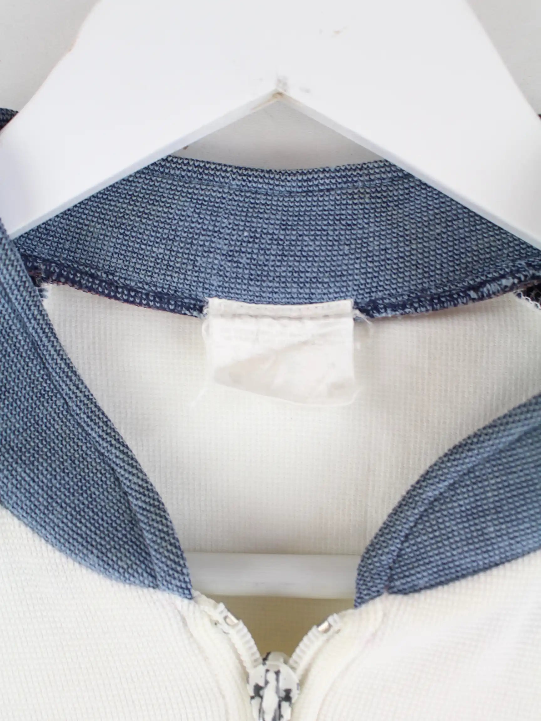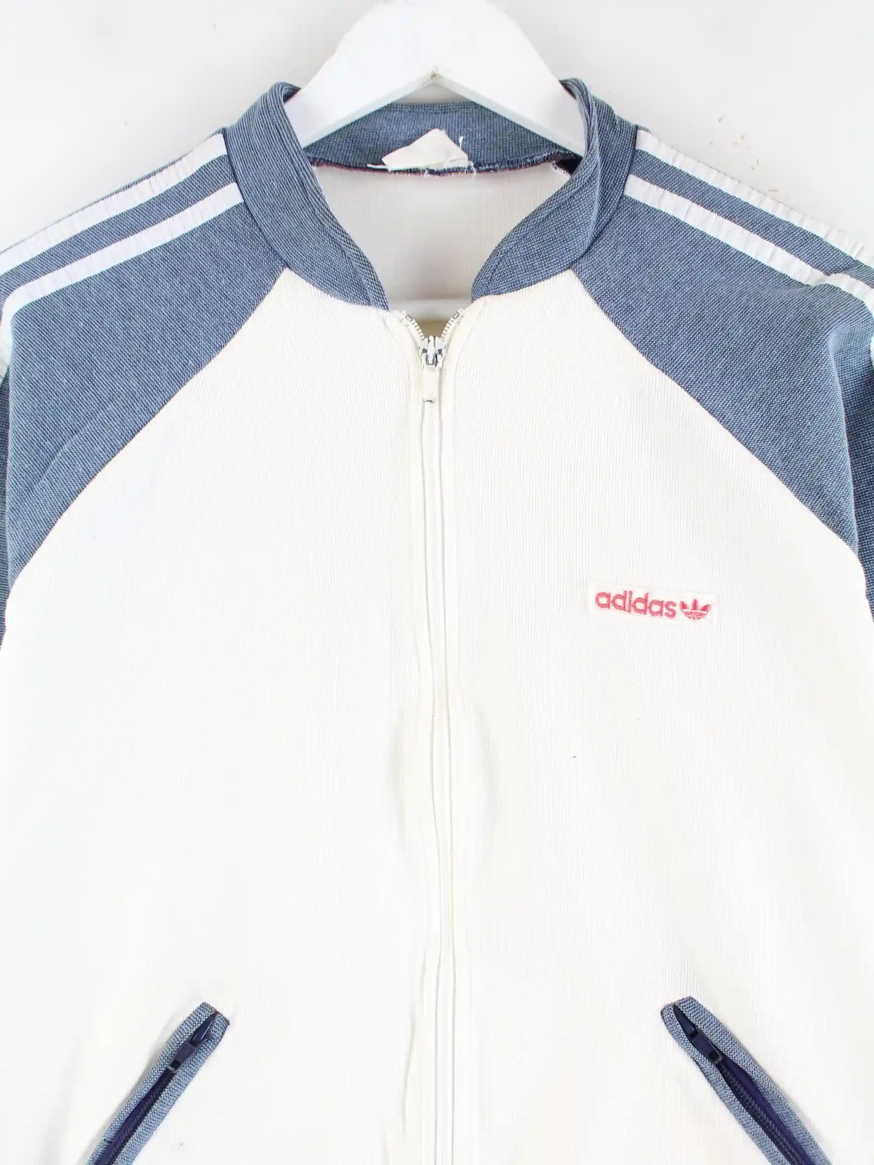 Weiße Trainingsjacke vom Brand Adidas aus den 80'ern in Größe S. Sie ist aus Synthetik produziert und in gutem Zustand auf Lager.