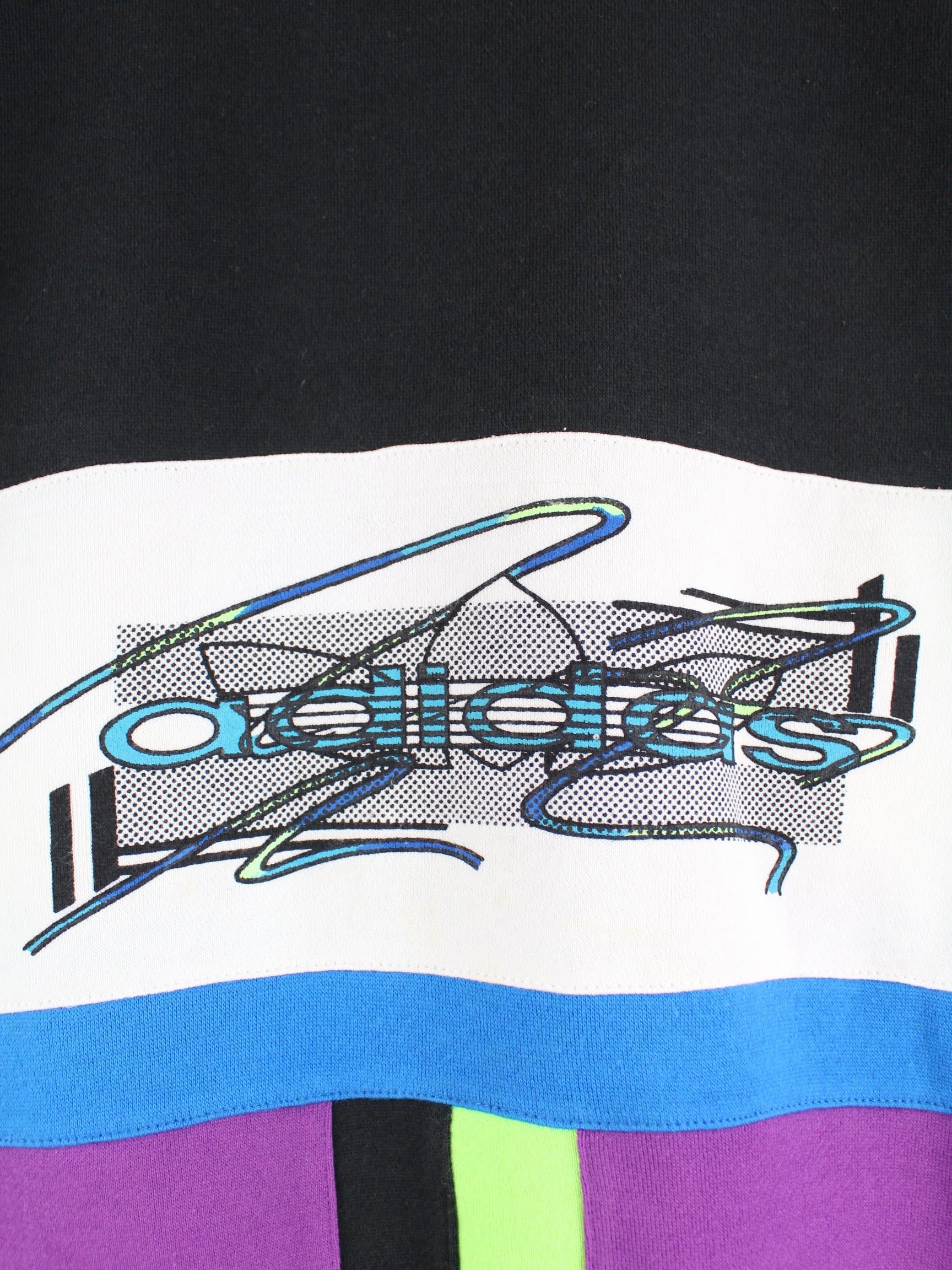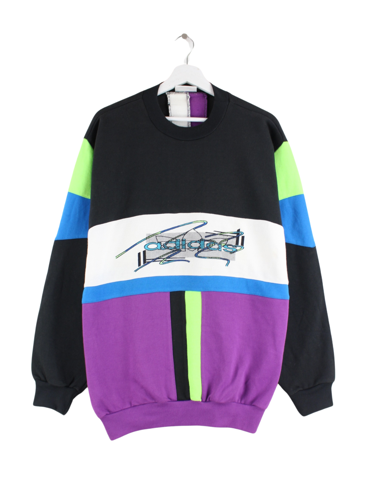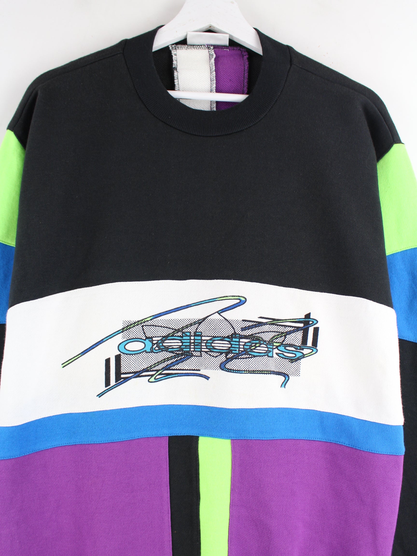 Sweater von Adidas in Größe XL aus den 80'ern. Er ist aus einer Baumwollmischung angefertigt und in bunten Farben im Angebot. Mit schickem Vintage Print.