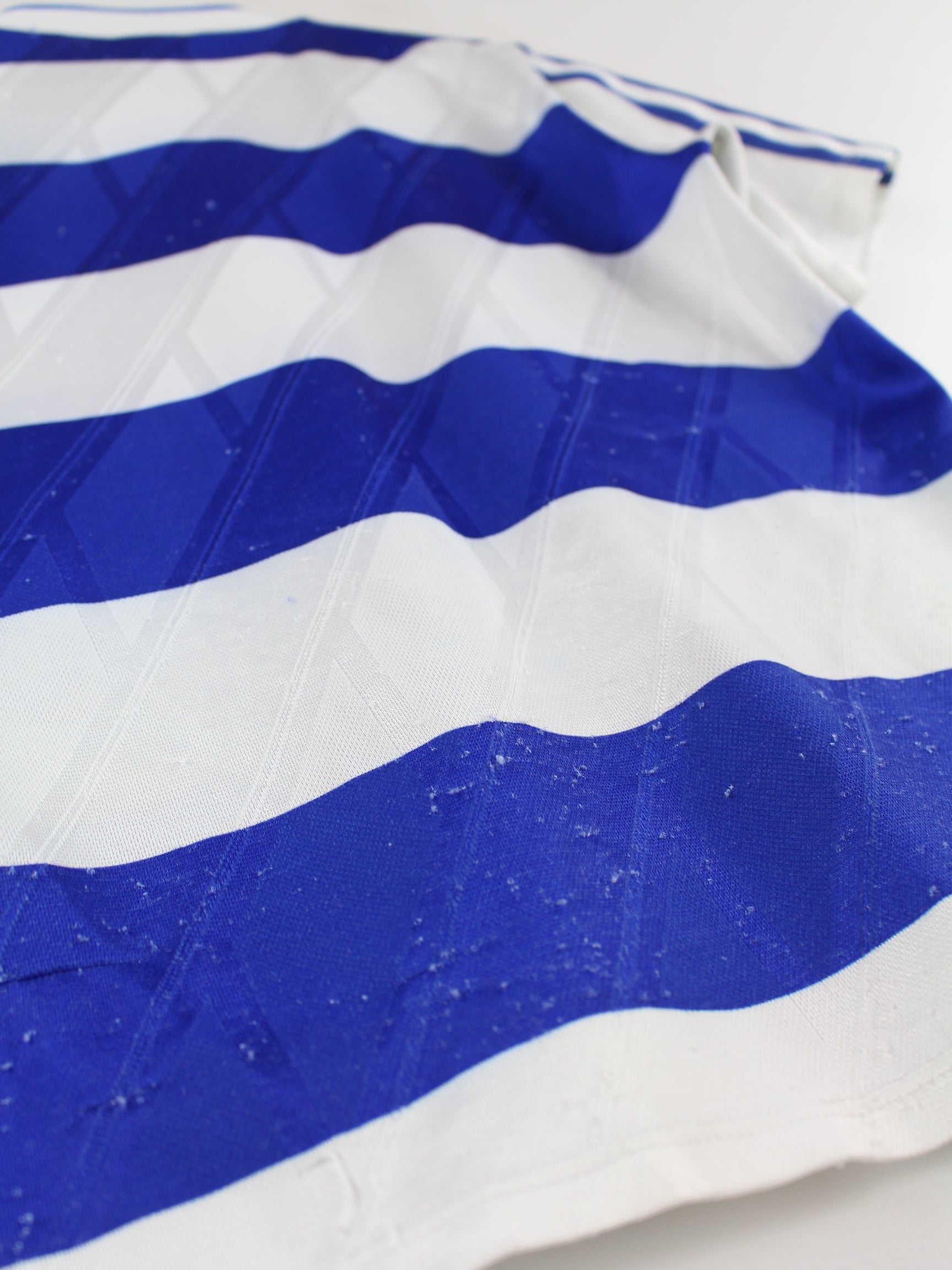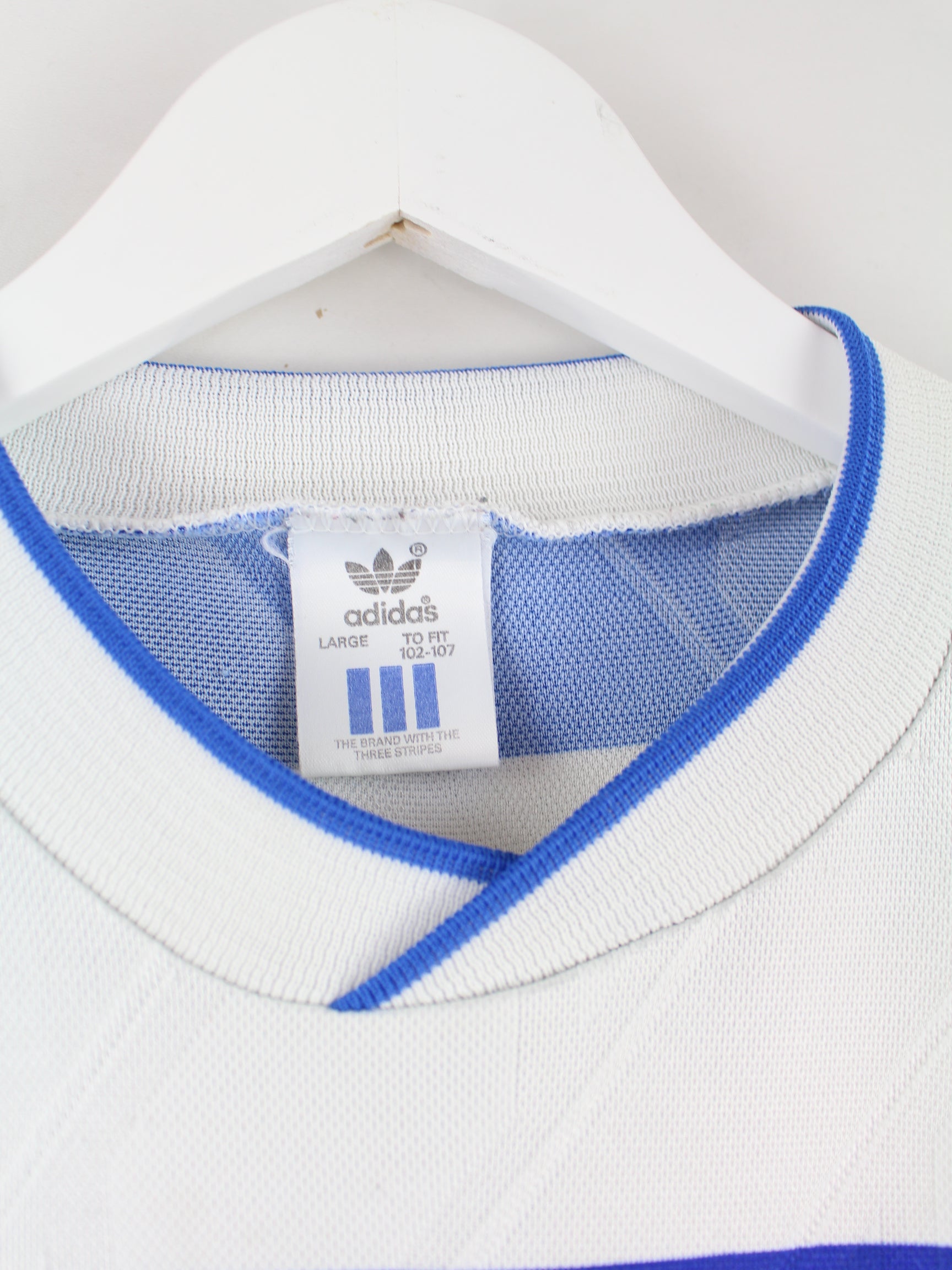 Blaues Trikot von Adidas aus den 80'ern in Größe . Es ist aus Synthetik produziert. Den Zustand würden wir als 'In Ordnung' bezeichnen (vergl. Bilder).