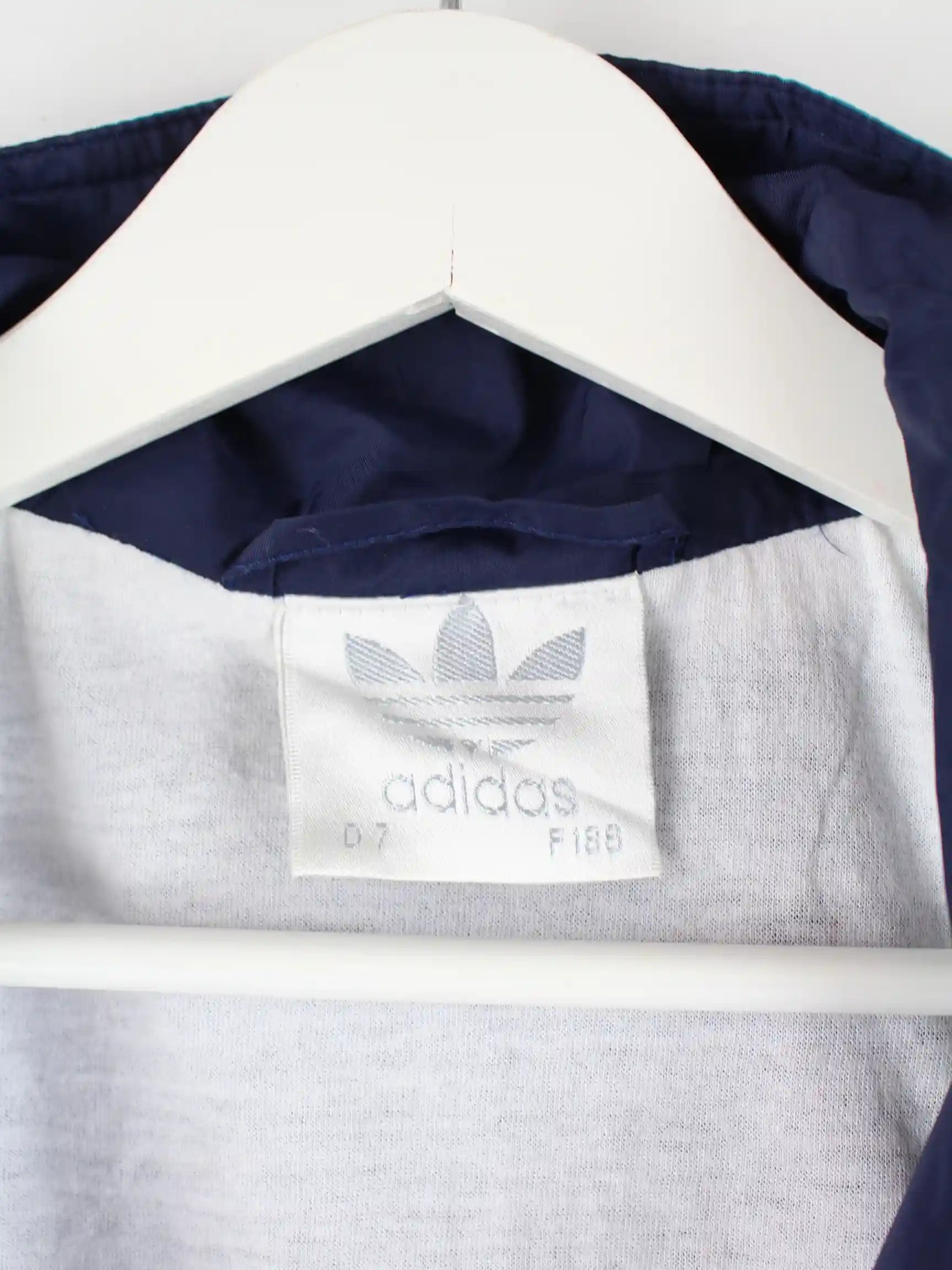 Trainingsjacke der Brand Adidas in Größe XXL aus den 80'ern. Sie ist aus Synthetik gefertigt und in Blau bei uns zu bekommen.