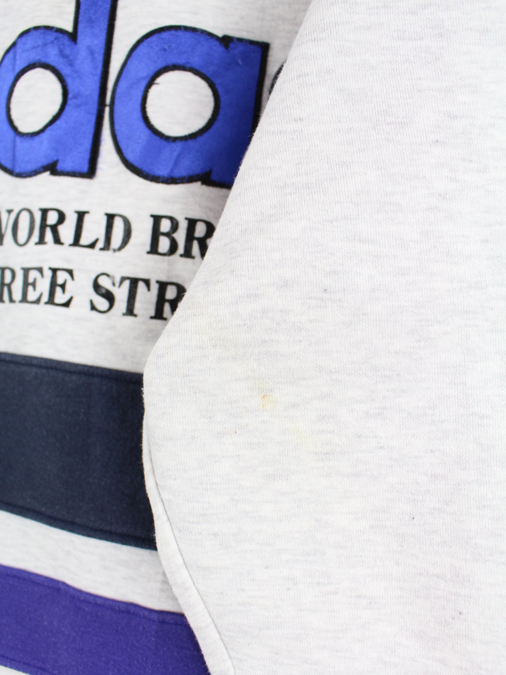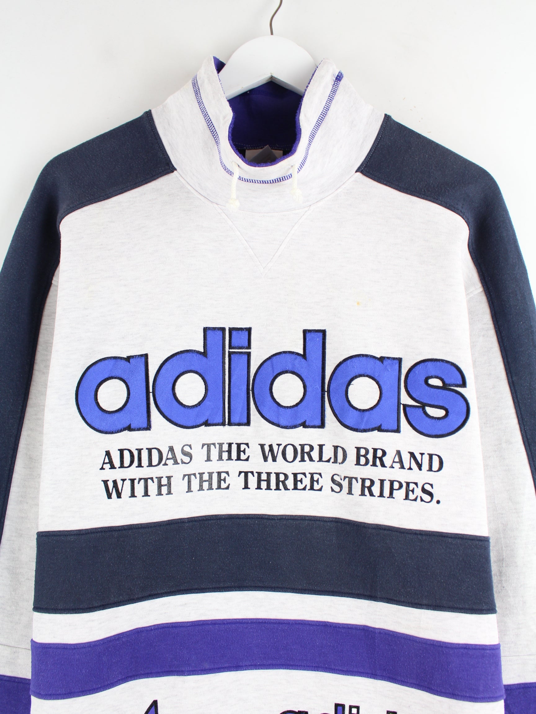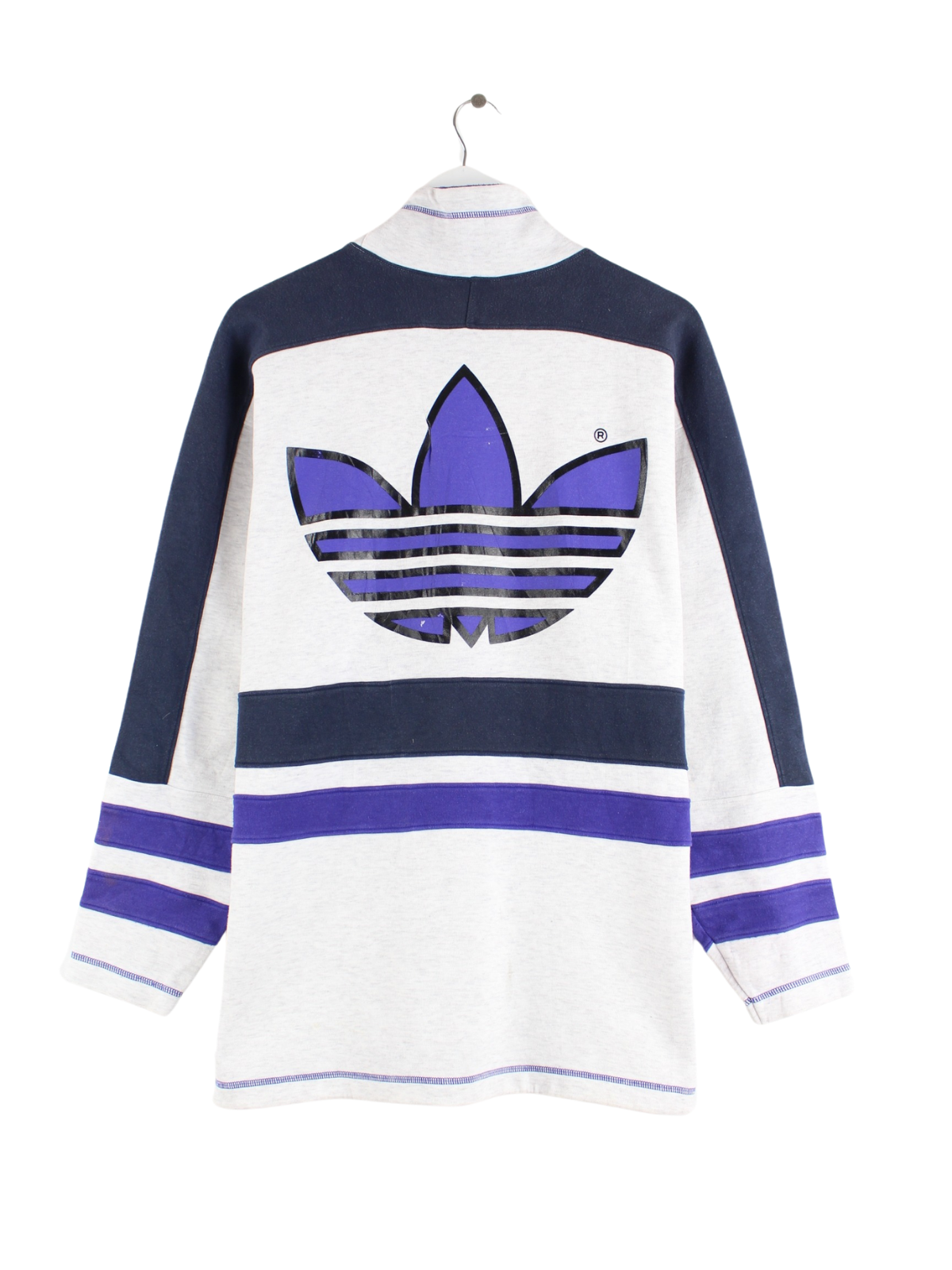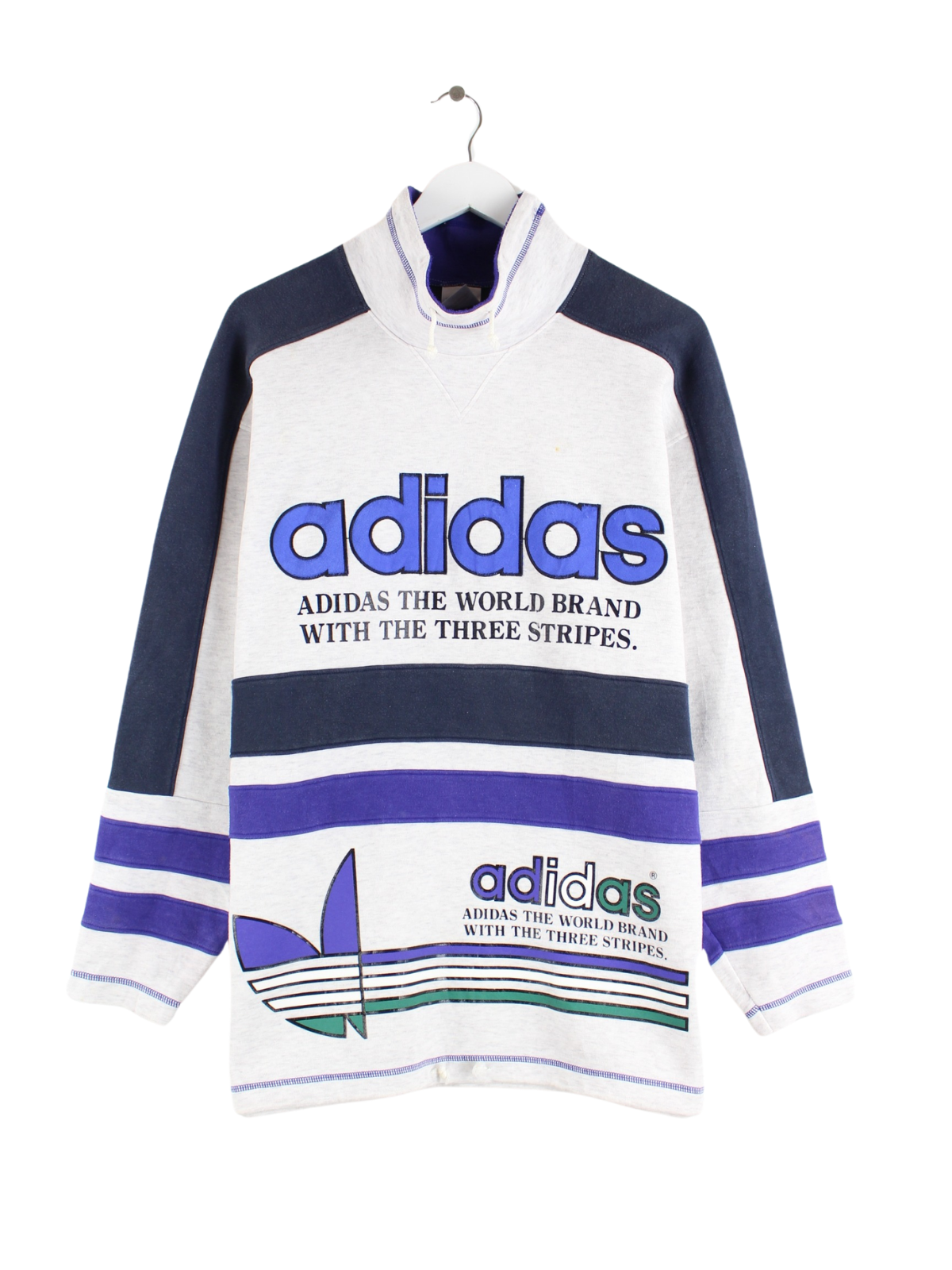 Grauer Sweater von Adidas aus den 90'ern in Größe L. Er ist aus einer Baumwollmischung gemacht. Den Zustand würden wir als 'In Ordnung' bezeichnen (vergl. Bilder).Mit schönem Trefoil Print.