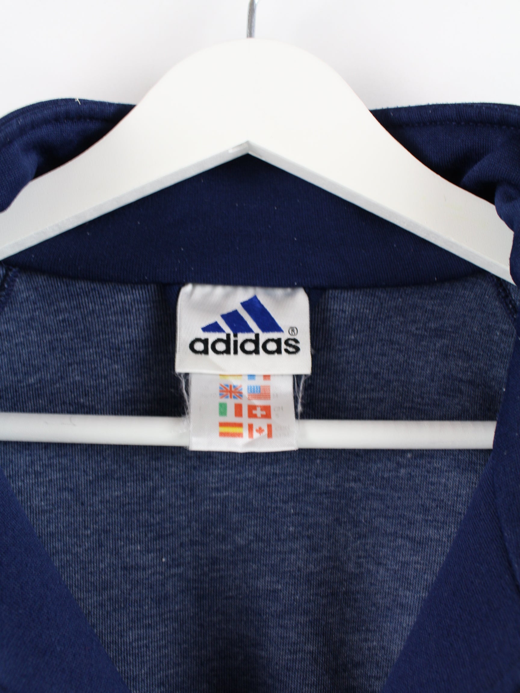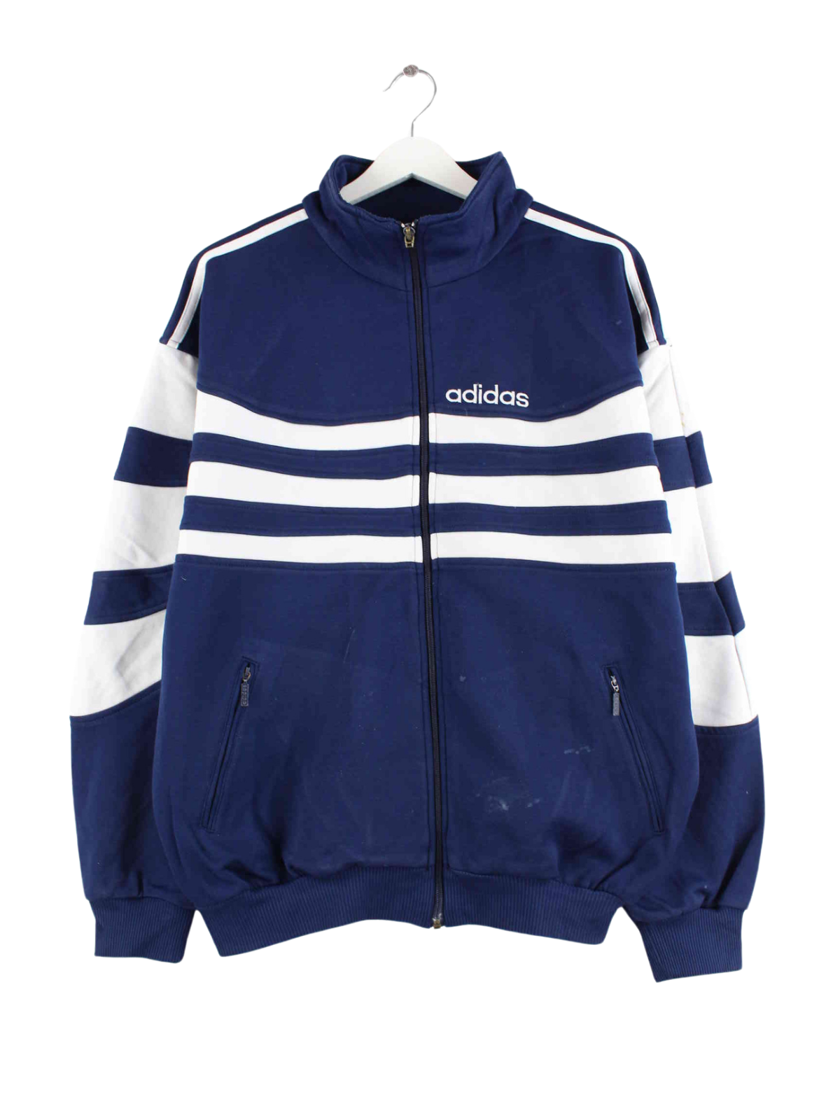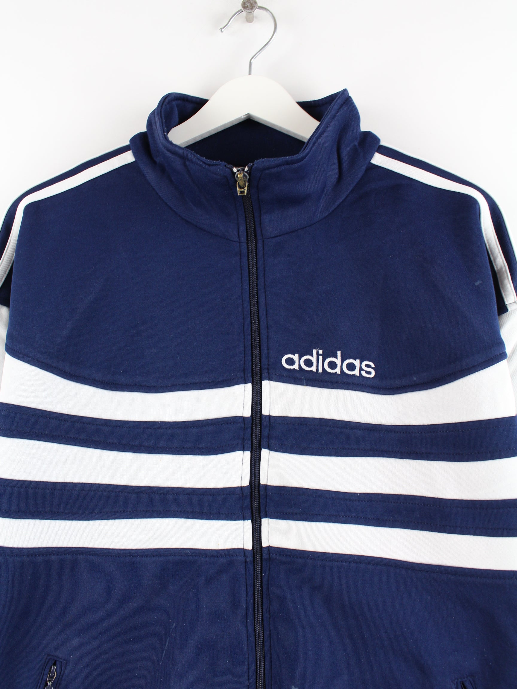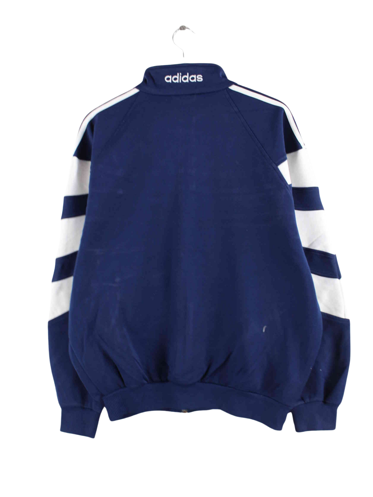 Blaue Trainingsjacke des Labels Adidas aus den 90'ern in Größe M. Sie ist aus Synthetik hergestellt. Den Zustand würden wir als 'In Ordnung' bezeichnen (vergl. Bilder).