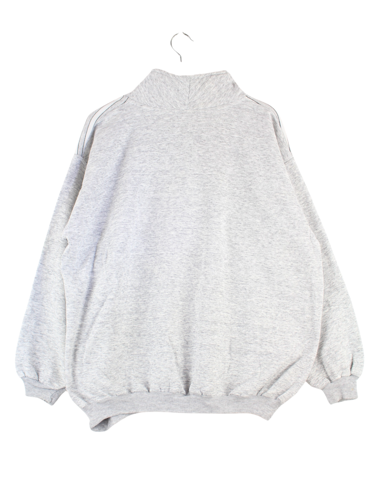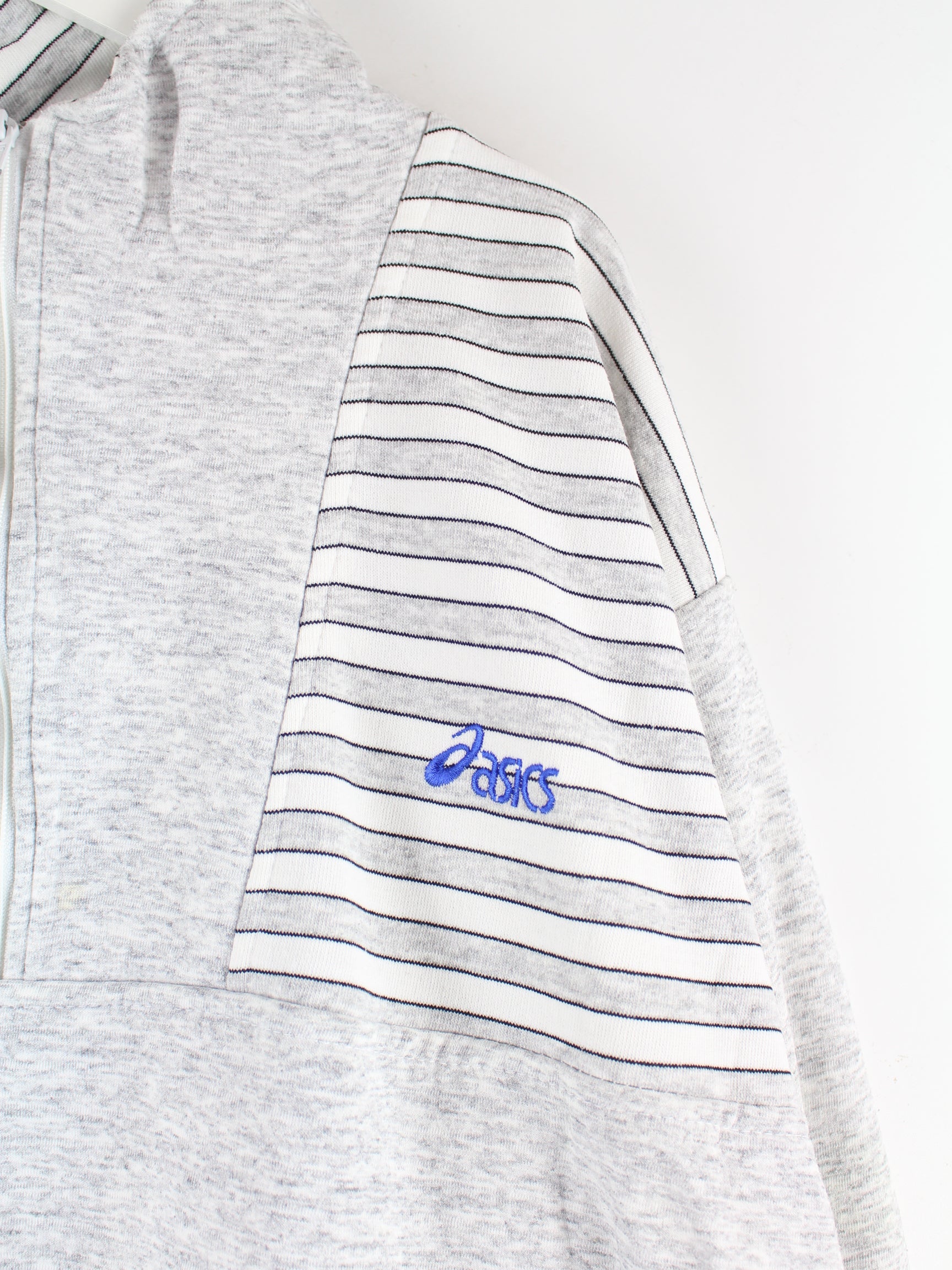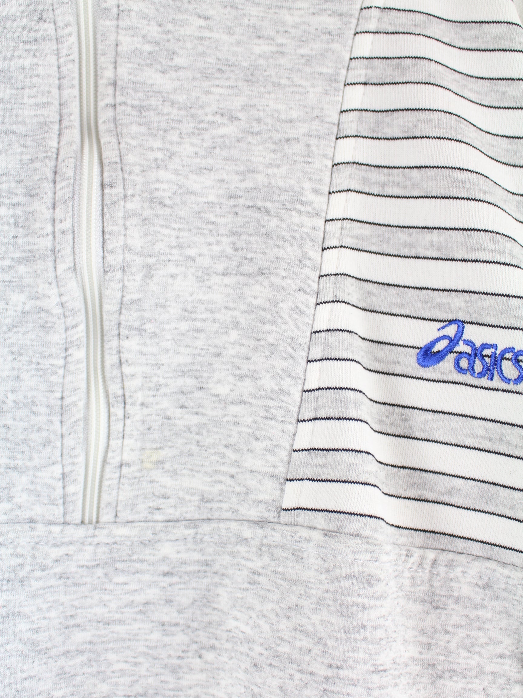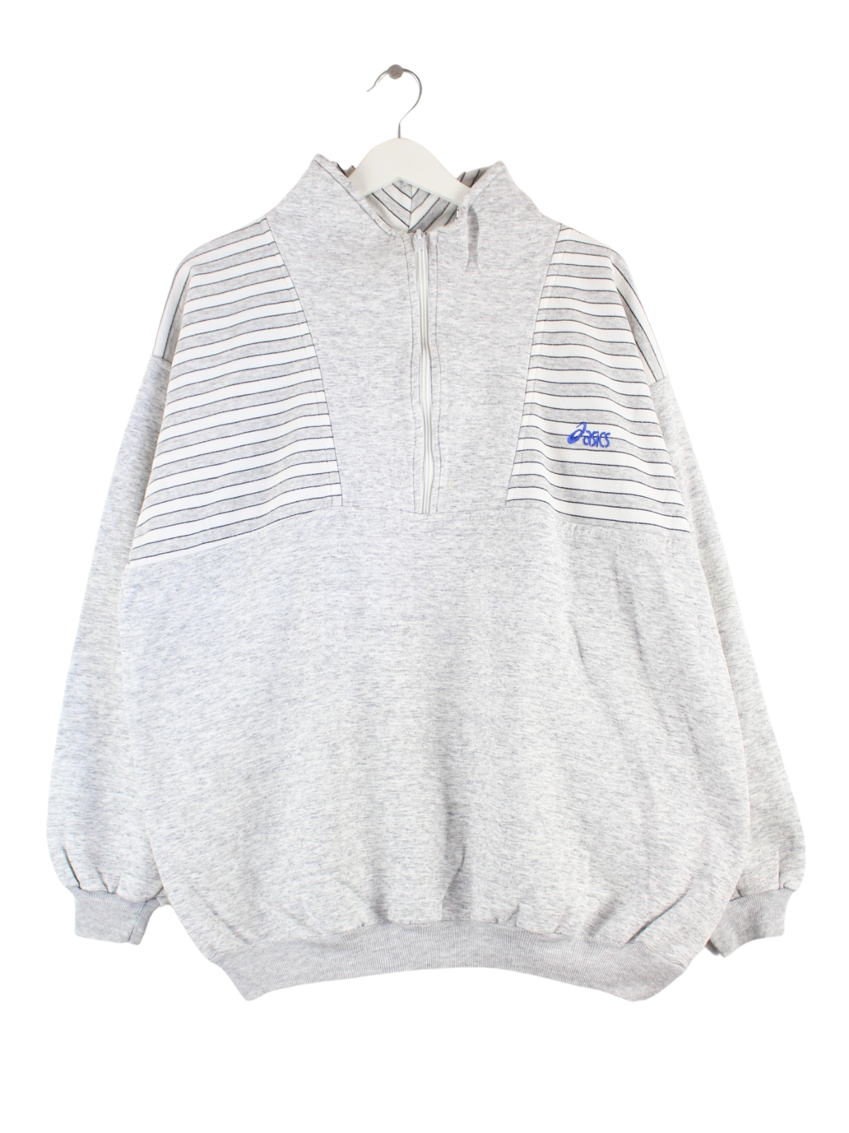 Grauer Sweater mit Stick und halbem Reißverschluß der Brand Asics aus den 90'ern in Größe L. Er ist aus einer Baumwollmischung produziert. Den Zustand würden wir als 'In Ordnung' bezeichnen (vergl. Bilder).