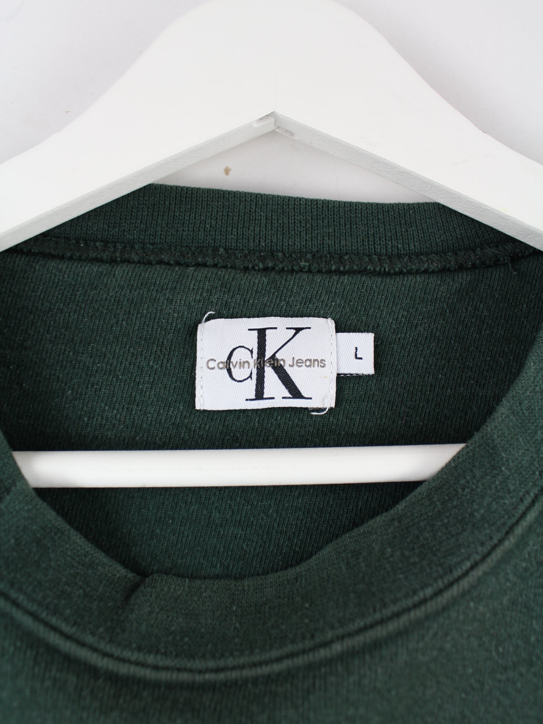 Sweater des Labels Calvin Klein mit Stickereien in Größe L aus den 90'ern. Er ist aus einer Baumwollmischung angefertigt und in Grün zu bekommen.