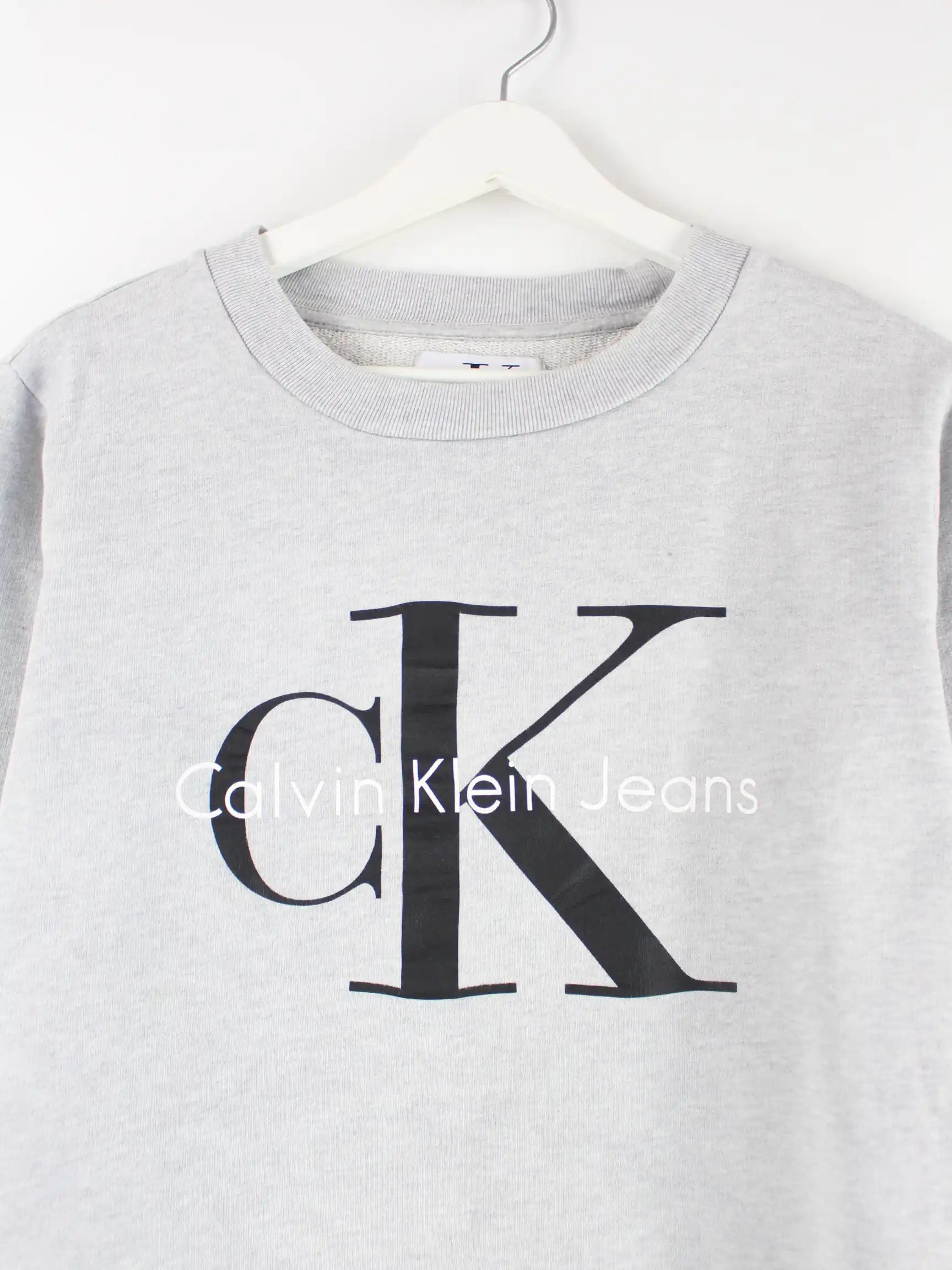 Grauer Sweater vom Label Calvin Klein in Größe M. Er ist aus einer Baumwollmischung produziert und in sehr gutem Zustand lieferbar. Mit schönem Logo Print.