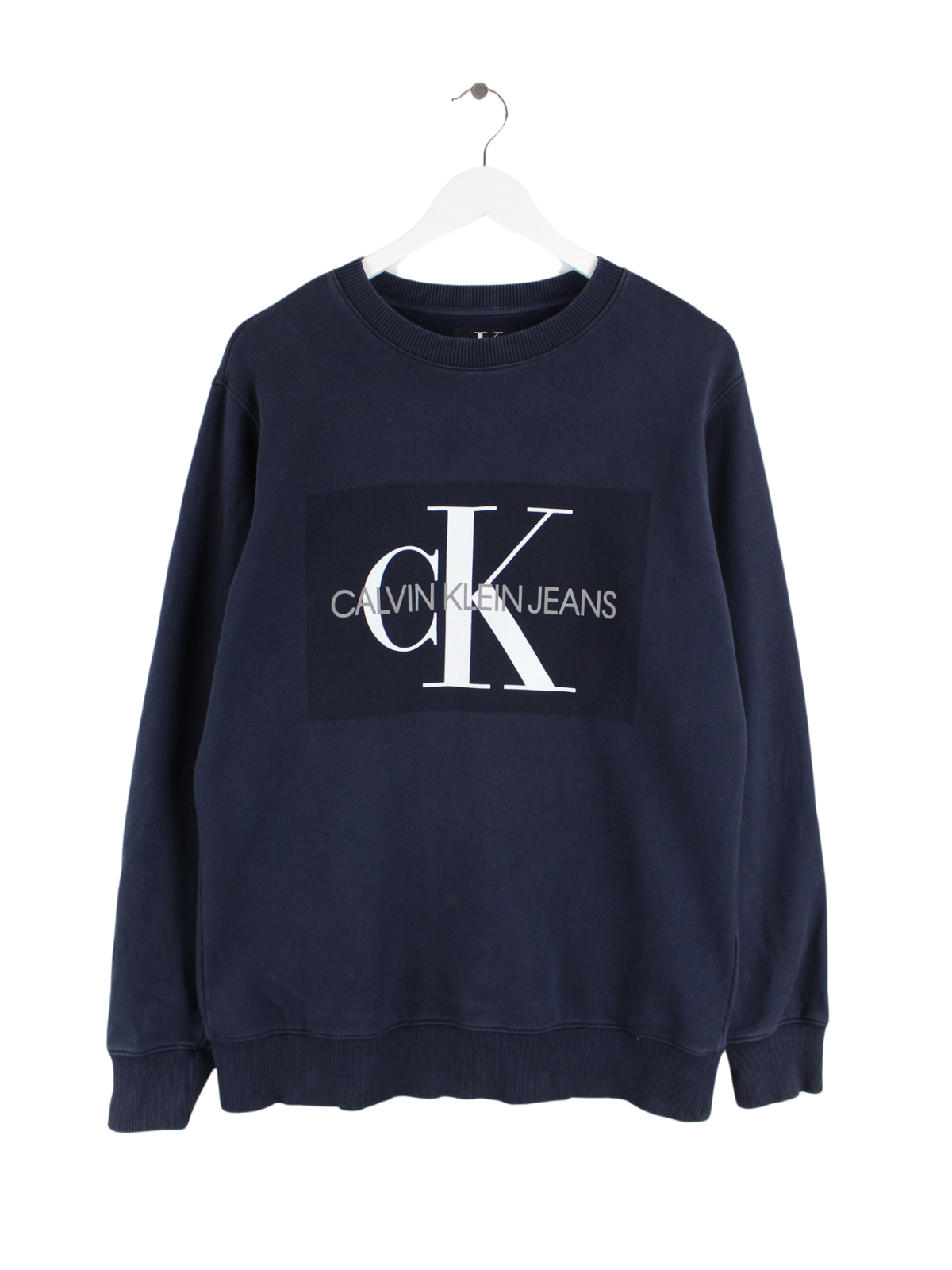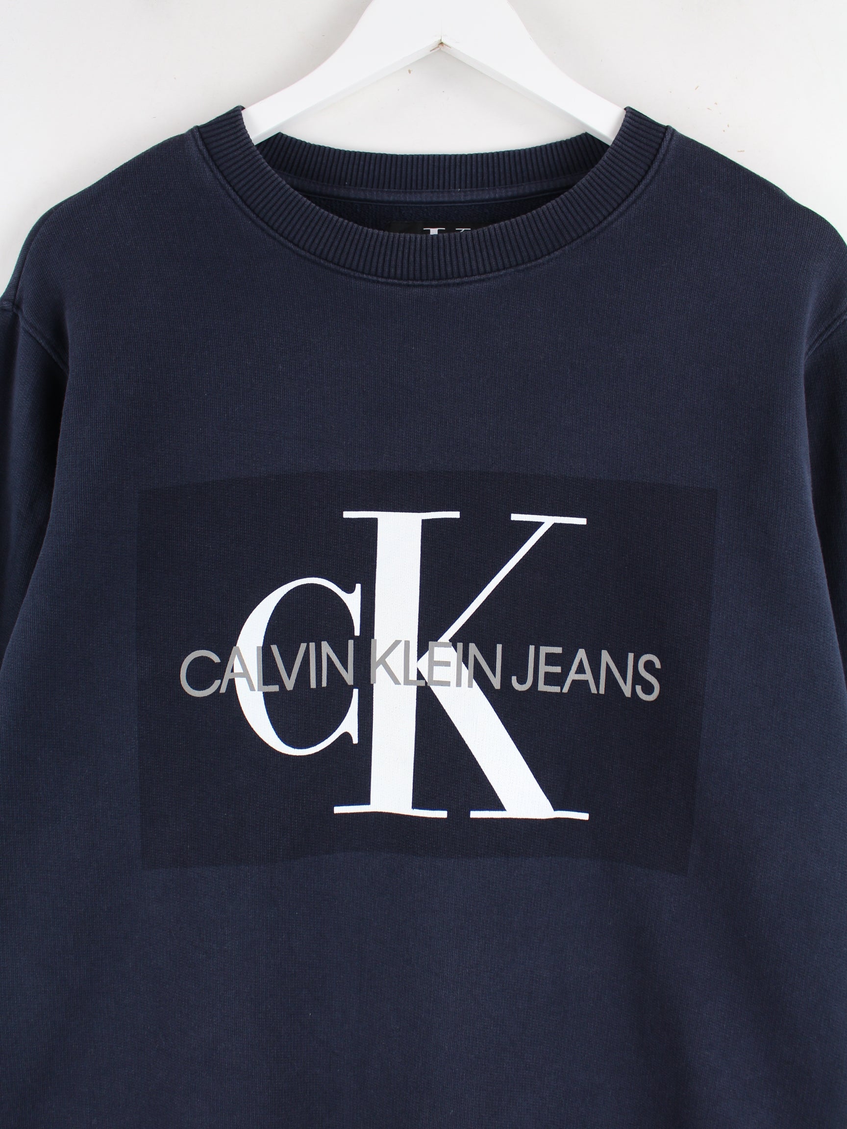 Blauer Sweater des Labels Calvin Klein in Größe M. Er ist aus einer Baumwollmischung und in gutem Zustand im Bestand. Mit schönem Print.