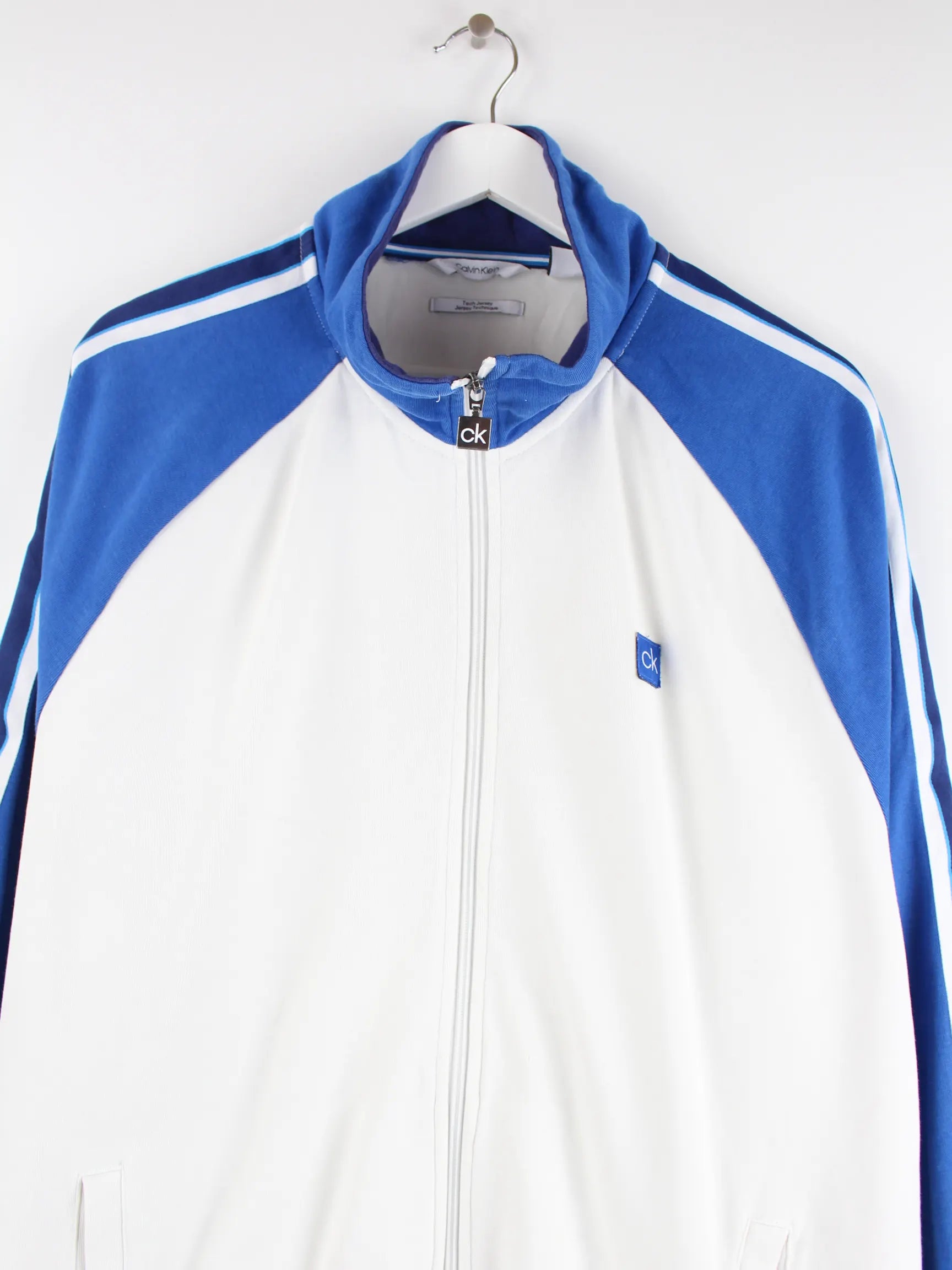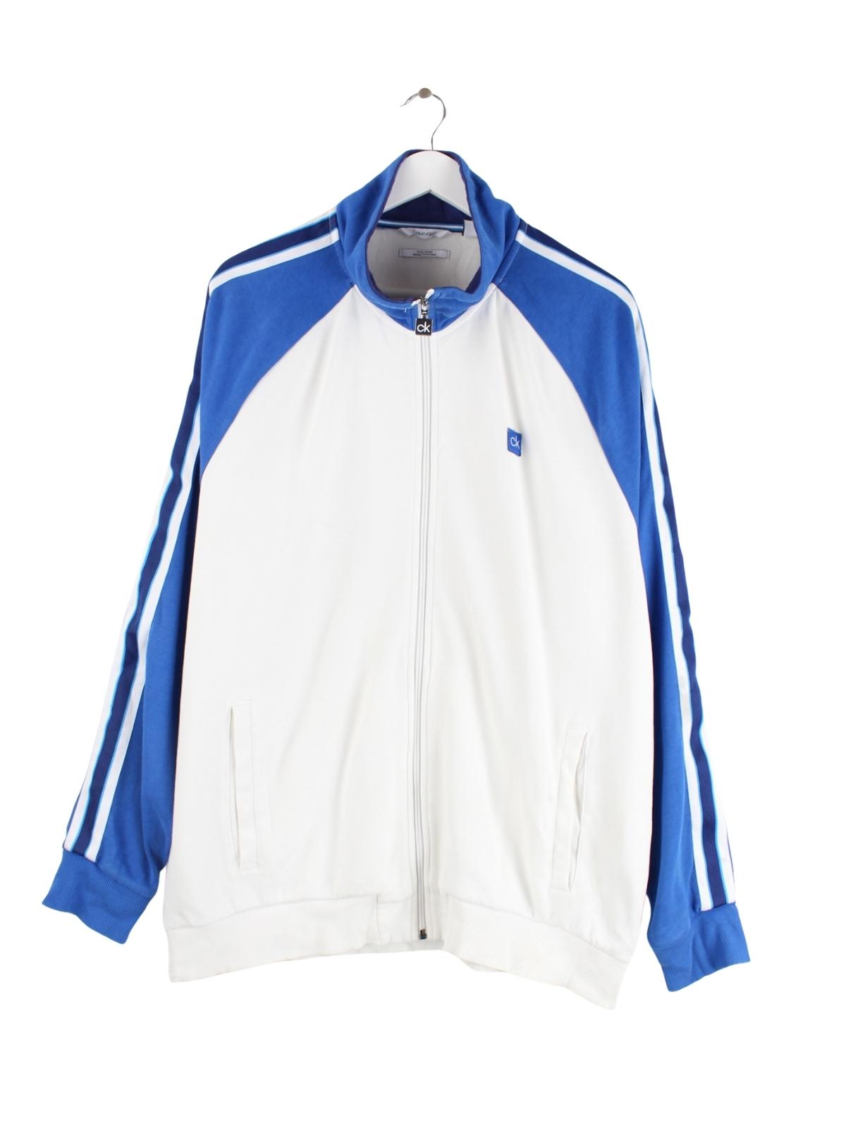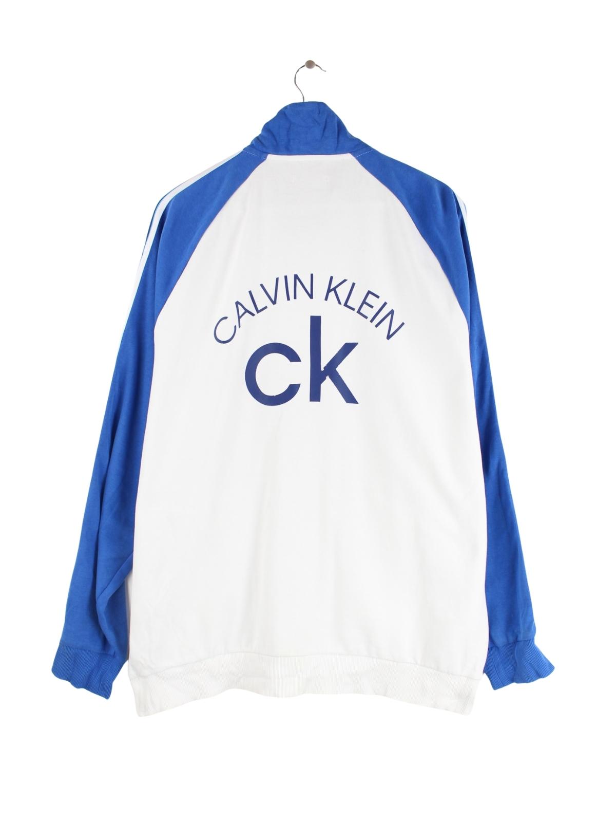 Weiße Sweatjacke von Calvin Klein in Größe XXL. Sie ist aus einer Baumwollmischung produziert. Den Zustand würden wir als 'In Ordnung' bezeichnen (vergl. Bilder).Mit schickem Jersey Print.