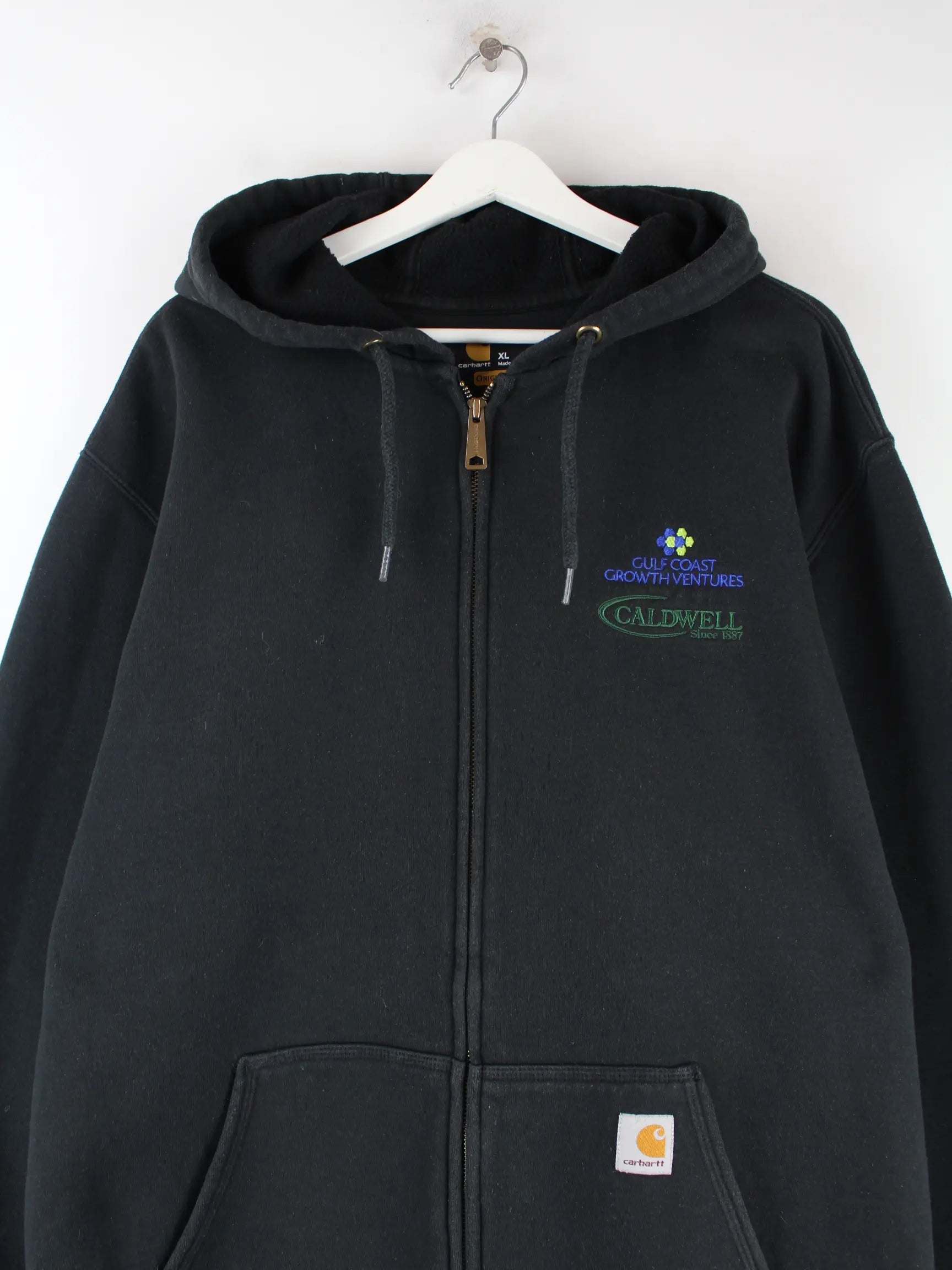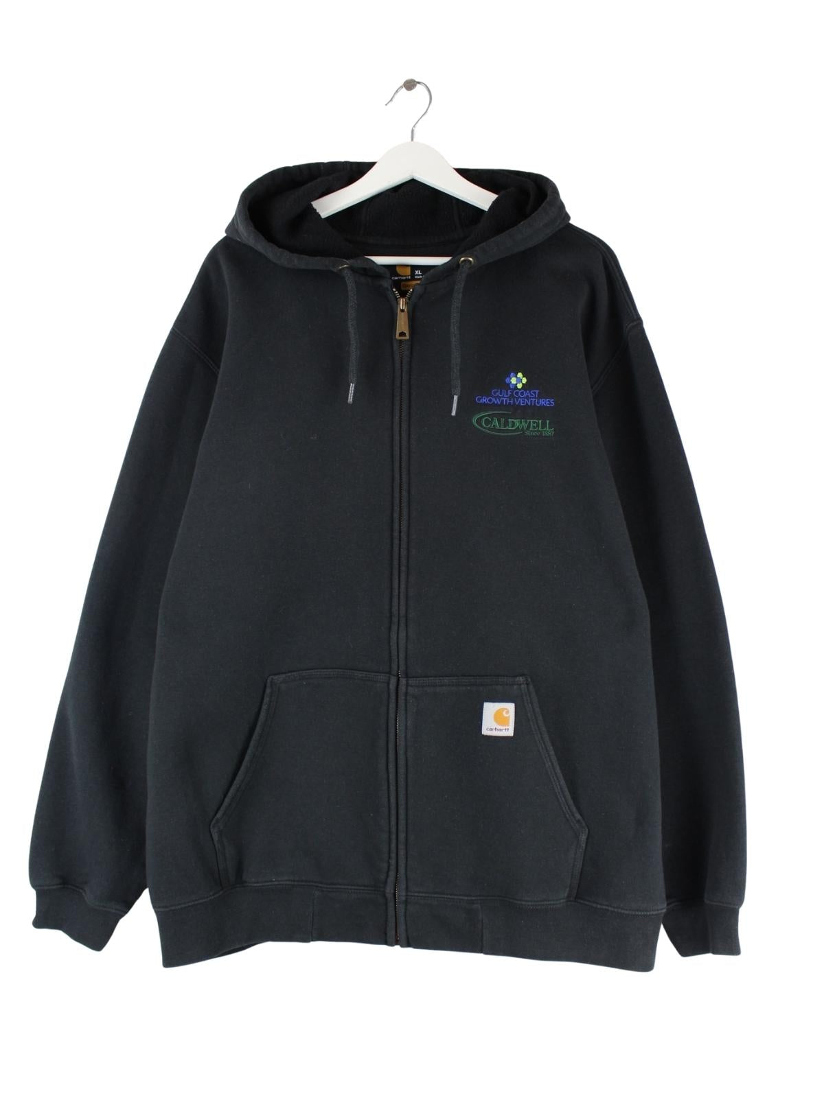 Hoodie von Carhartt mit Stick und Reißverschluß in Größe XL. Er ist aus einer Baumwollmischung hergestellt und in Schwarz auf Lager.