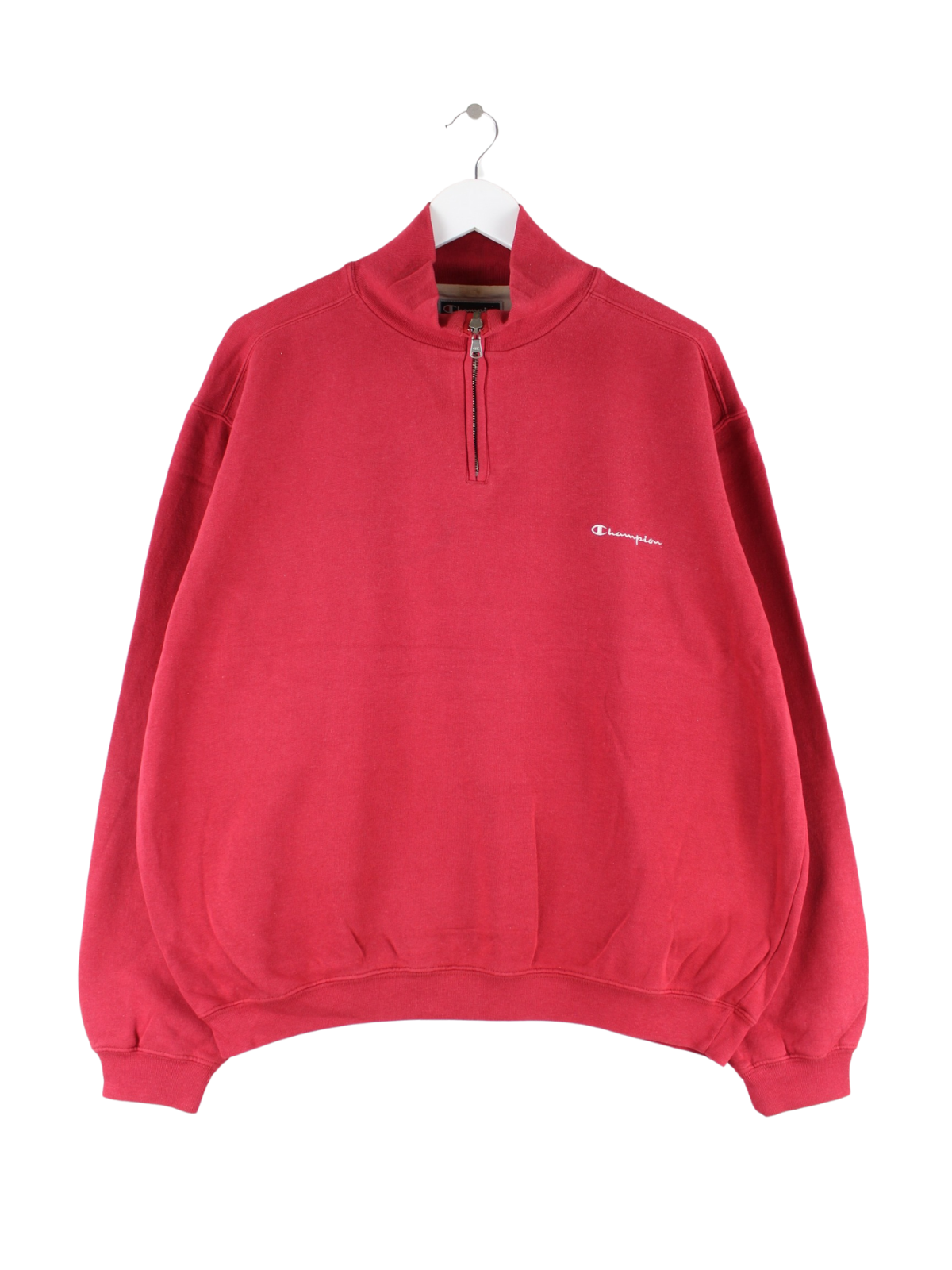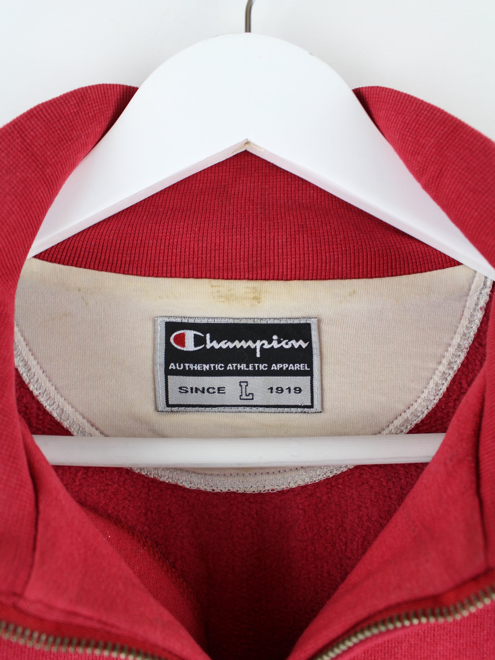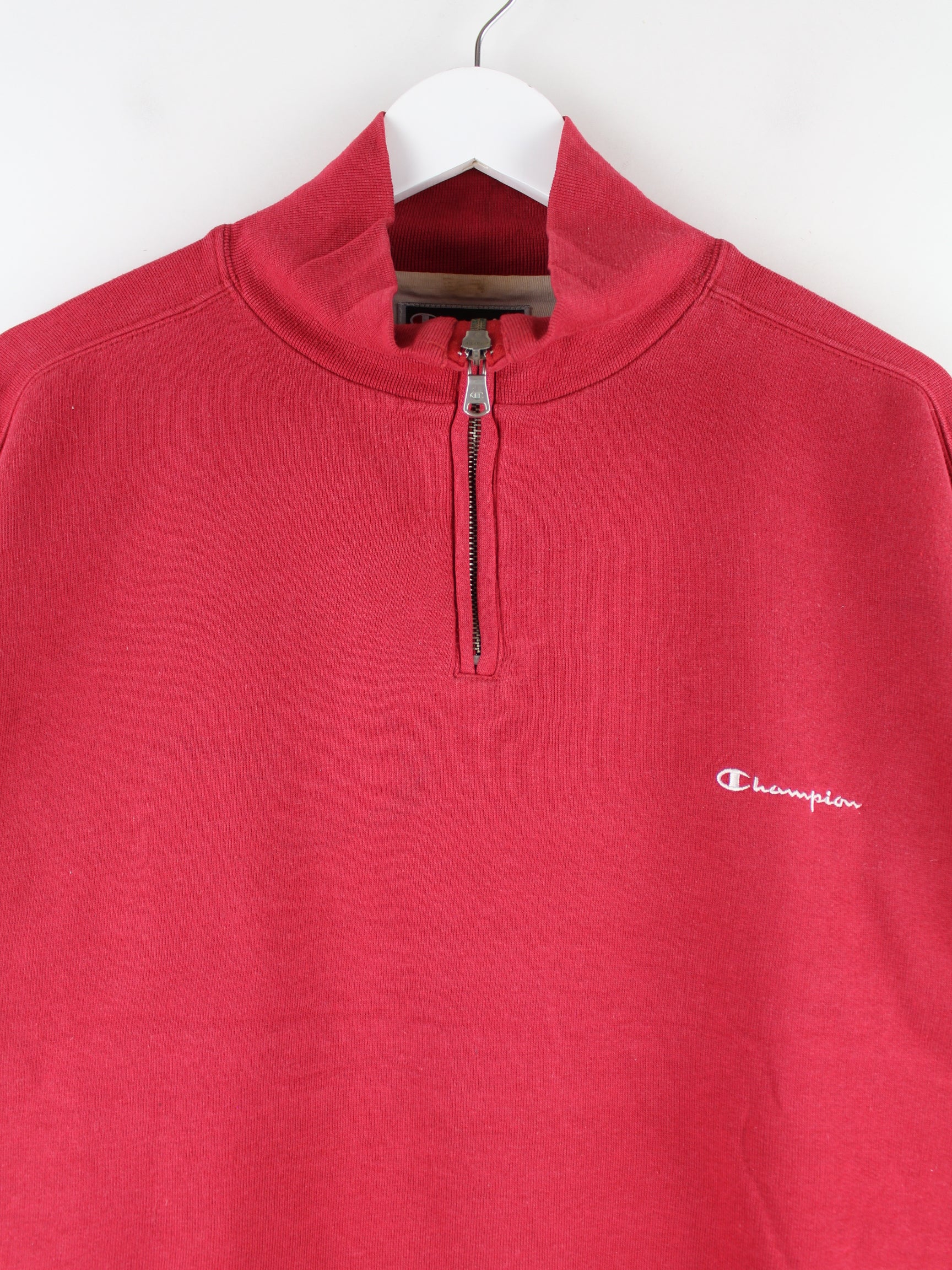 Roter Sweater mit kurzem Reißverschluß vom Brand Champion in Größe L. Er ist aus einer Baumwollmischung hergestellt und in gutem Zustand vorrätig.