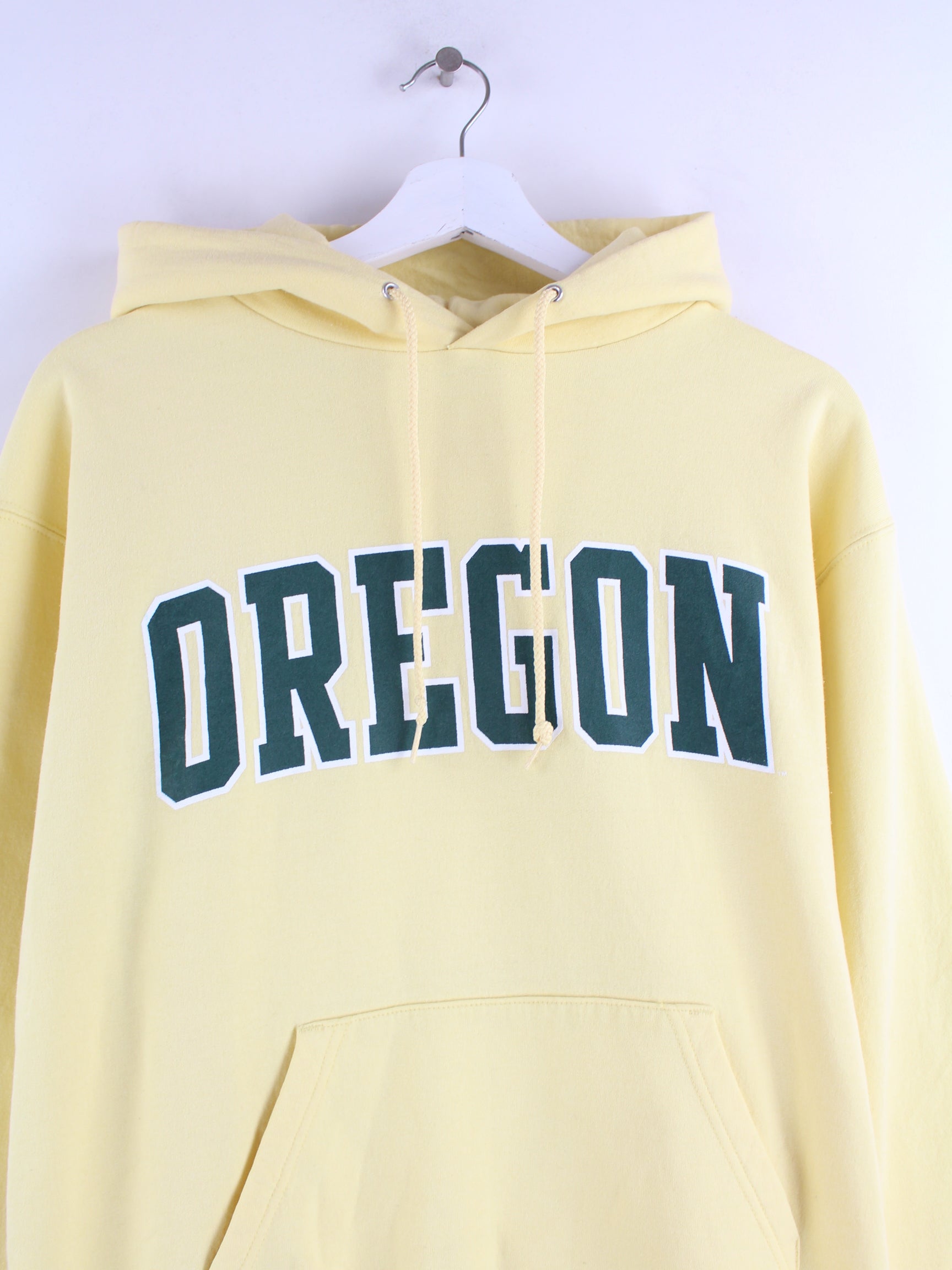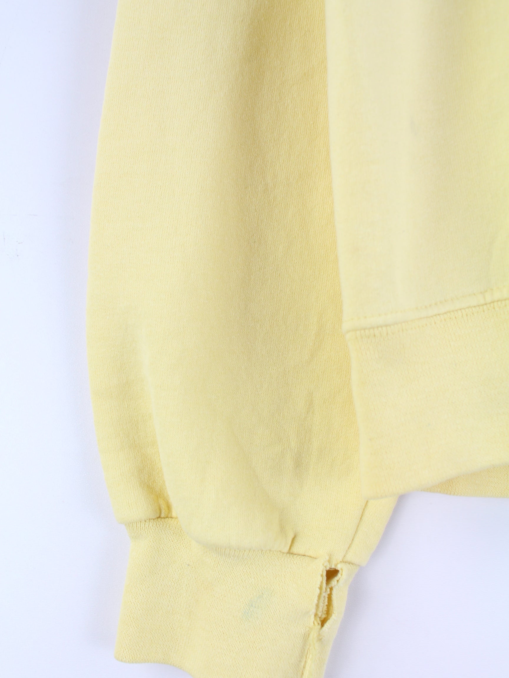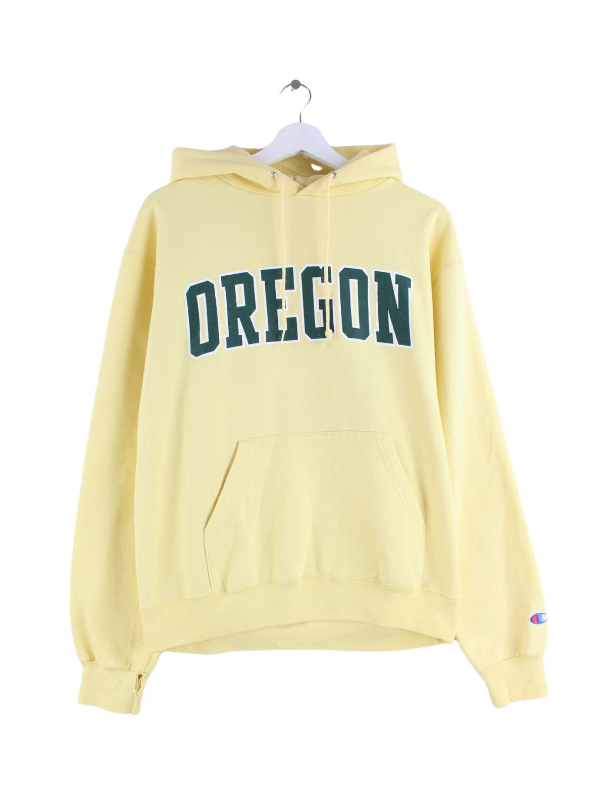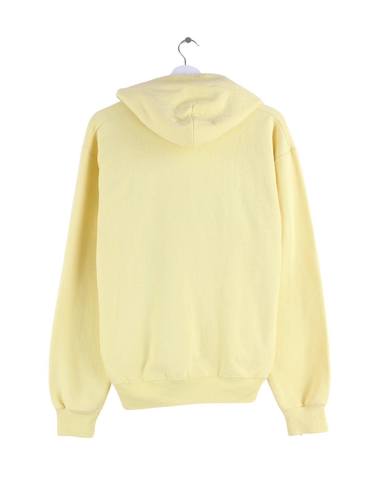 Gelber Hoodie aus dem Hause Champion in Größe M. Er ist aus einer Baumwollmischung gefertigt. Den Zustand würden wir als 'In Ordnung' bezeichnen (vergl. Bilder).