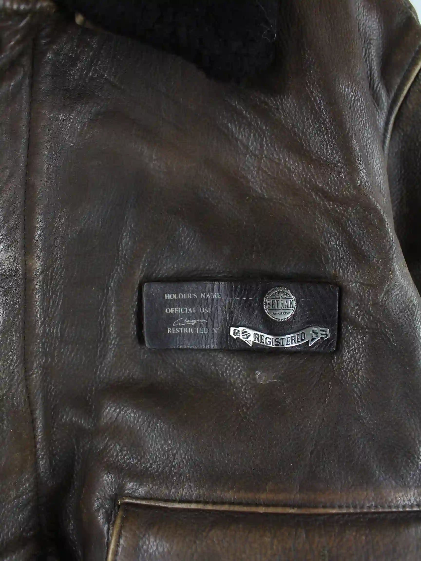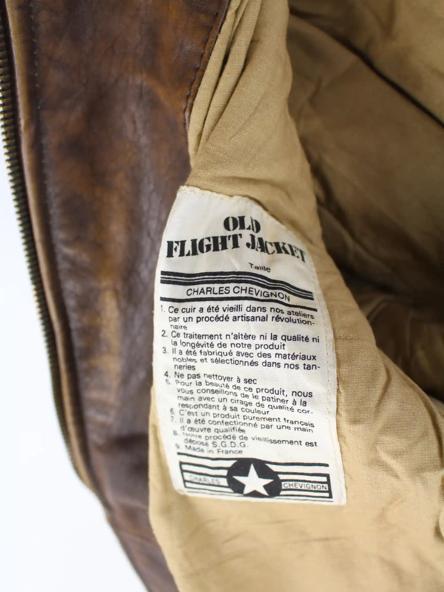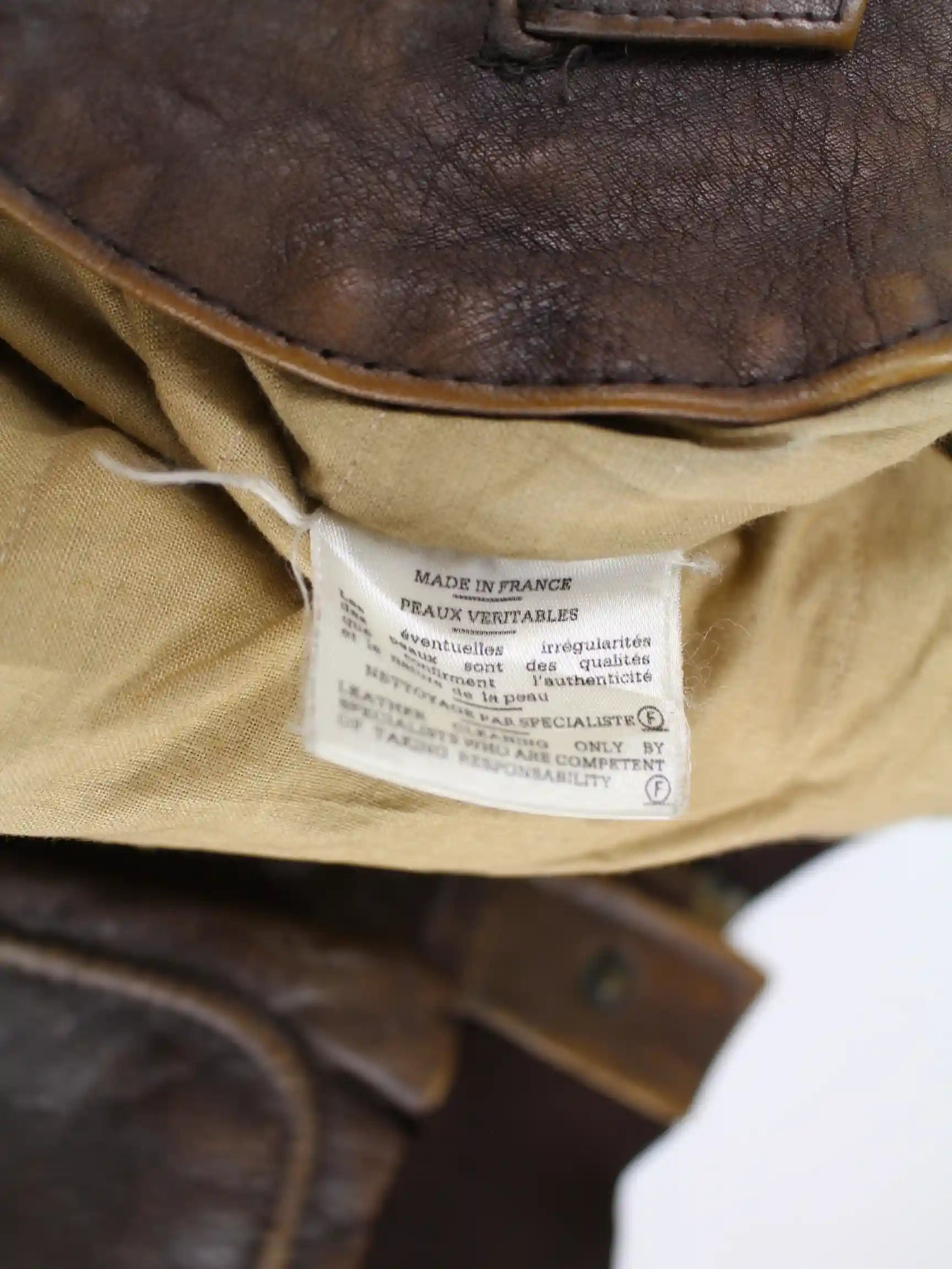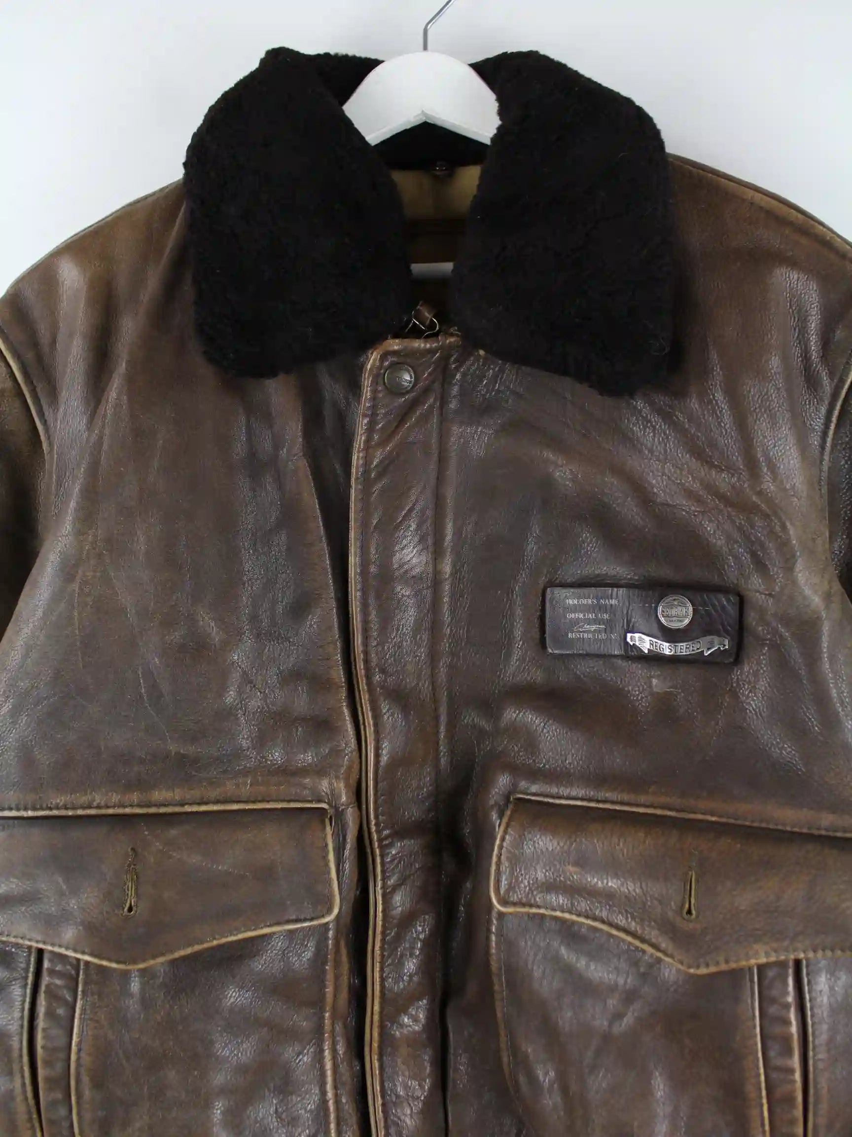 Braune Jacke vom Brand Chevignon aus den 90'ern in Größe L. Sie ist aus Leder produziert und in gutem Zustand bei uns zu bekommen.