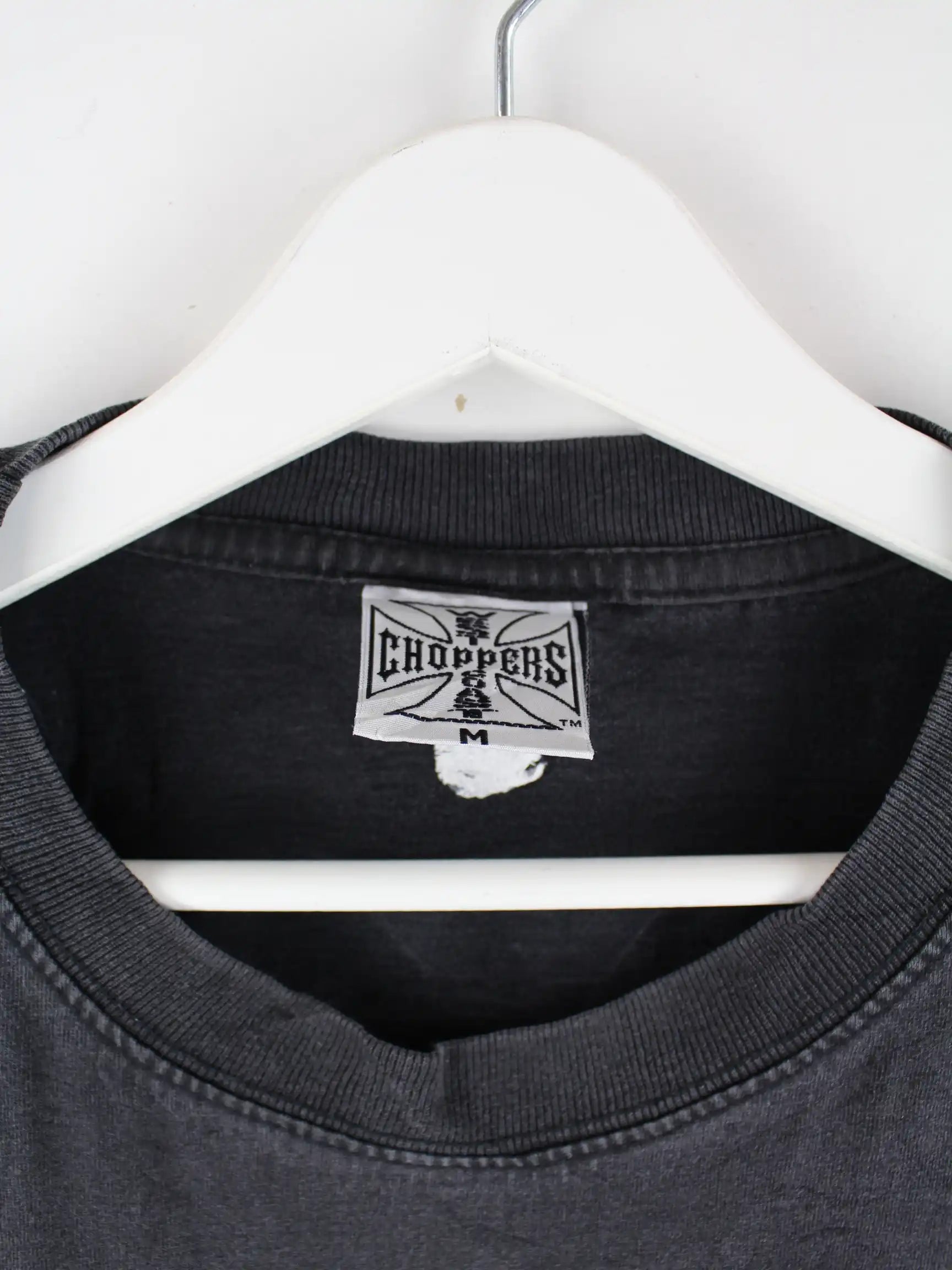T-Shirt des Labels Choppers in Größe M aus den 90'ern. Es ist aus Baumwolle angefertigt und in Schwarz im Bestand. Mit schönem Vintage Print.