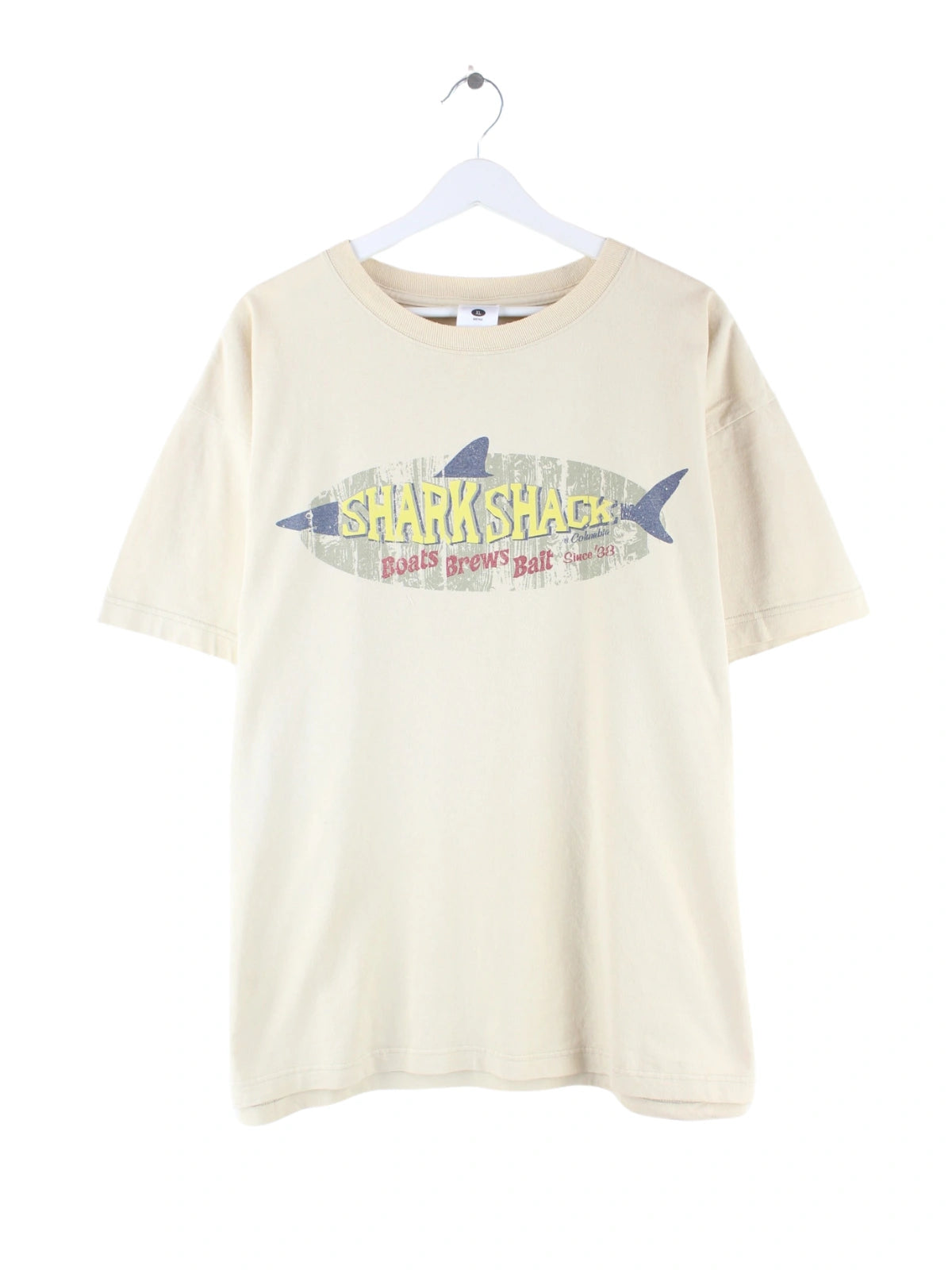 Beigefarbenes T-Shirt des Labels Columbia in Größe XL. Es ist aus einer Baumwollmischung hergestellt und in gutem Zustand im Bestand. Mit chiquem Shack Print.