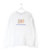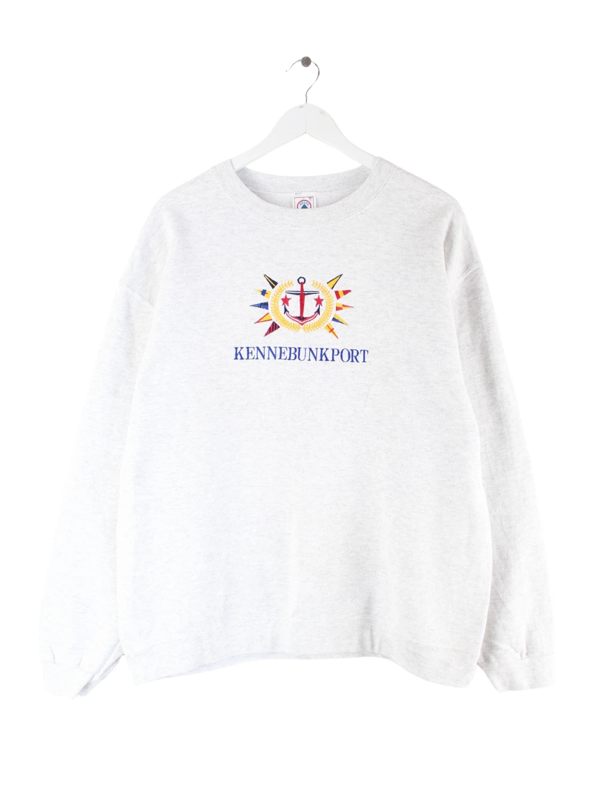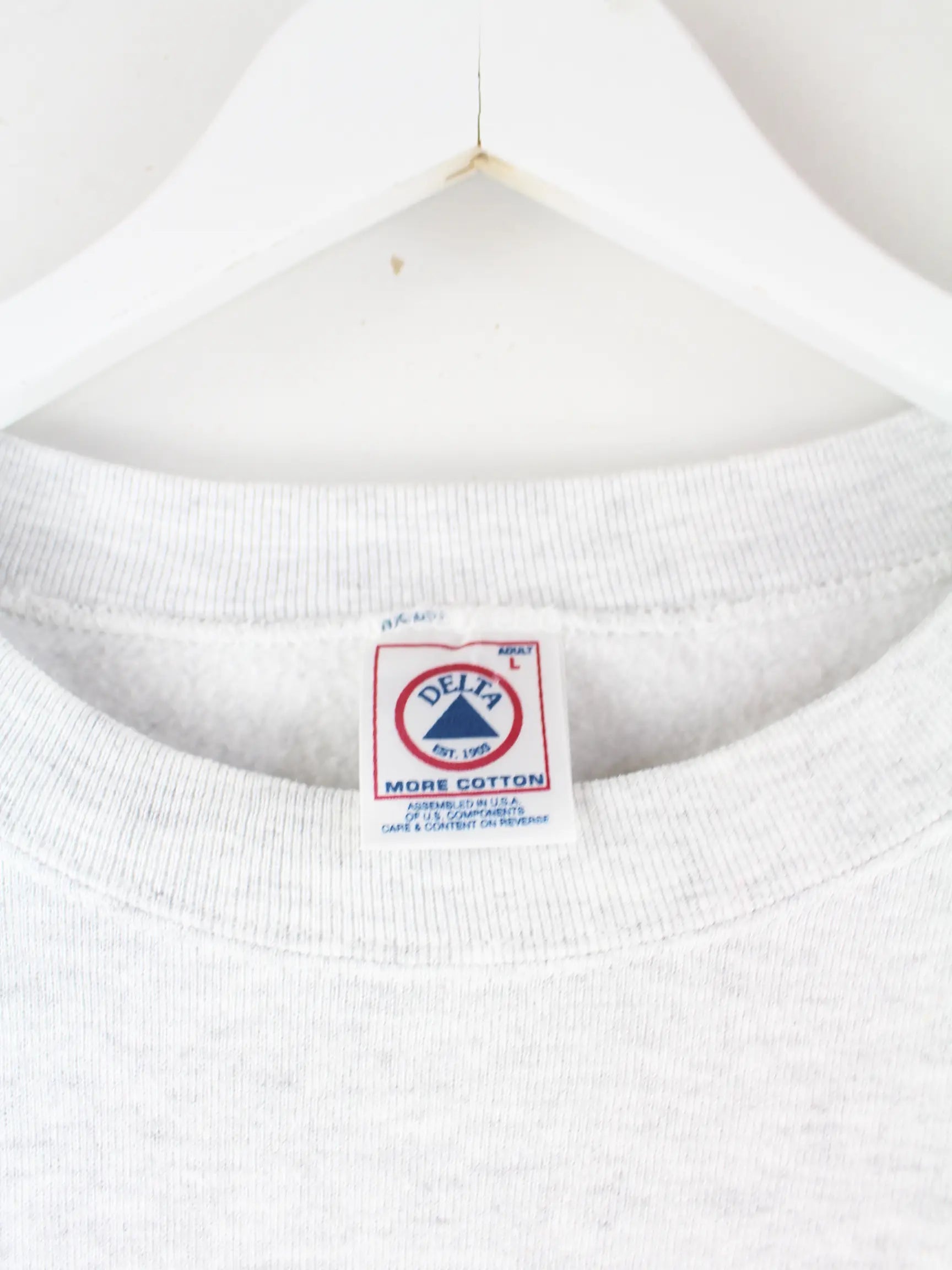 Grauer Sweater von Delta aus den 90'ern in Größe L. Er ist aus einer Baumwollmischung und in gutem Zustand bei uns vorrätig. Mit seltenem Sail Print.