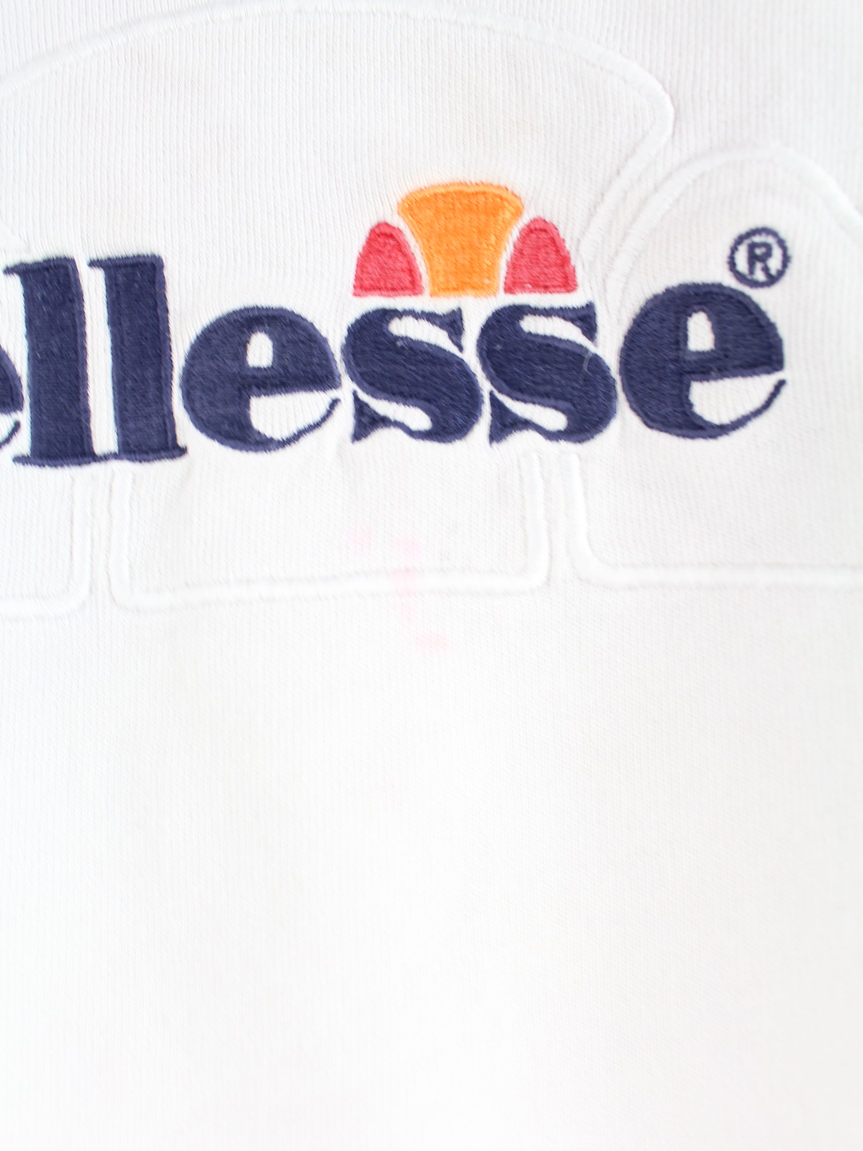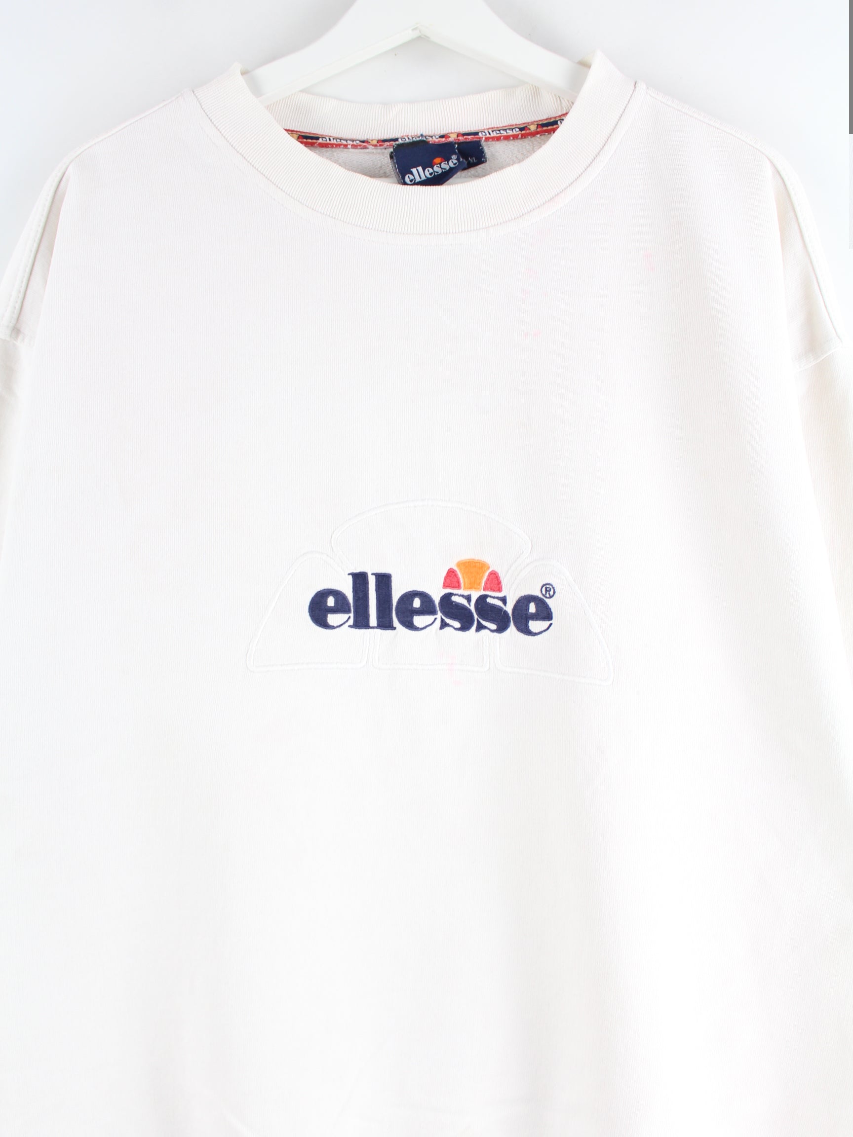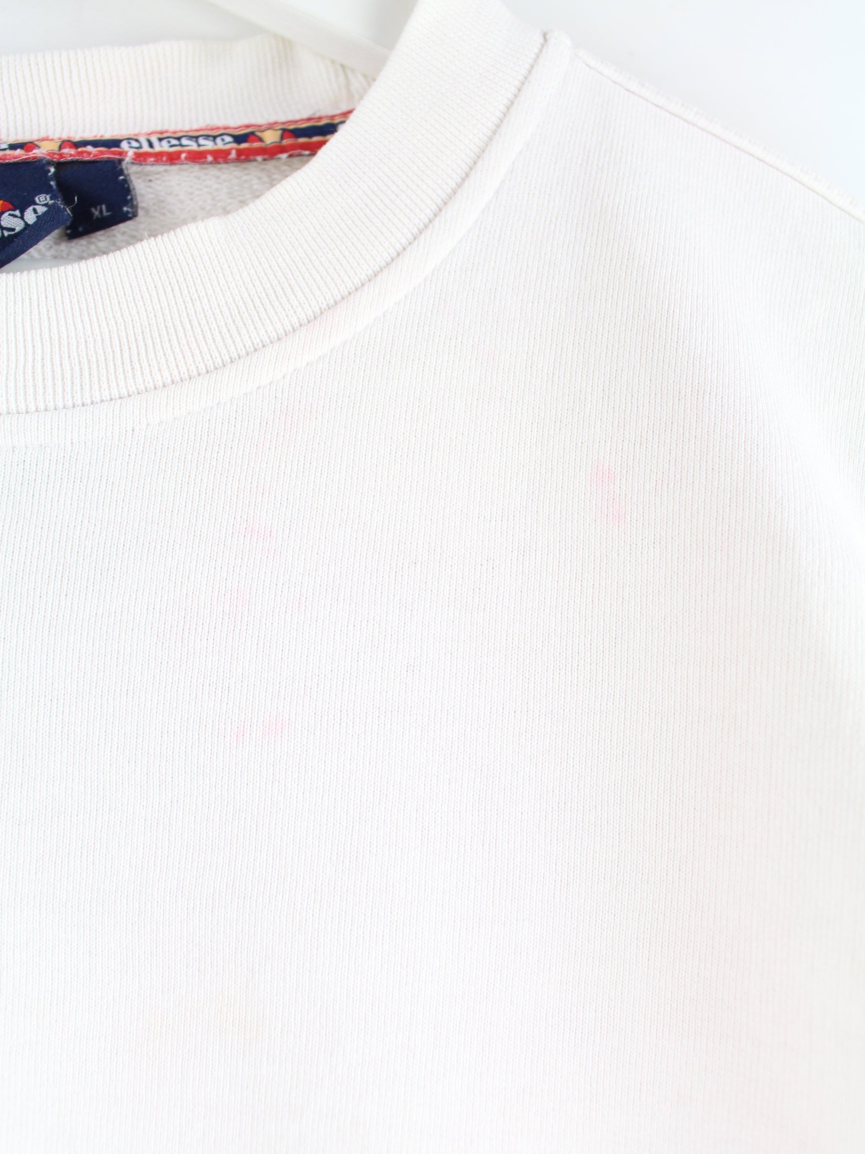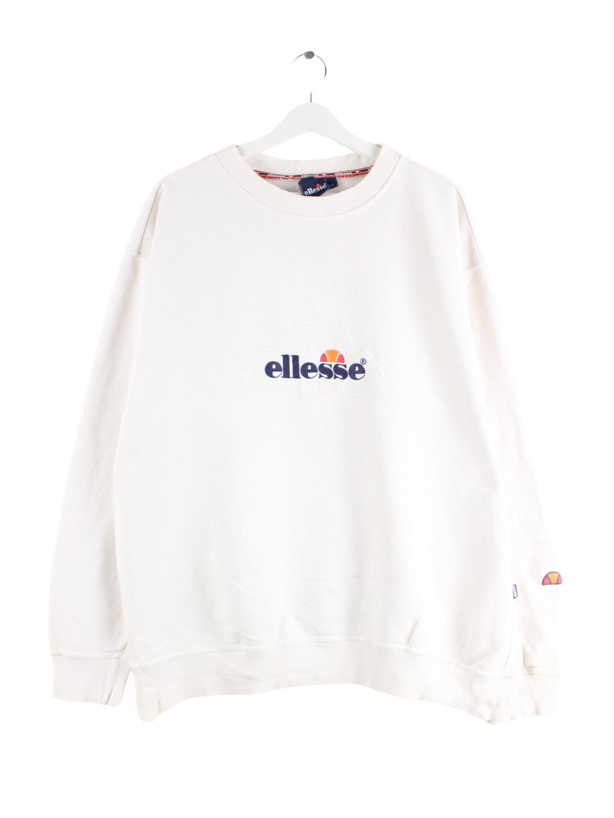 Sweater des Labels Ellesse mit gestickten Motiven in Größe XL aus Anfang der 2000'er. Er ist aus einer Baumwollmischung produziert und in Weiß bei uns vorrätig.