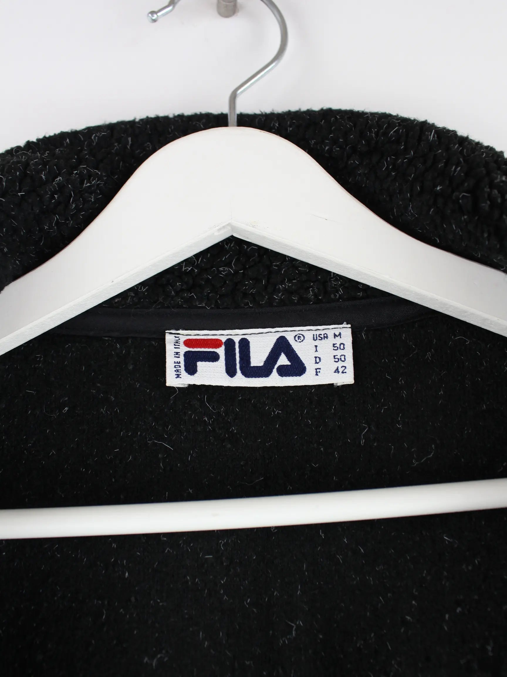 Schwarzer Sweater mit half Zip der Brand Fila aus den 90'ern in Größe M. Er ist aus kuscheligem Fleece gefertigt und in sehr gutem Zustand lieferbar.