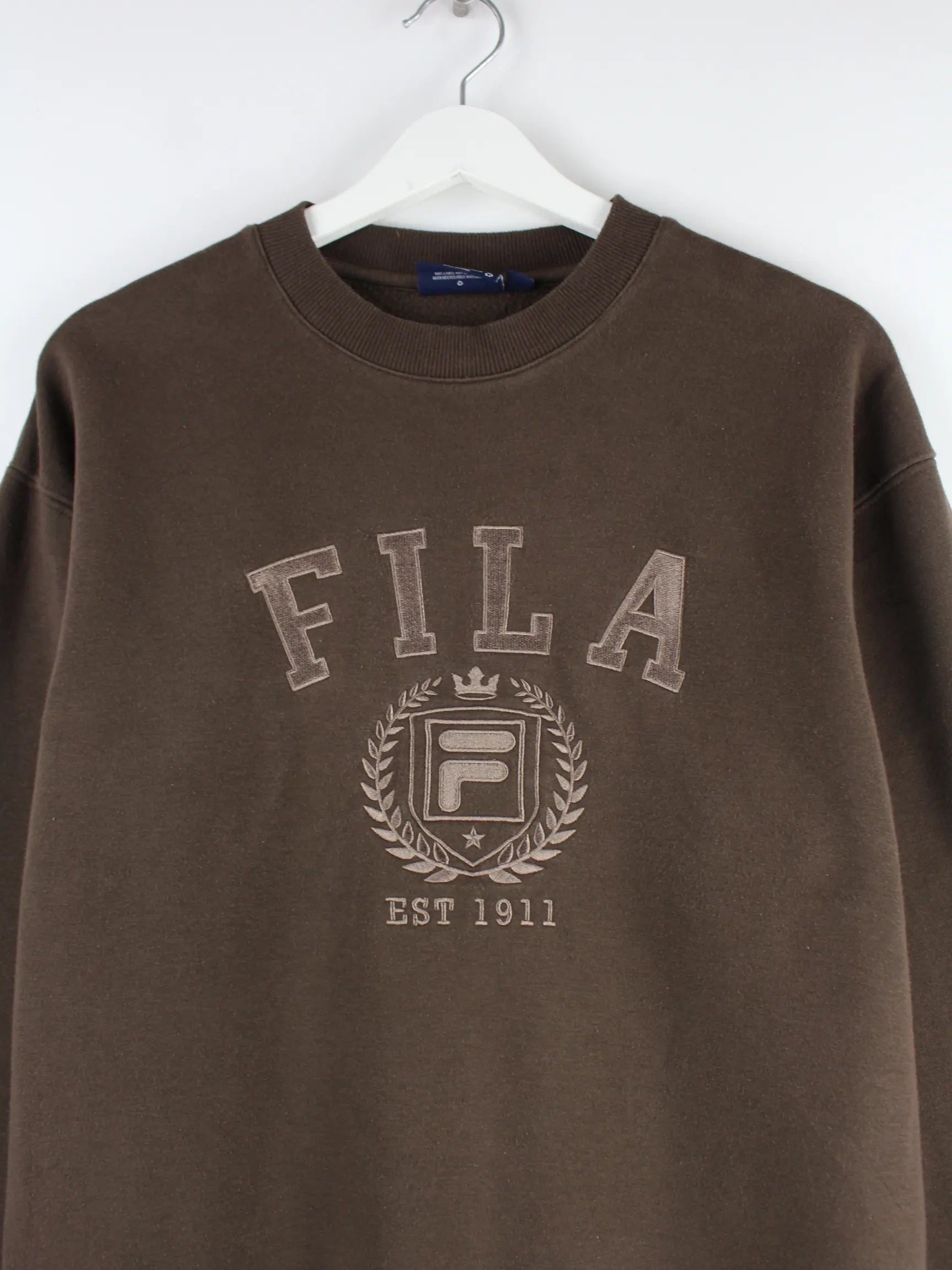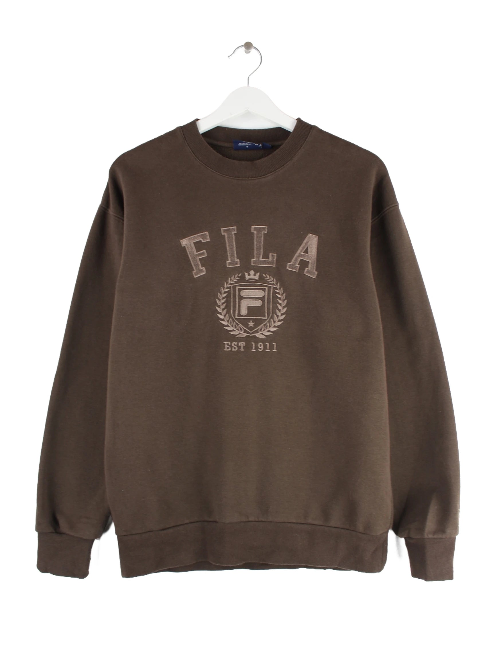 Brauner Sweater vom Label Fila in Größe S. Er ist aus einer Baumwollmischung angefertigt und in sehr gutem Zustand auf Lager.