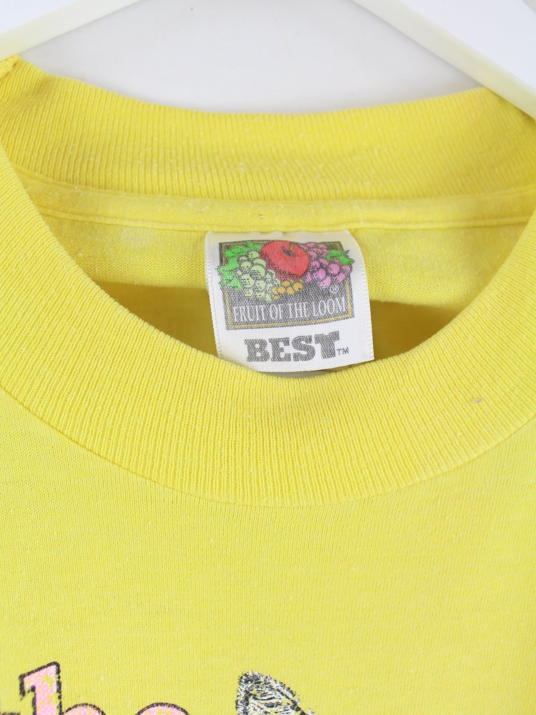 T-Shirt vom Label Fruit of the Loom in Größe XL aus den 80'ern. Es ist aus Baumwolle hergestellt und in Gelb bei uns zu bekommen. Mit schönem Cat Print.