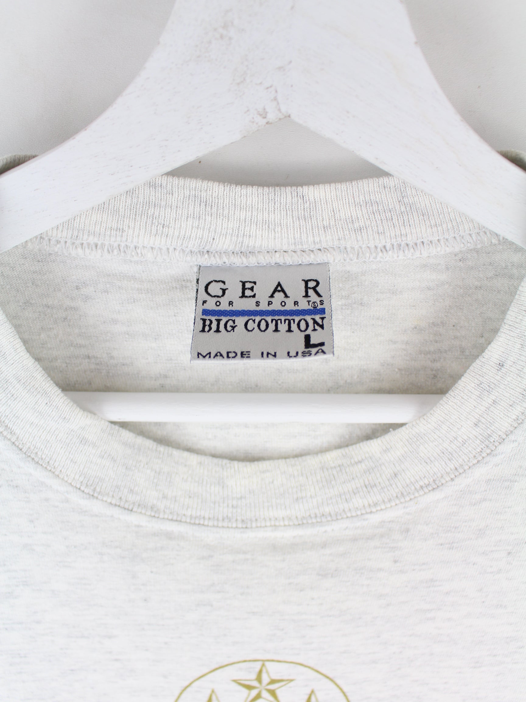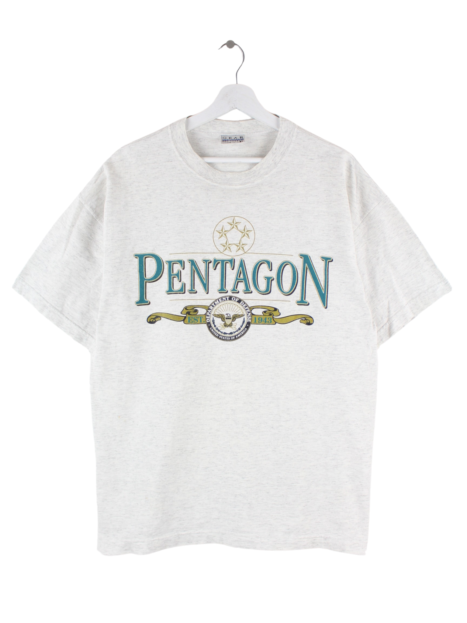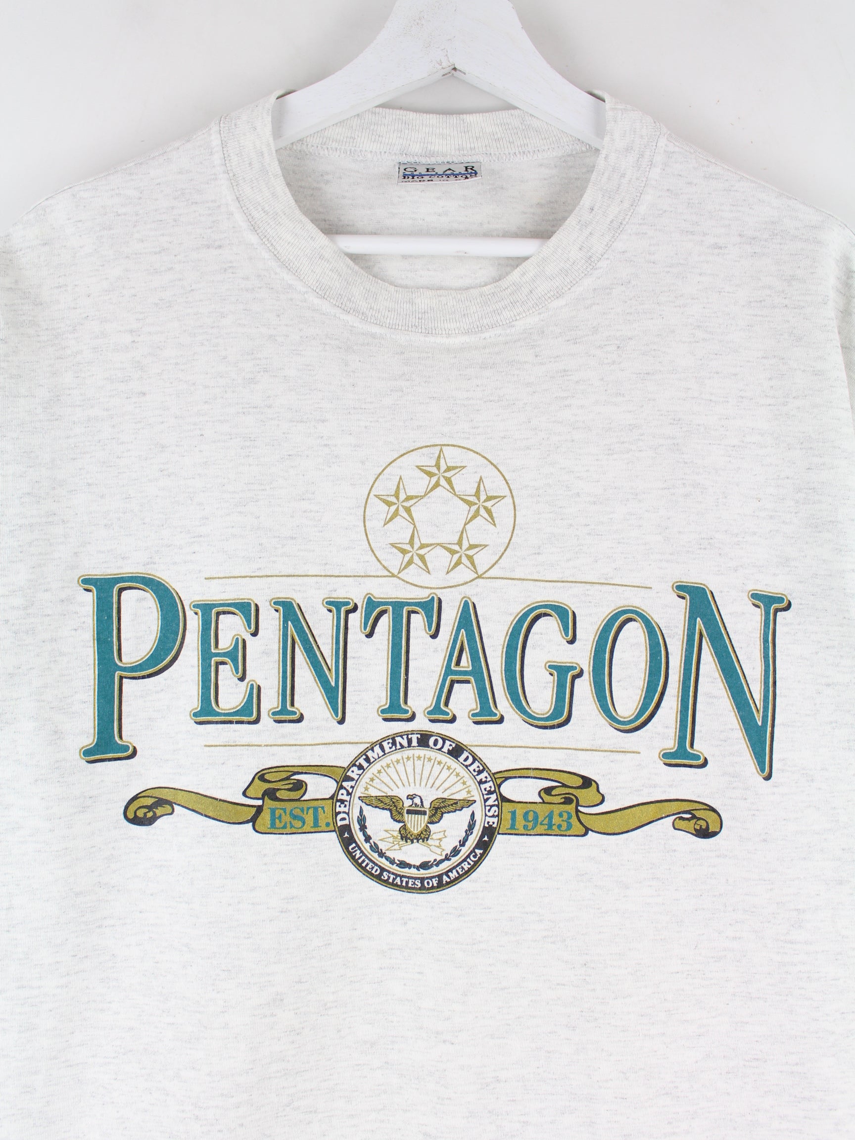 T-Shirt des Labels Gear for Sports in Größe L aus den 90'ern. Es ist aus Baumwolle angefertigt und in Grau auf Lager. Mit schickem Pentagon Print.