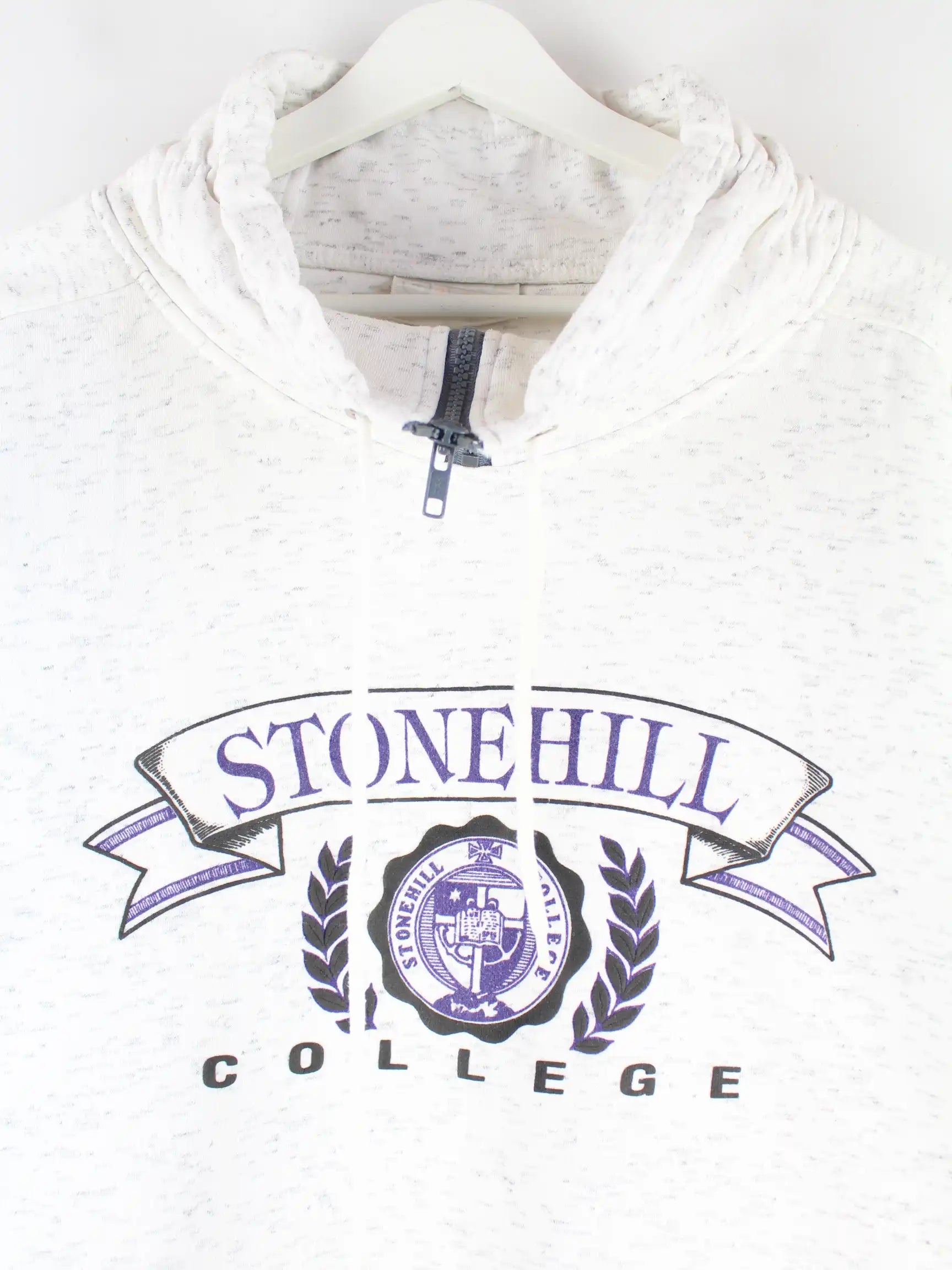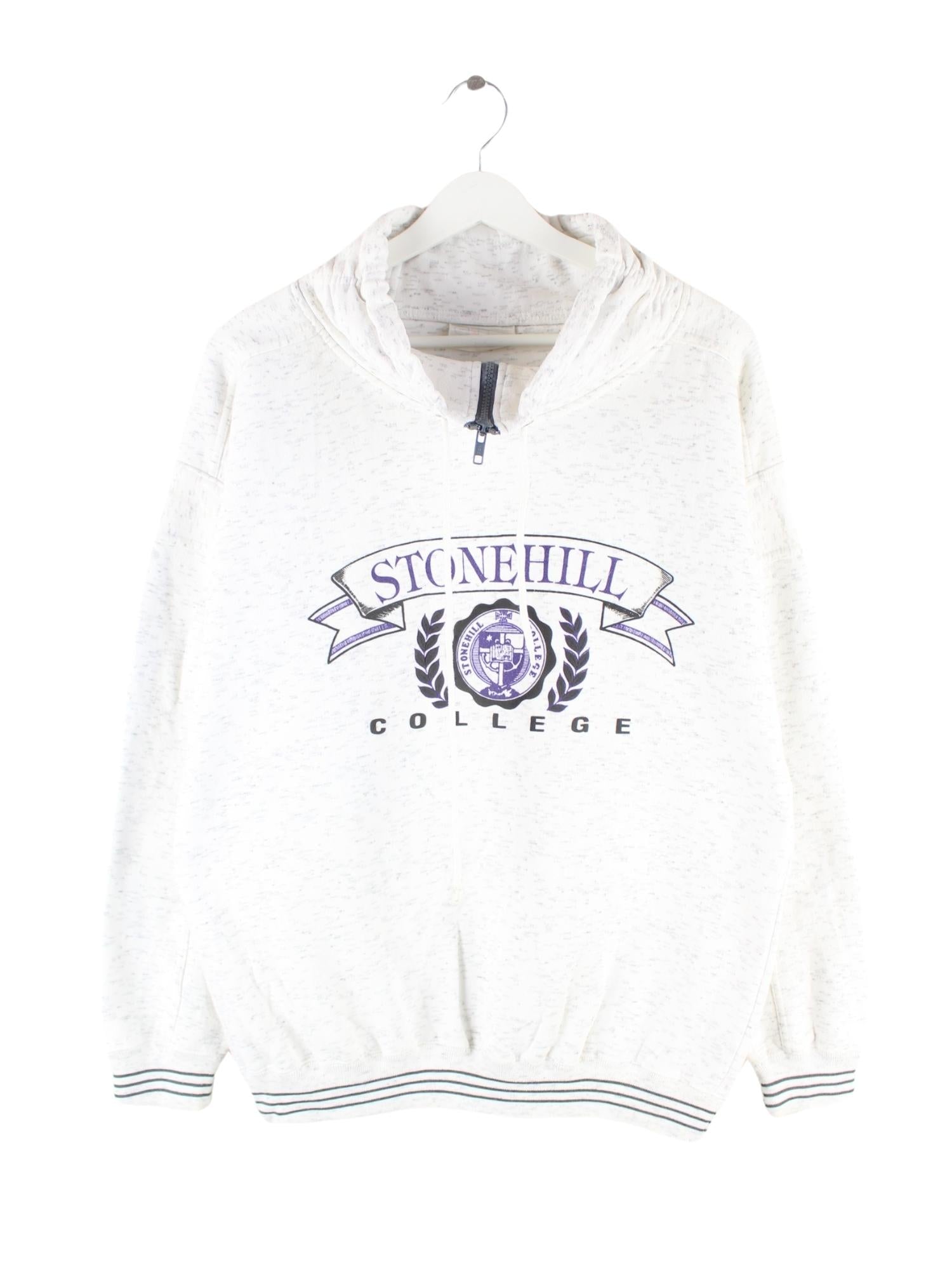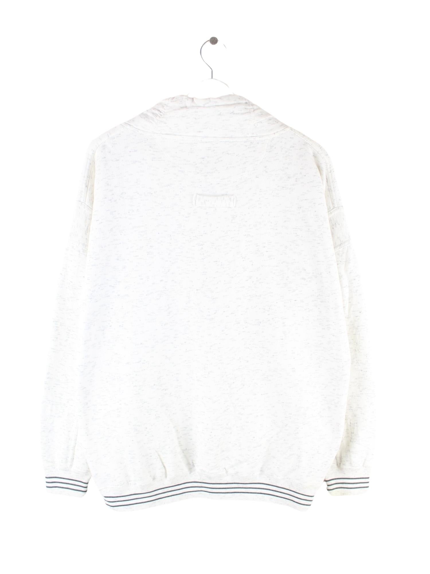 Sweater der Marke Genus mit kurzem Reißverschluß in Größe L aus den 90'ern. Er ist aus einer Baumwollmischung hergestellt und in Grau lieferbar. Mit schickem Stonehill Print.