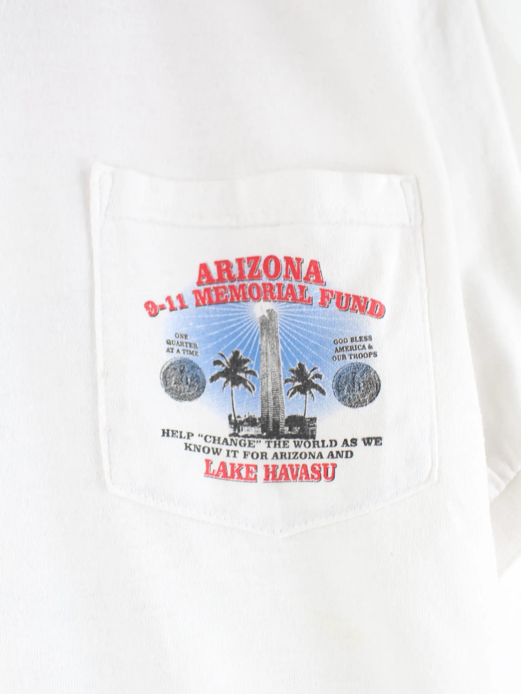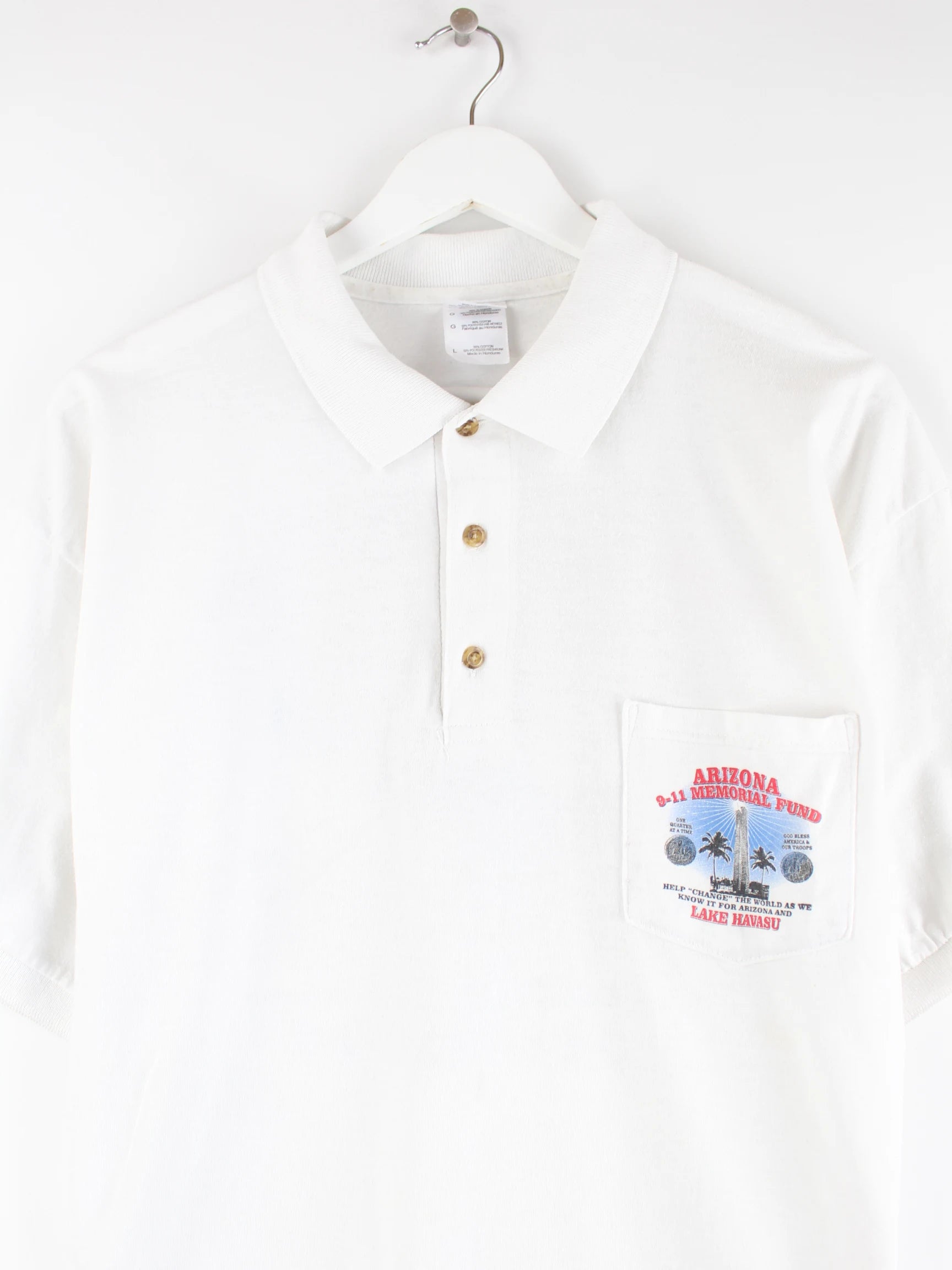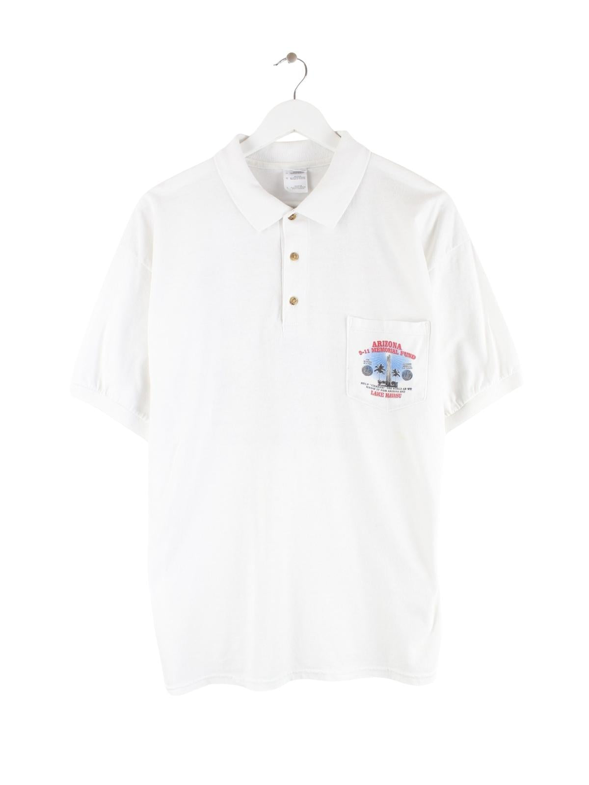 Poloshirt aus dem Hause Gildan in Größe L. Es ist aus Baumwolle hergestellt und in Weiß im Angebot. Mit tollem 9/11 Print.